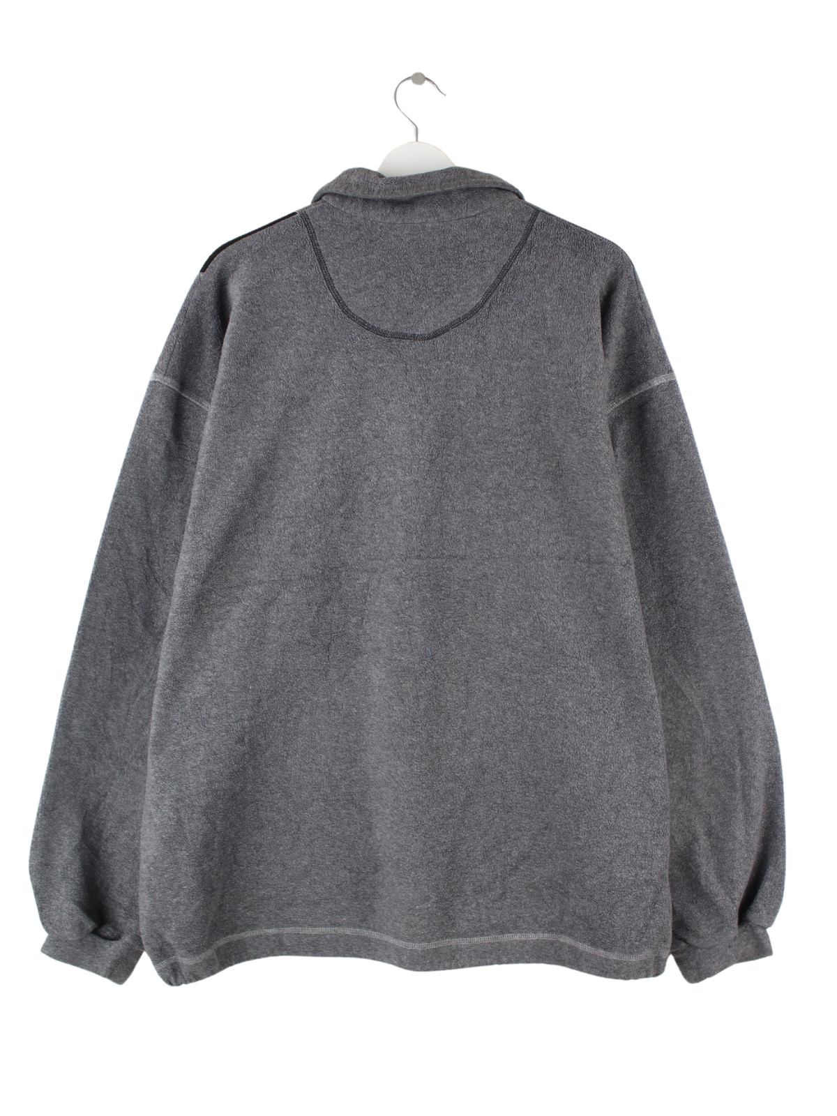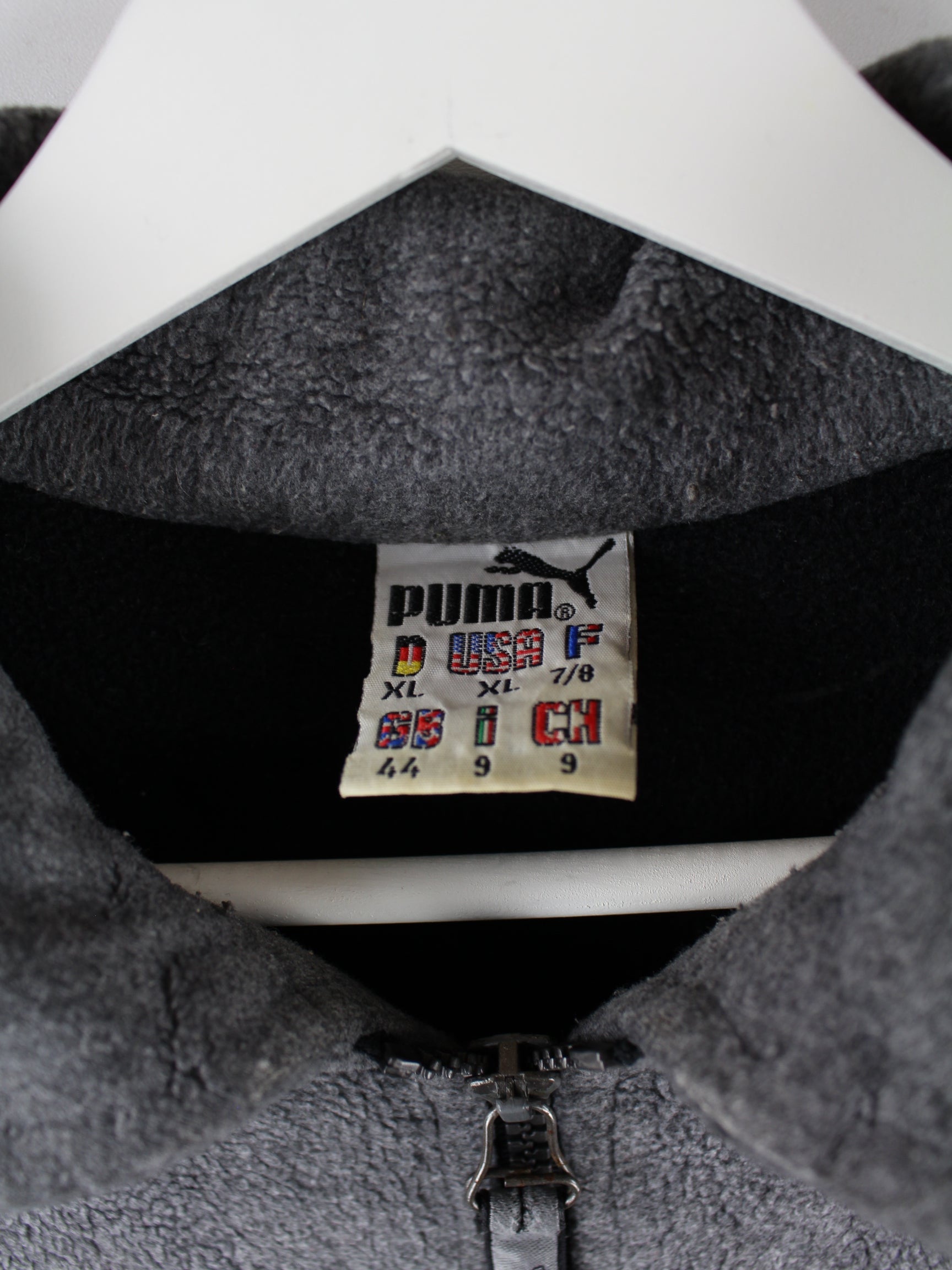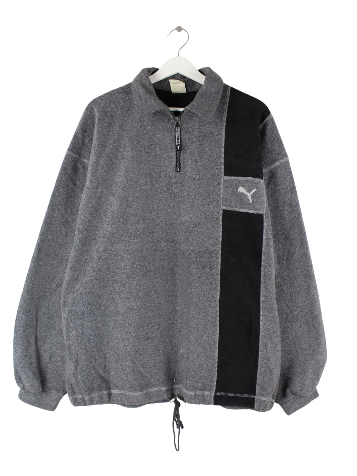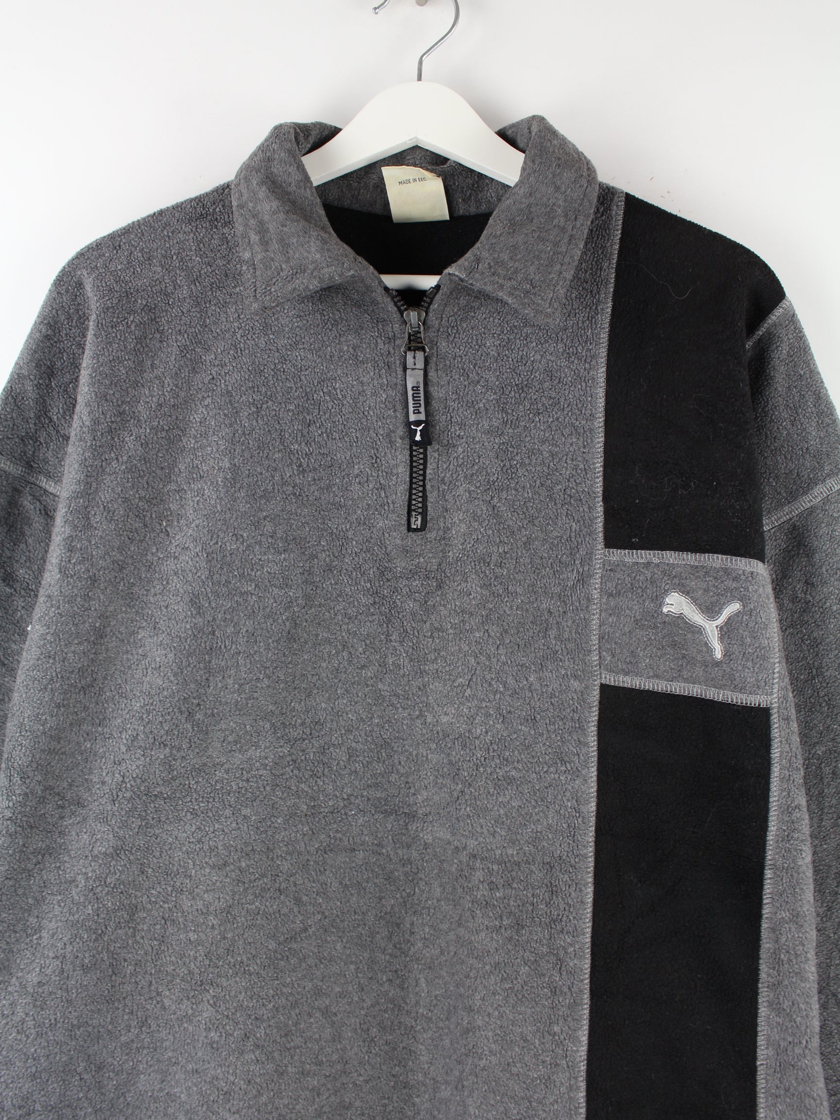 Grauer Sweater mit halbem Reißverschluß vom Brand Puma aus den 80'ern in Größe XL. Er ist aus behaglichem Fleece gemacht und in gutem Zustand in Stock.