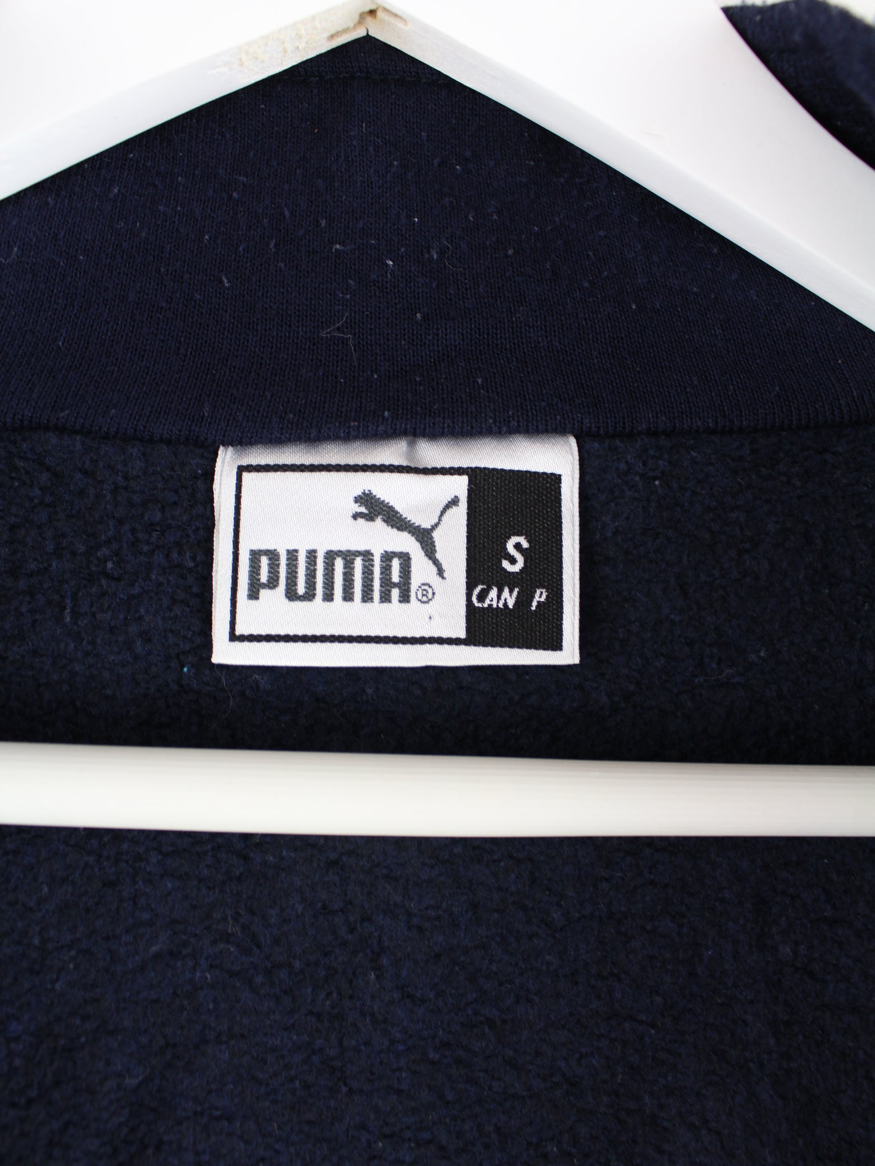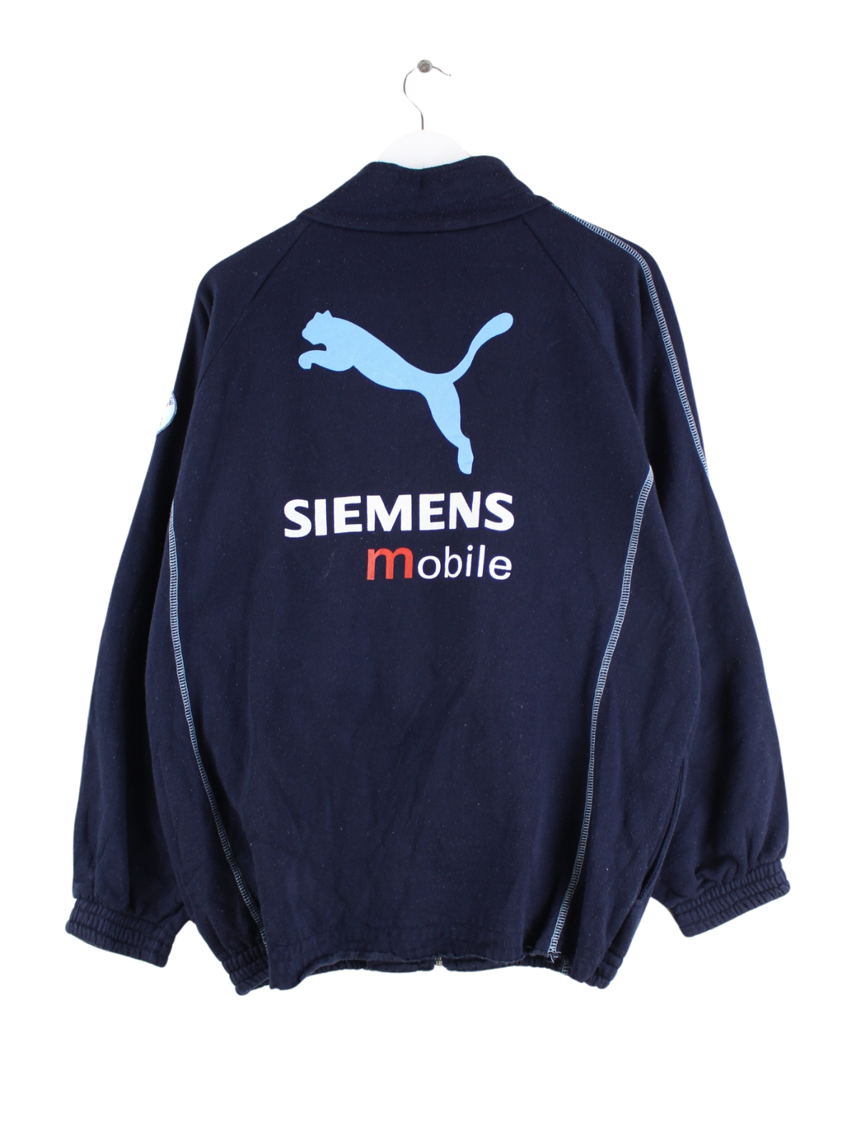 Trainingsjacke des Labels Puma in Größe M aus Anfang der 2000'er. Sie ist aus Synthetik gemacht und in Blau bei uns zu bekommen.