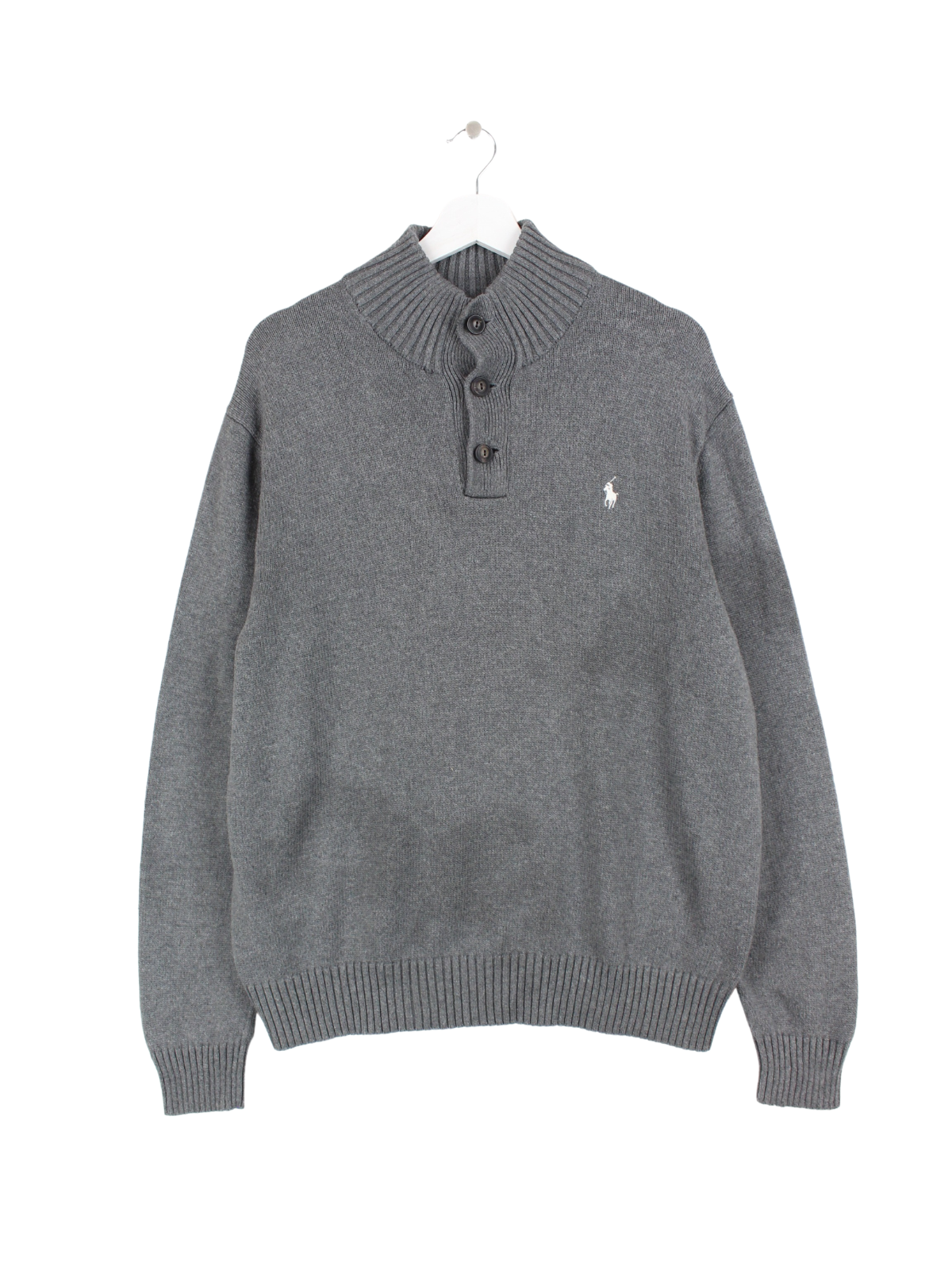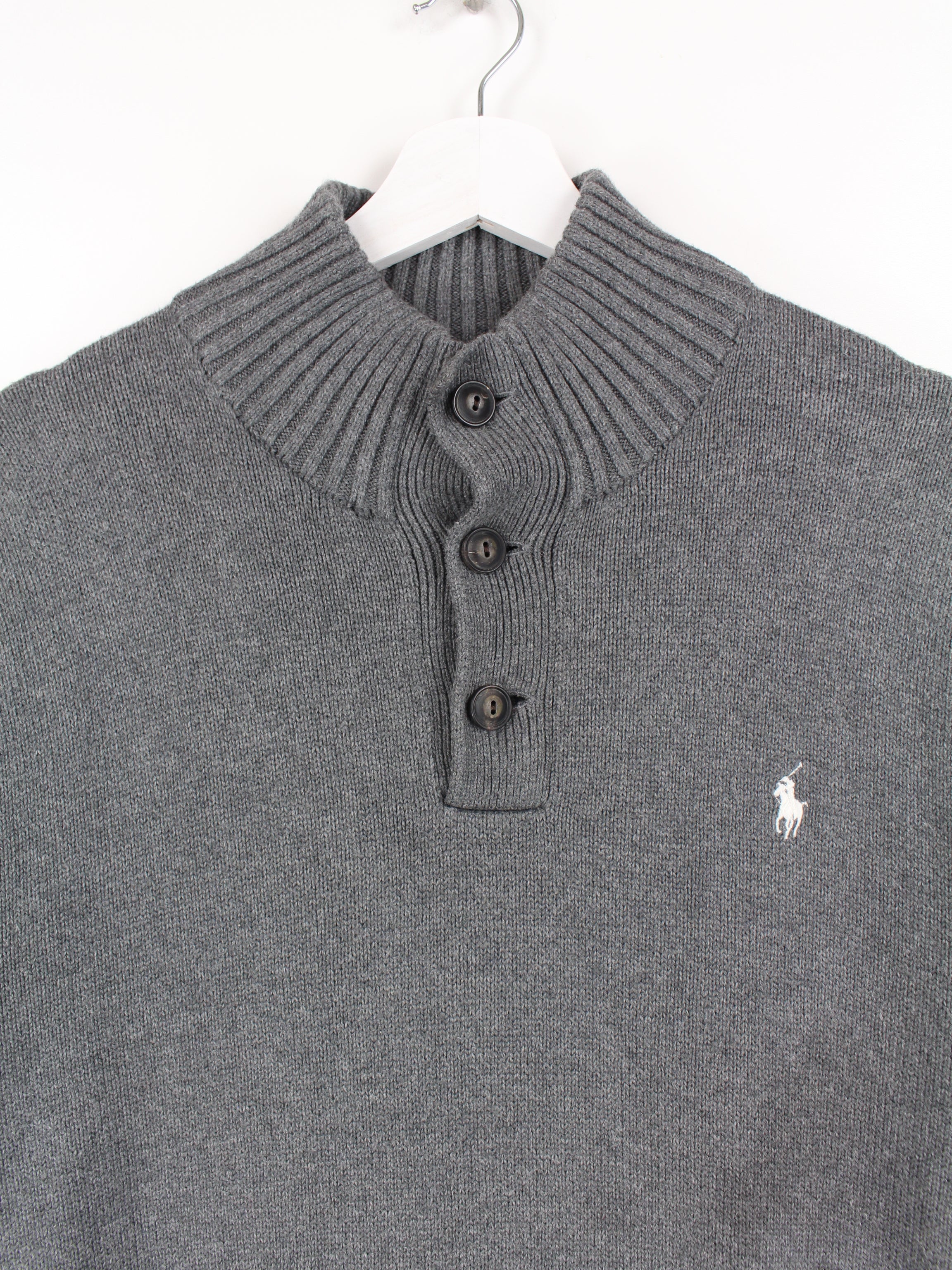Pull gris en maille boutonnée de la marque Ralph Lauren.