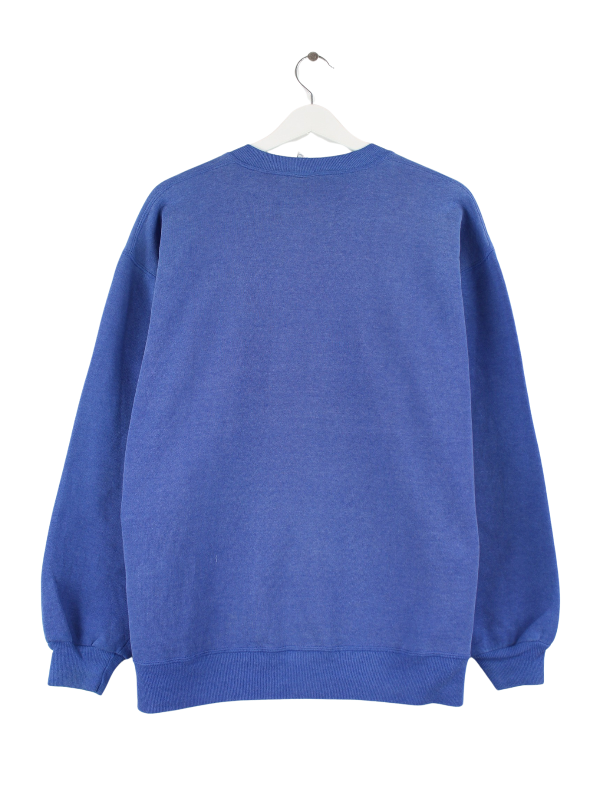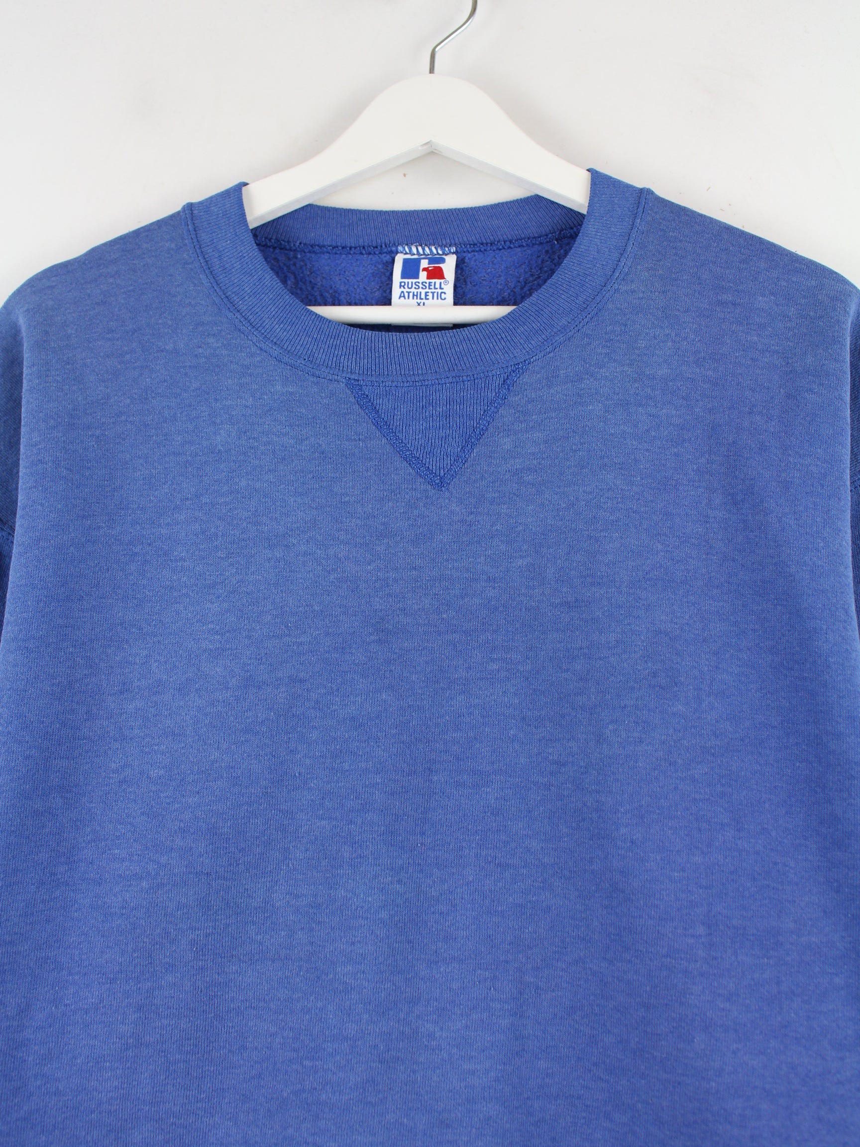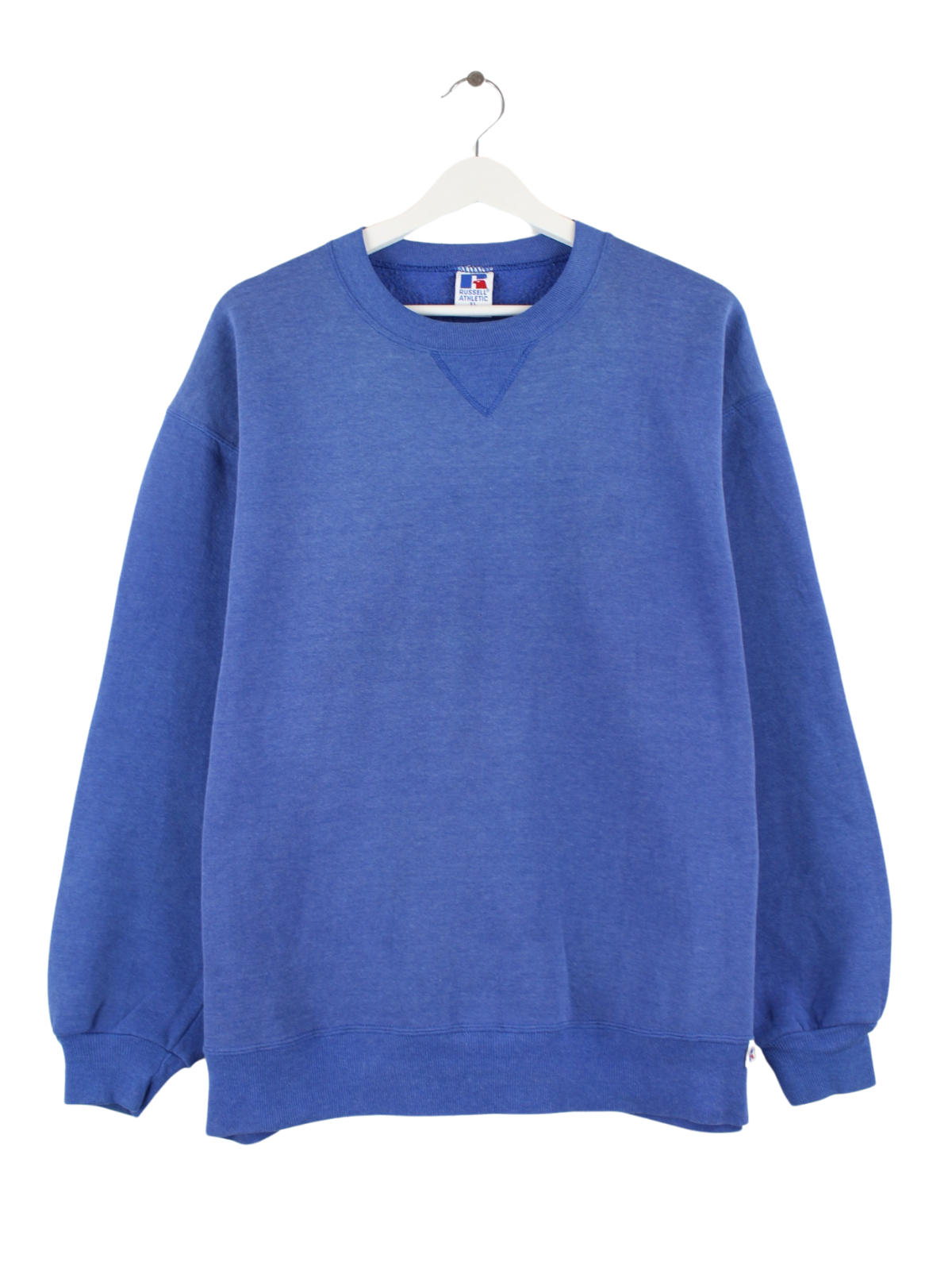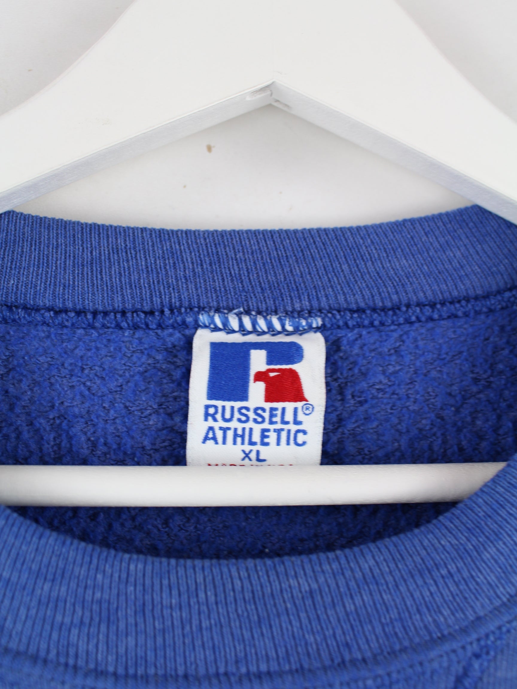 Sweater aus dem Hause Russell Athletic in Größe XL. Er ist aus einer Baumwollmischung gefertigt und in Blau in Stock.