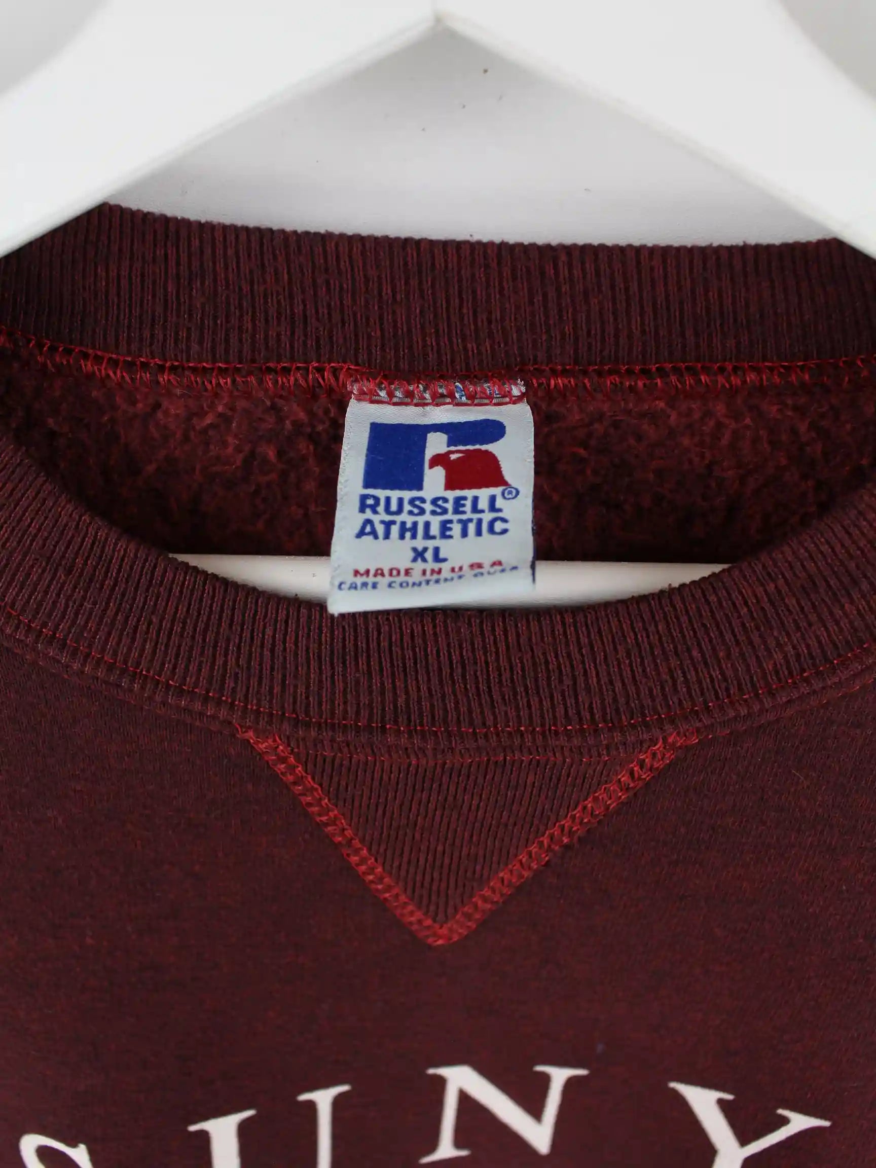Roter Sweater der Marke Russell Athletic aus den 90'ern in Größe XL. Er ist aus einer Baumwollmischung angefertigt und in sehr gutem Zustand bei uns vorrätig. Mit tollem Plattsburgh Print.