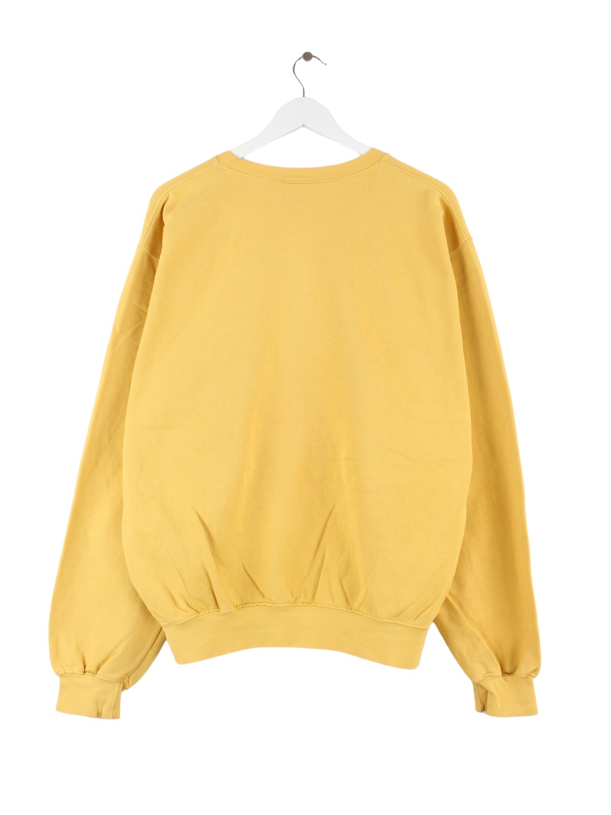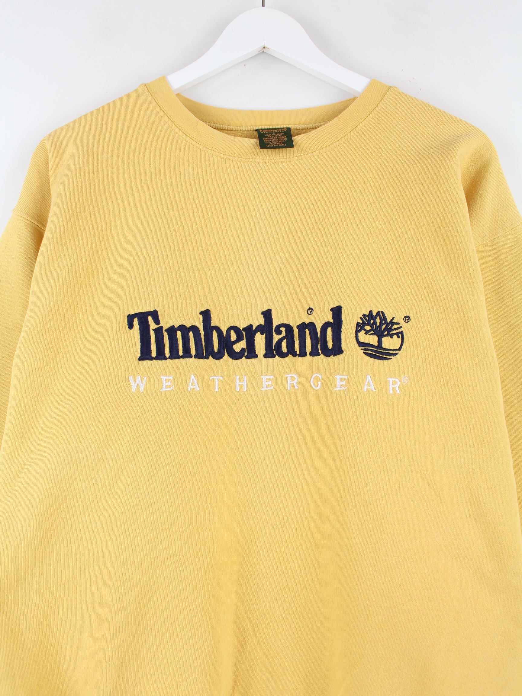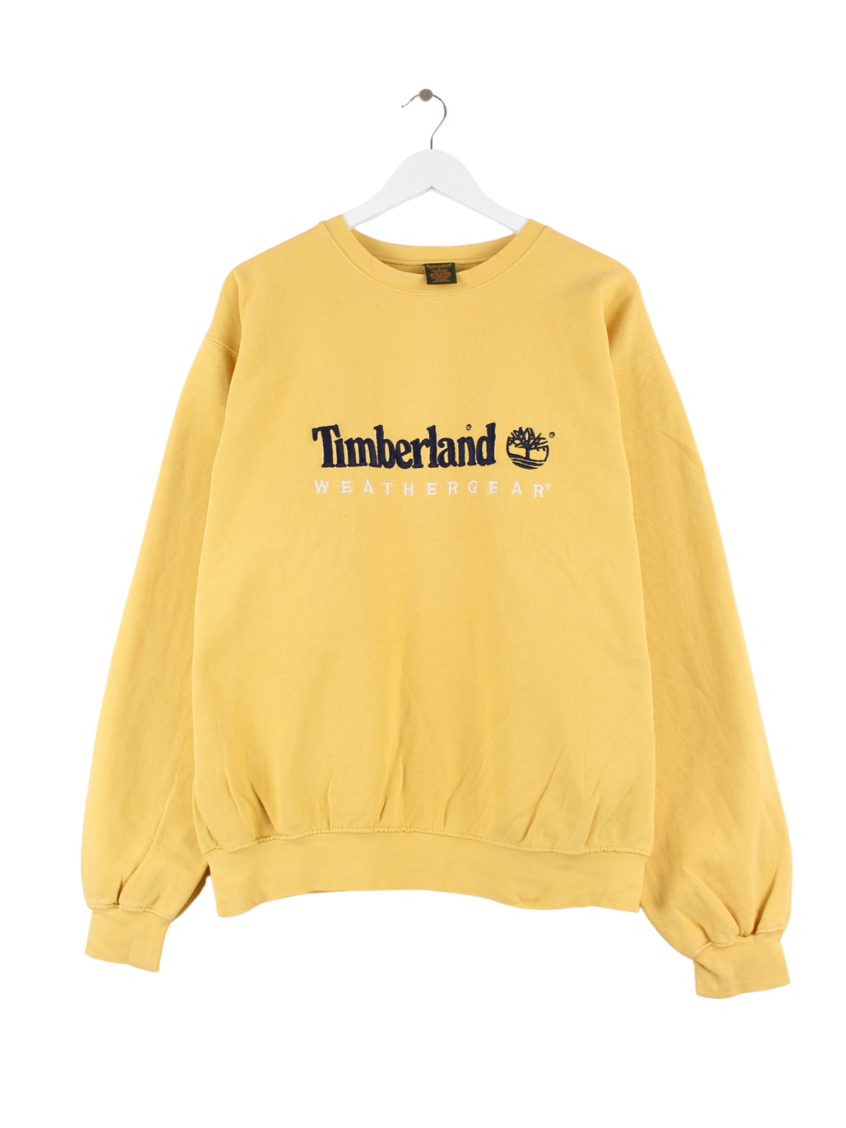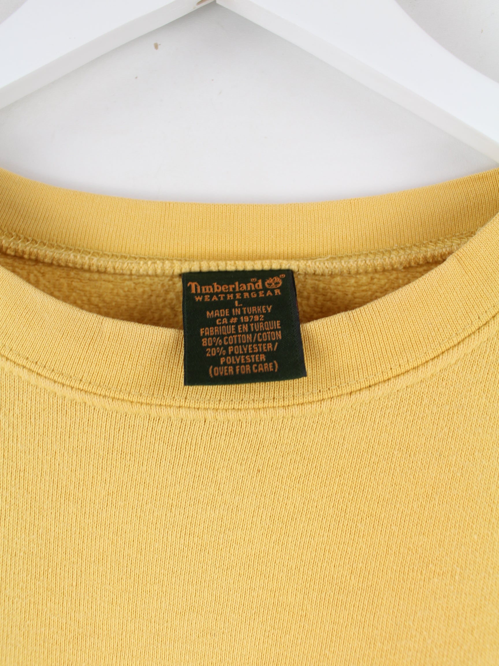 Sweater des Labels Timberland mit Stickereien in Größe L. Er ist aus einer Baumwollmischung gefertigt und in Gelb zu haben.