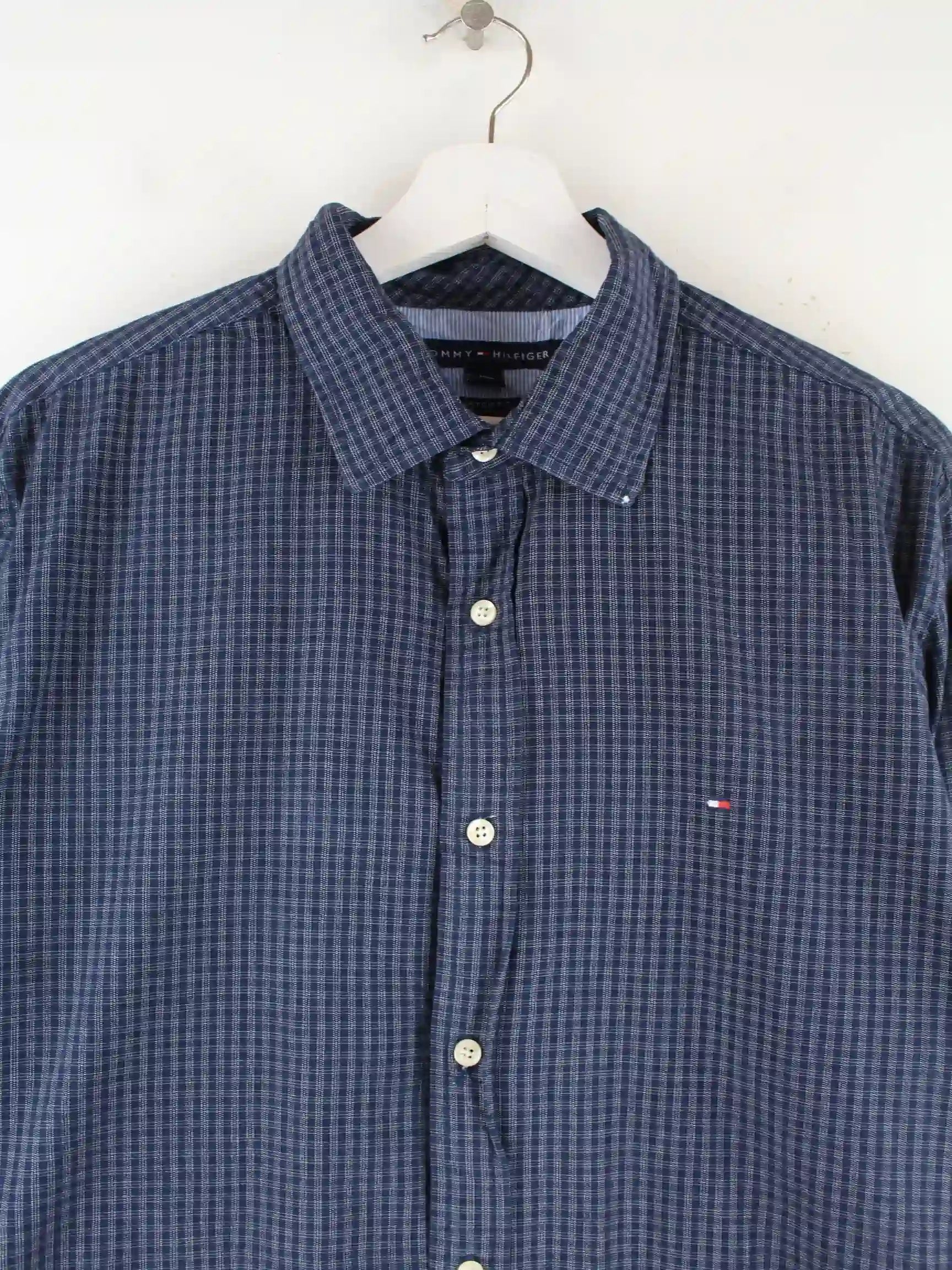 Blaues Hemd der Marke Tommy Hilfiger in Größe M. Es ist aus Baumwolle hergestellt und in sehr gutem Zustand bei uns zu bekommen.
