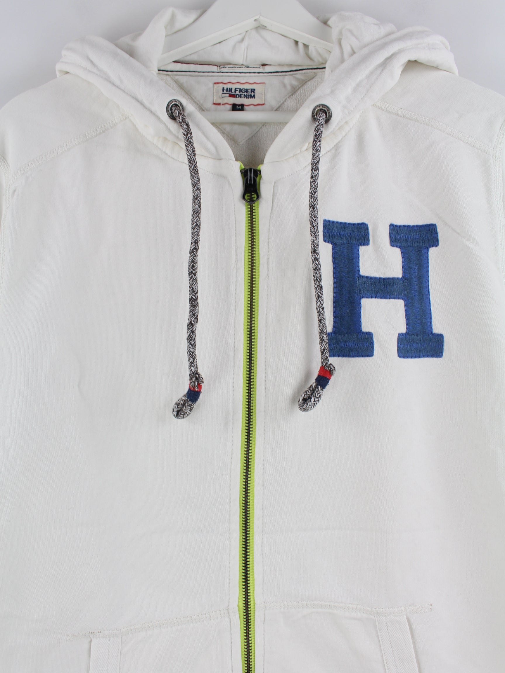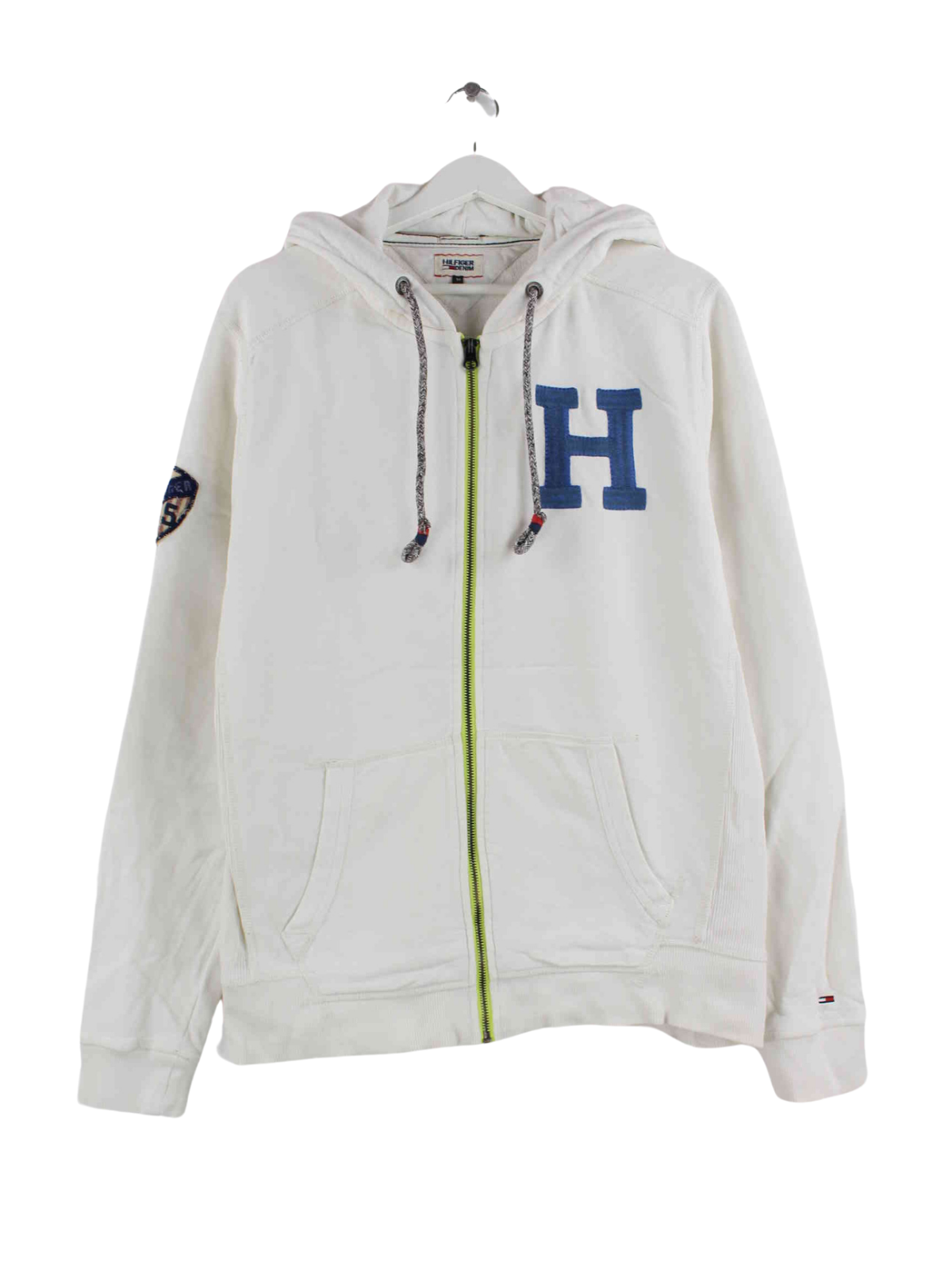 Hoodie vom Label Tommy Hilfiger mit Stick und Reißverschluß in Größe M. Er ist aus einer Baumwollmischung gefertigt und in Weiß im Angebot.