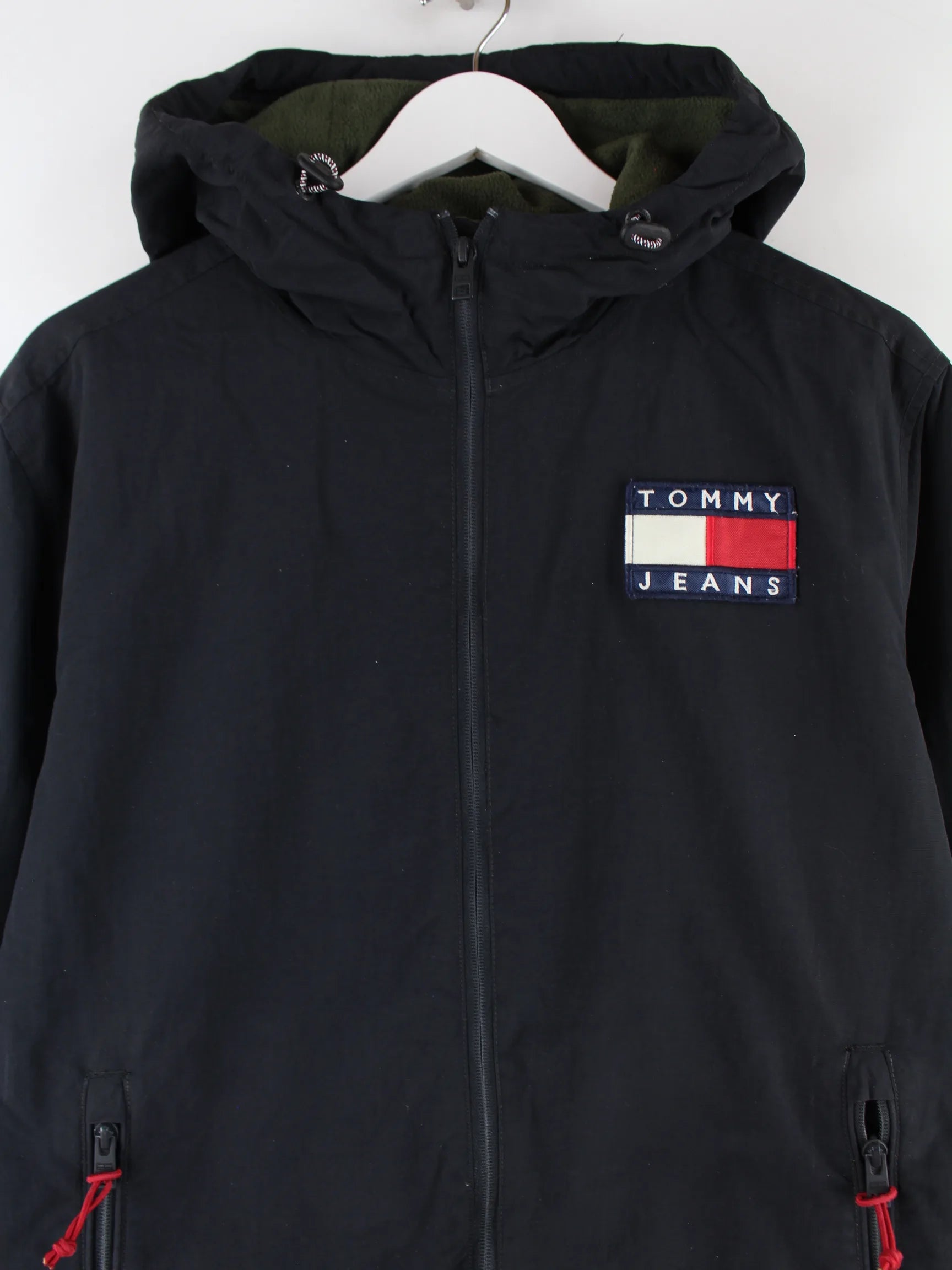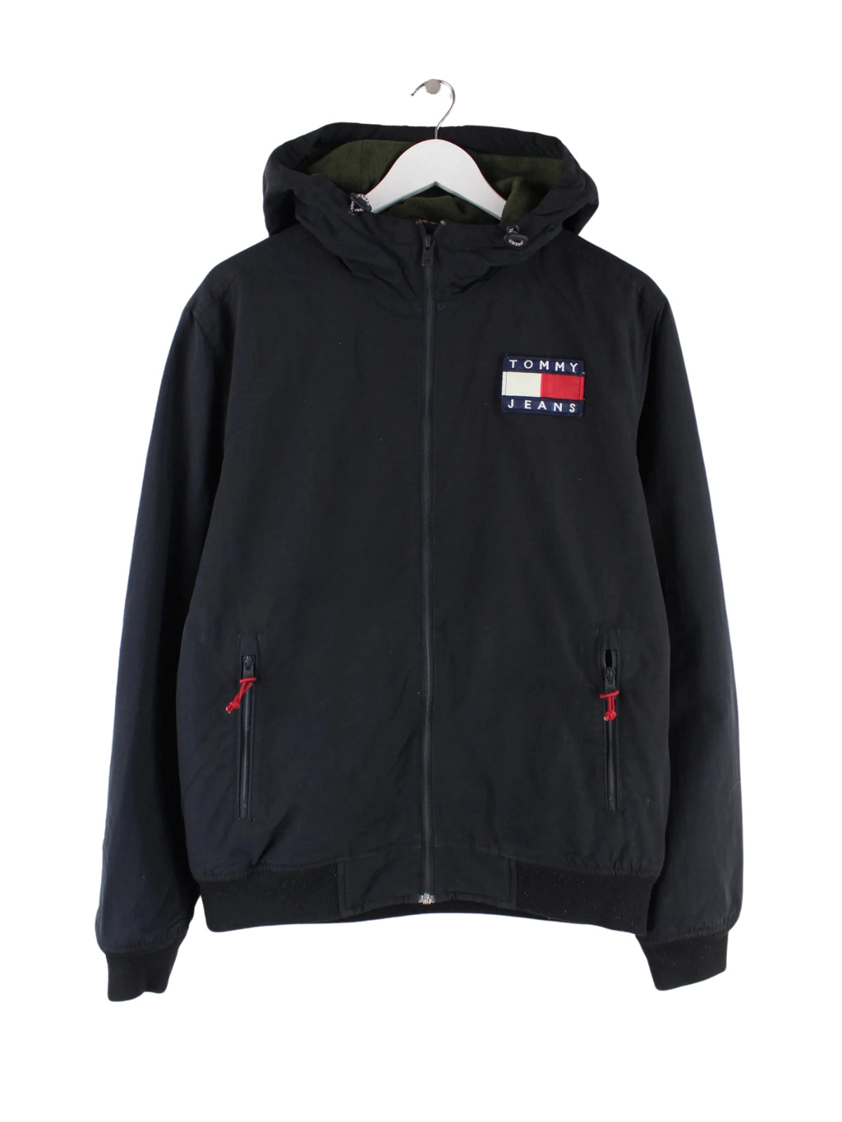 Schwarze Jacke vom Label Tommy Hilfiger in Größe M. Sie ist aus Synthetik angefertigt und in sehr gutem Zustand im Angebot.