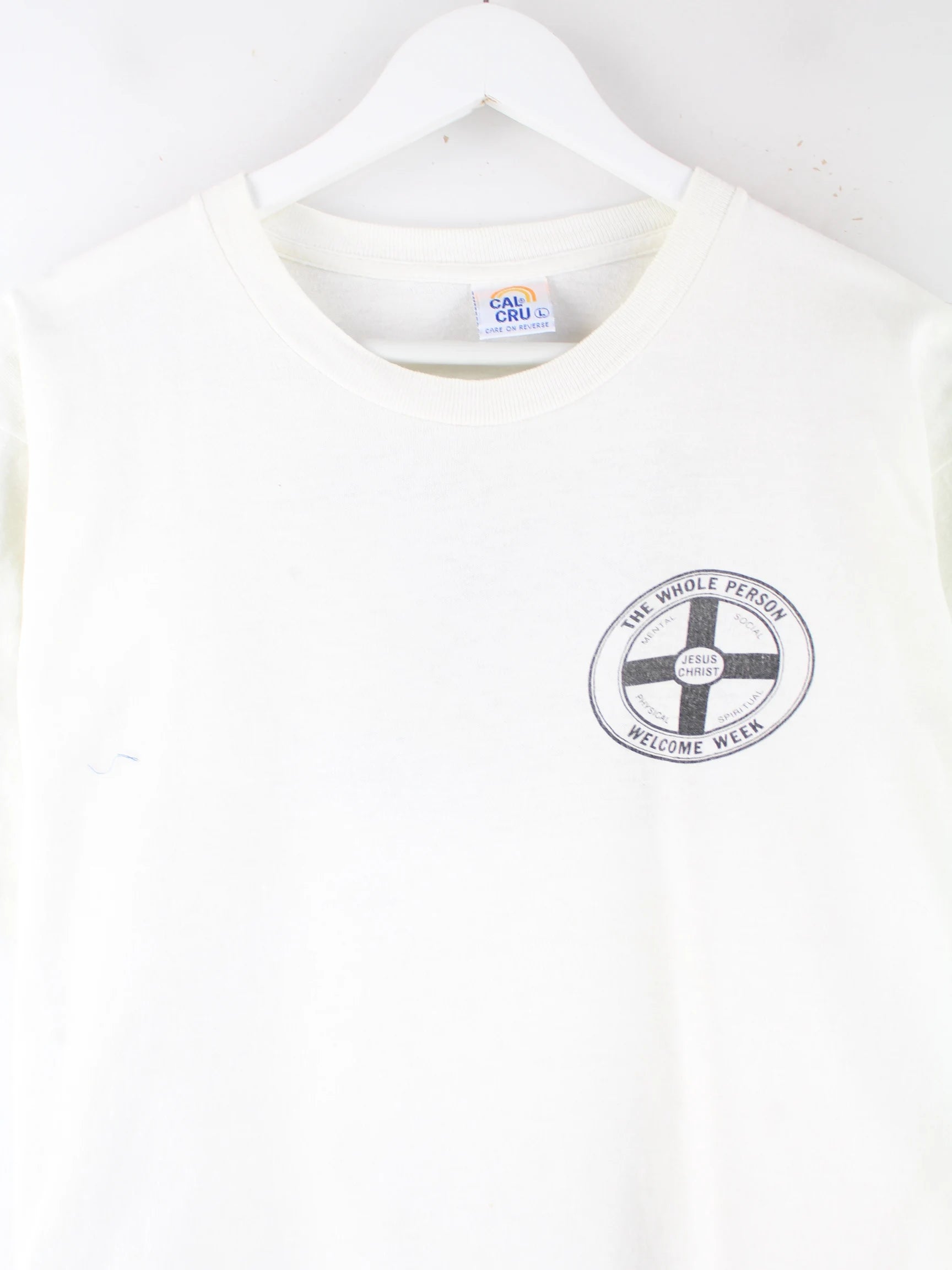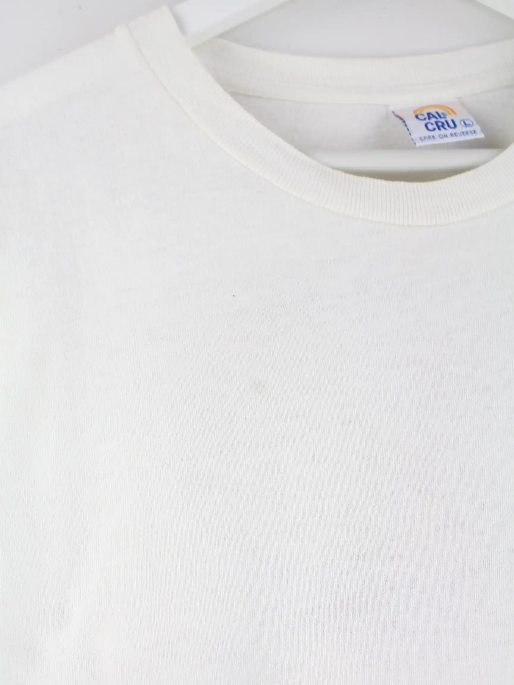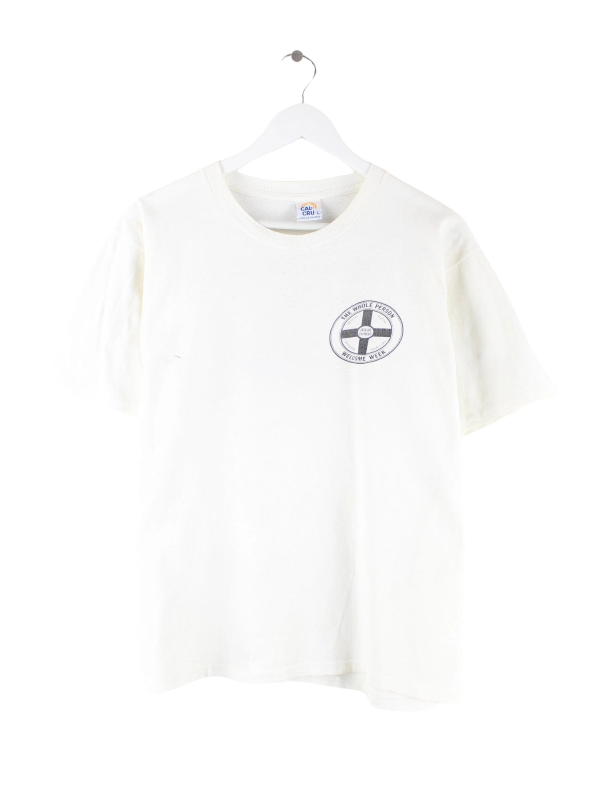 Vintage T-Shirt in Größe L. Es ist aus einer Baumwollmischung gemacht und in Weiß bei uns zu bekommen. Mit chiquem Family Print.