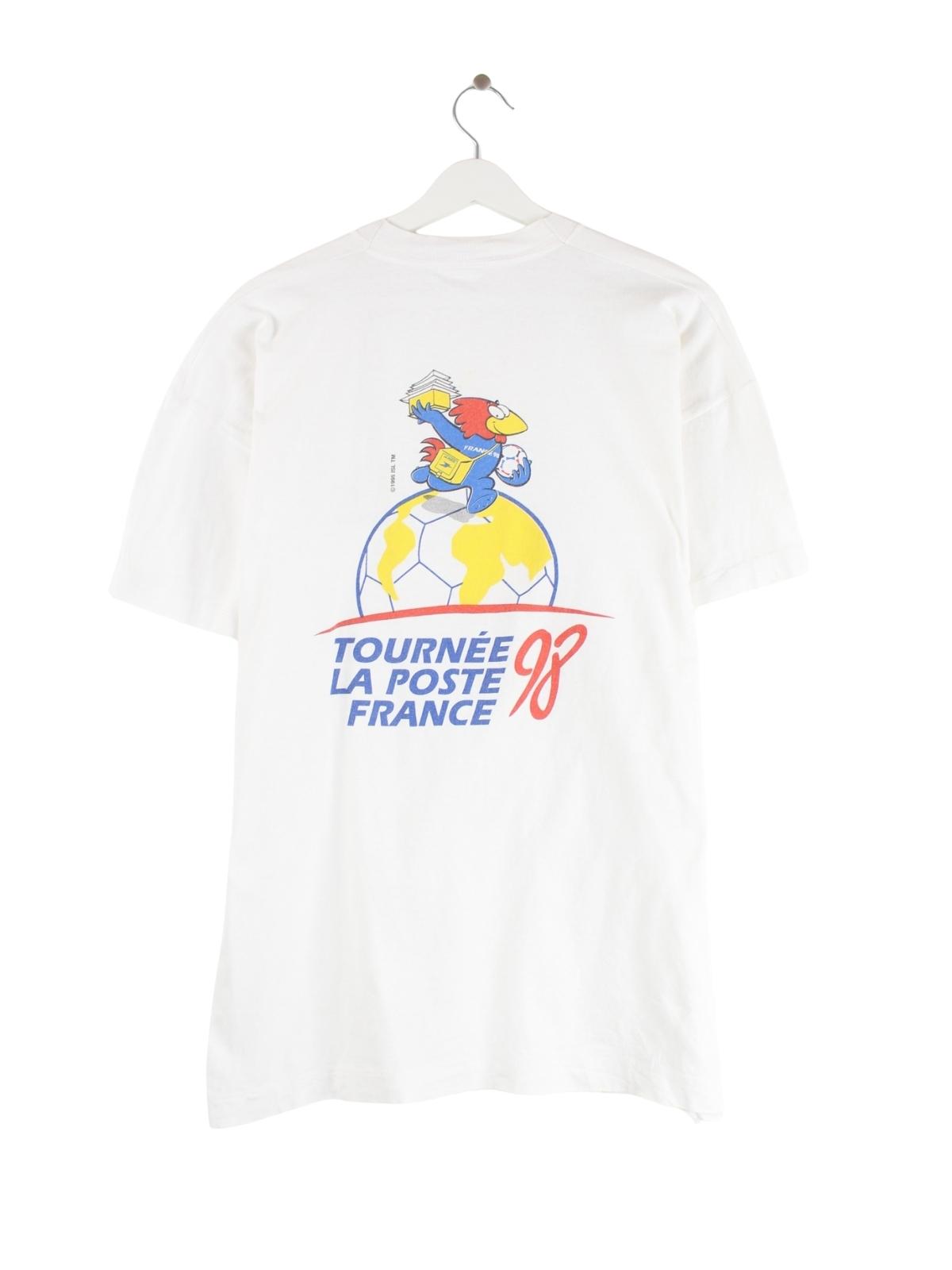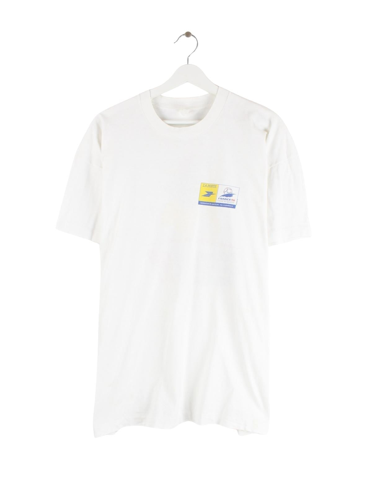 Weißes Vintage T-Shirt in Größe L. Es ist aus Baumwolle angefertigt und in gutem Zustand zu haben. Mit chiquem Tournée Print.