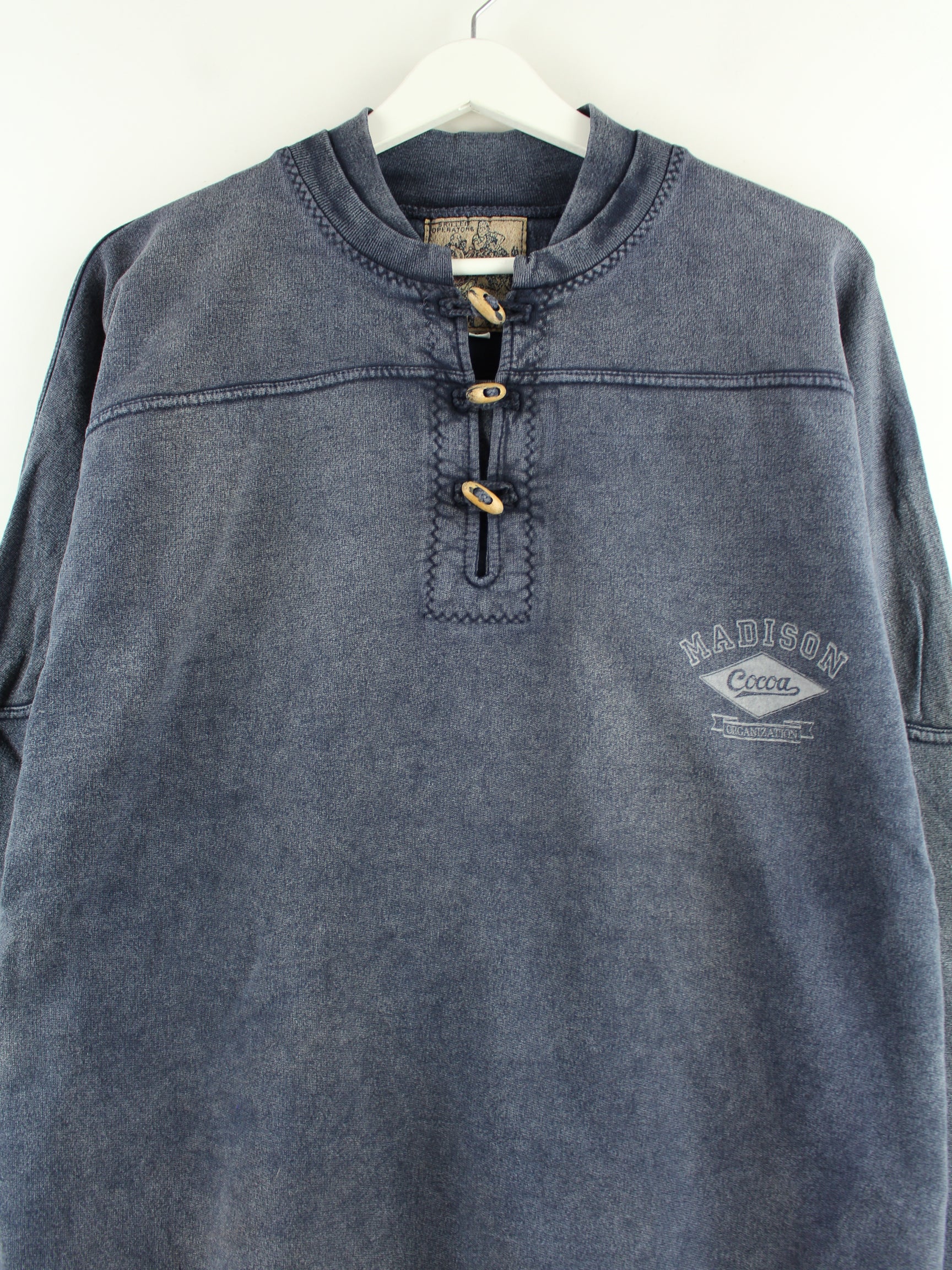 Blauer Vintage Sweater aus den 80'ern in Größe XXL. Er ist aus einer Baumwollmischung angefertigt und in sehr gutem Zustand zu bekommen. Mit chiquem Cocoa Print.