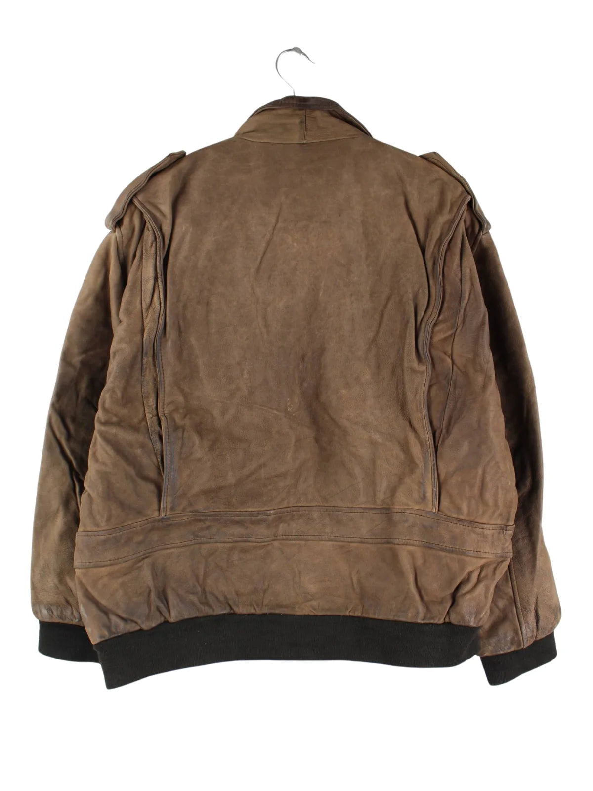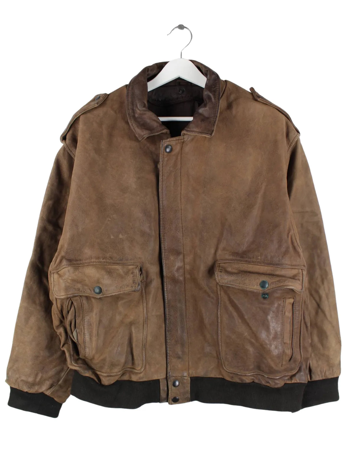 Braune Vintage Jacke aus den 80'ern in Größe XL. Sie ist aus Leder gemacht und in gutem Zustand vorrätig.
