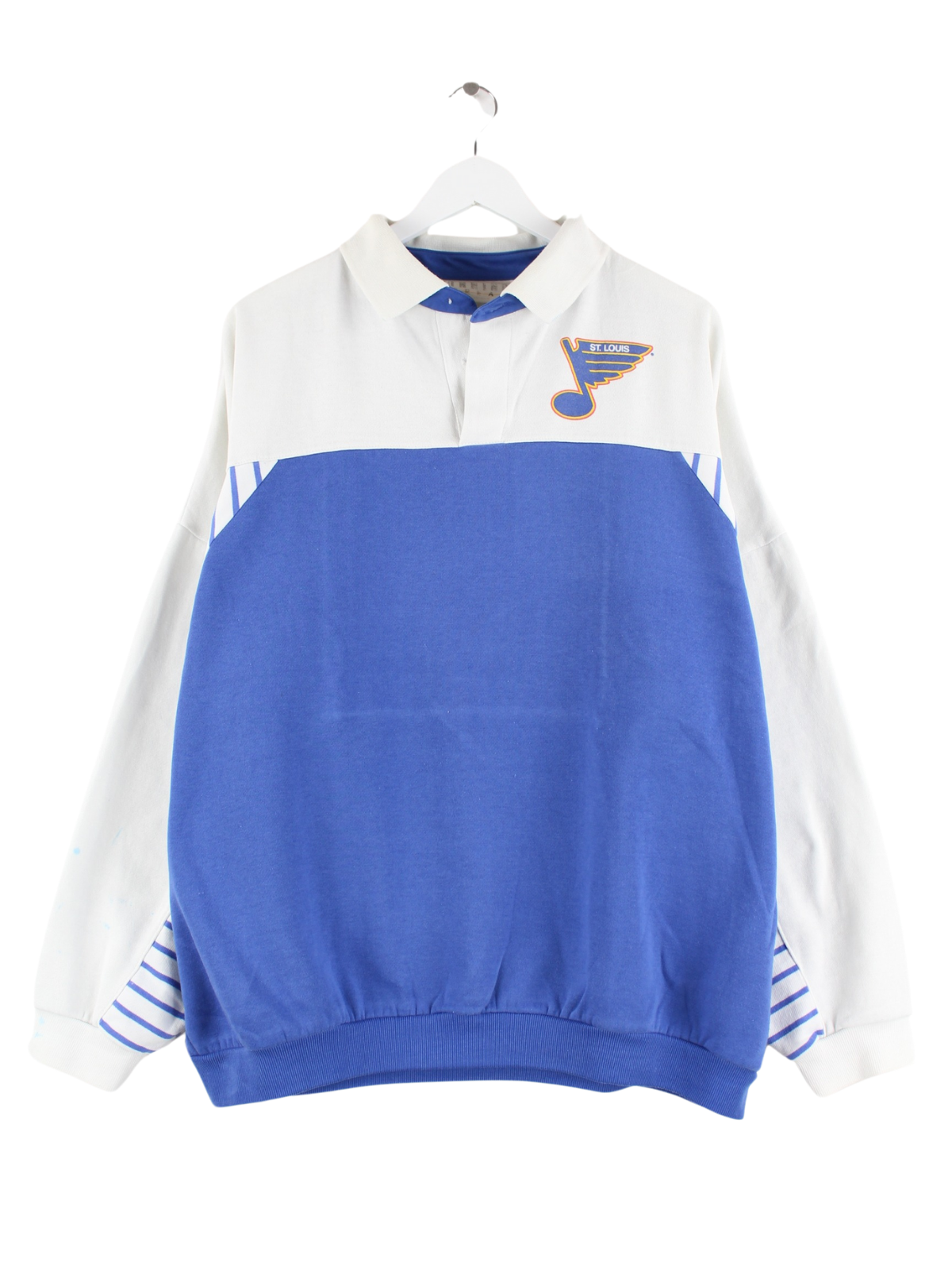Vintage Sweater in Größe XL aus den 80'ern. Er ist aus einer Baumwollmischung gefertigt und in Blau bei uns zu bekommen. Mit schickem Louis Print.