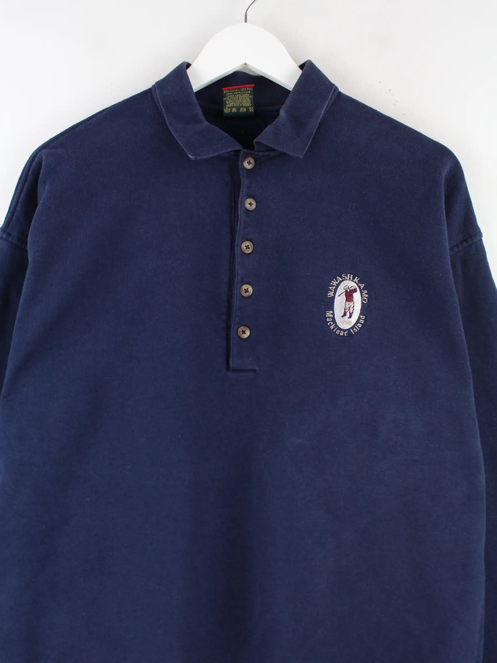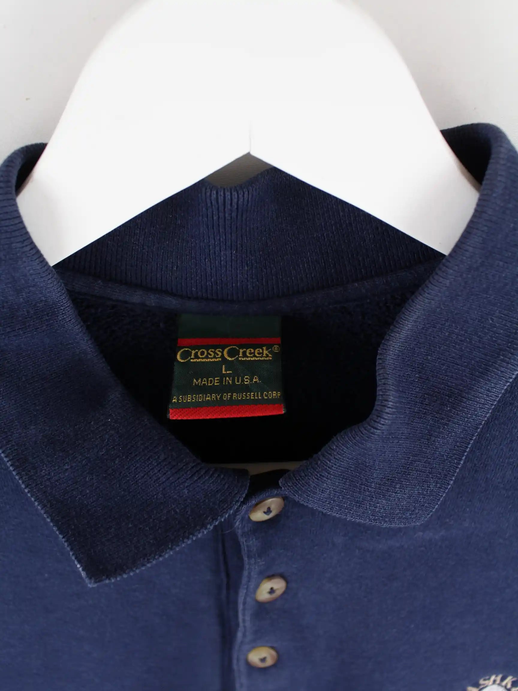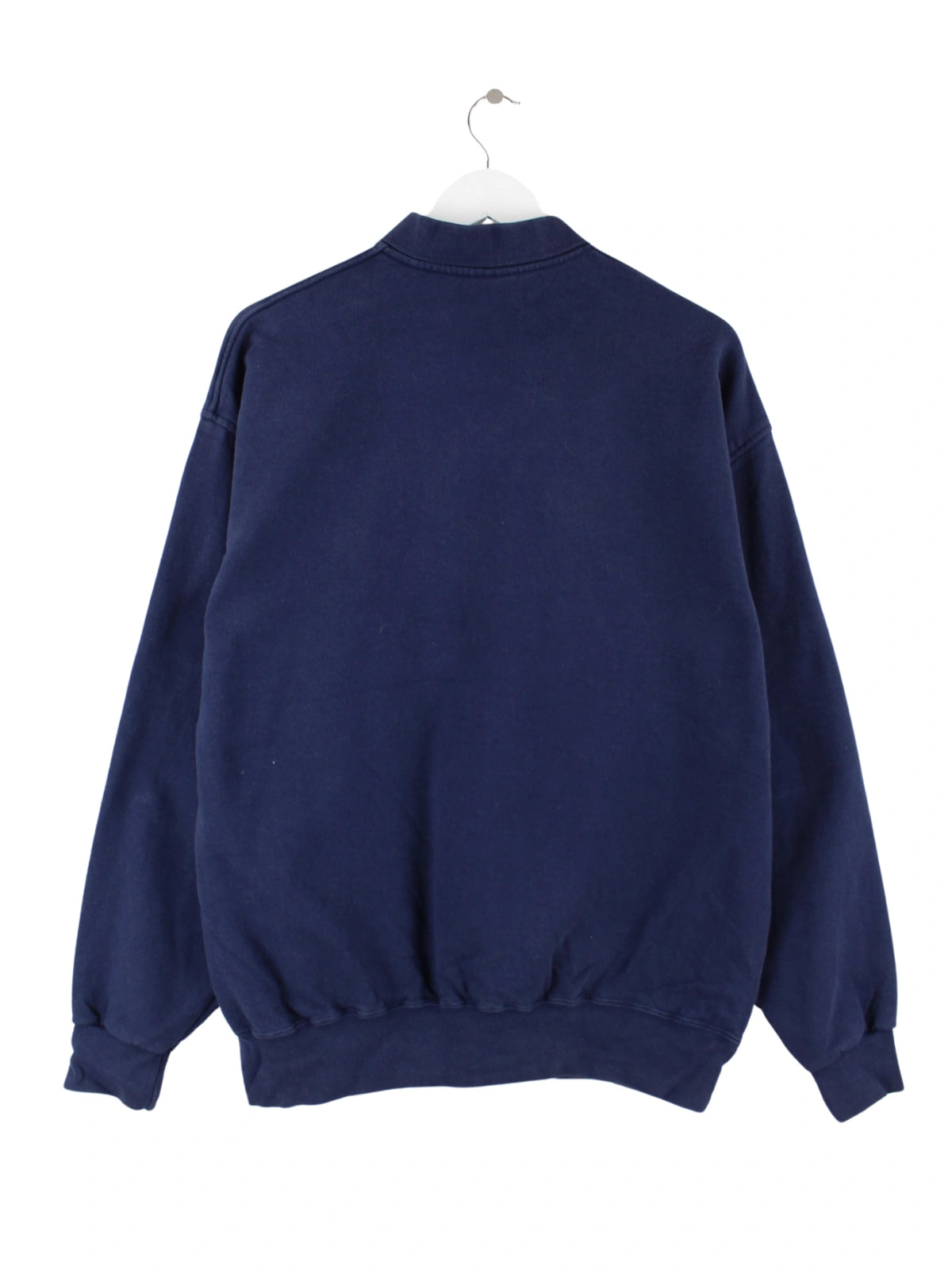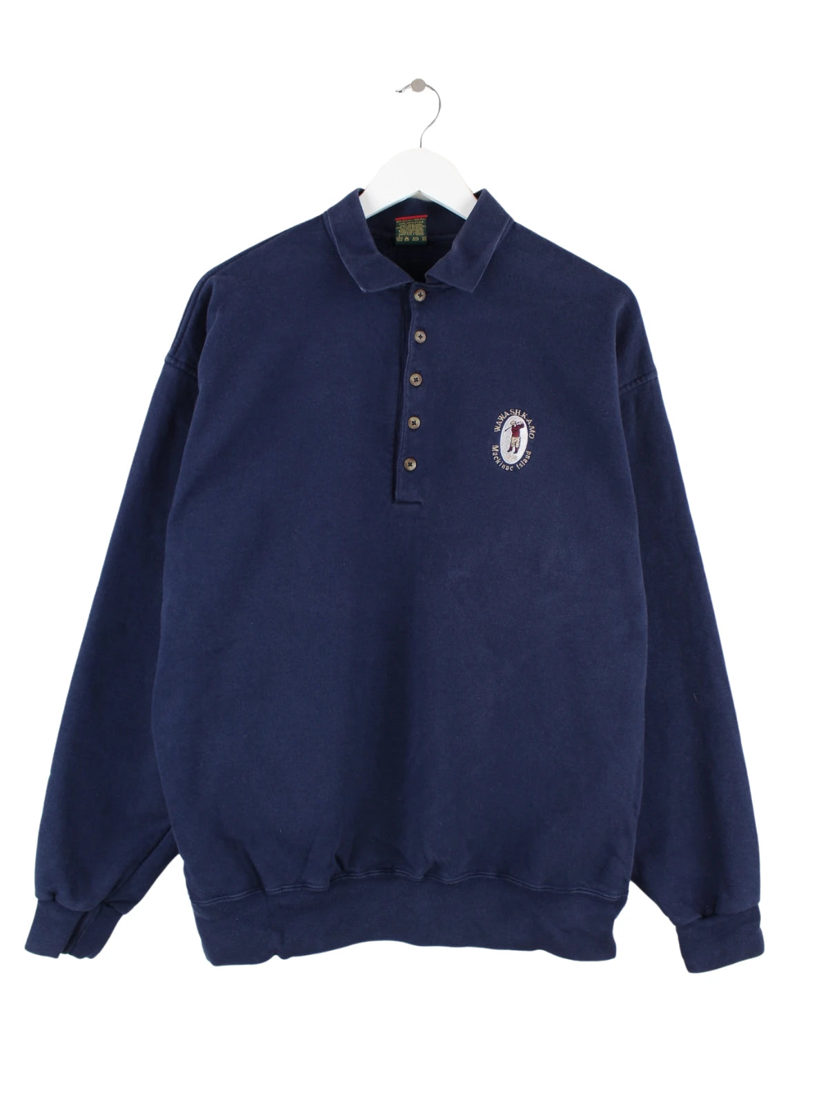 Vintage Sweater in Größe L aus den 90'ern. Er ist aus einer Baumwollmischung produziert und in Blau bei uns vorrätig.