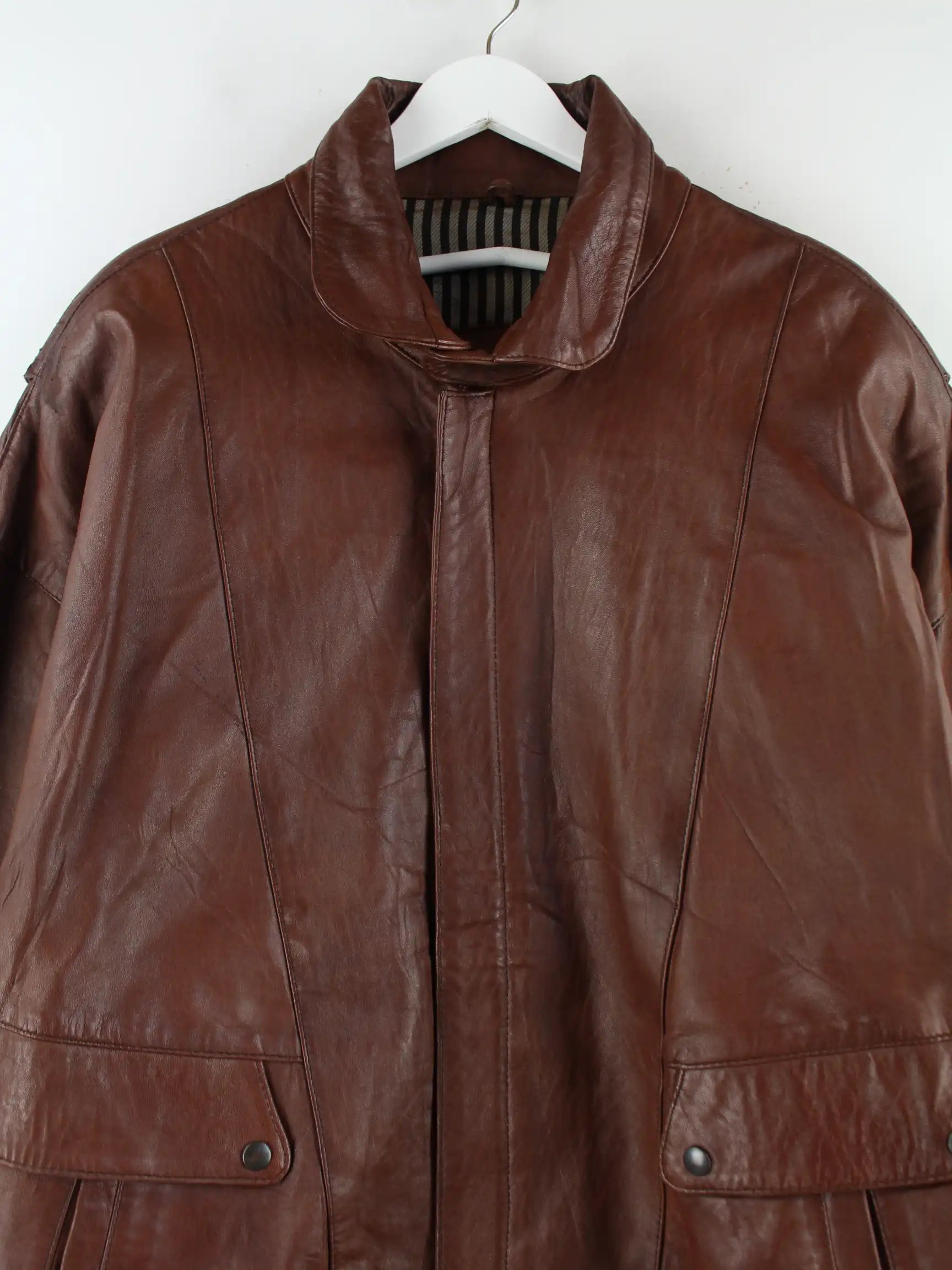 Vintage Jacke in Größe XXL aus den 90'ern. Sie ist aus Leder produziert und in Braun bei uns vorrätig.