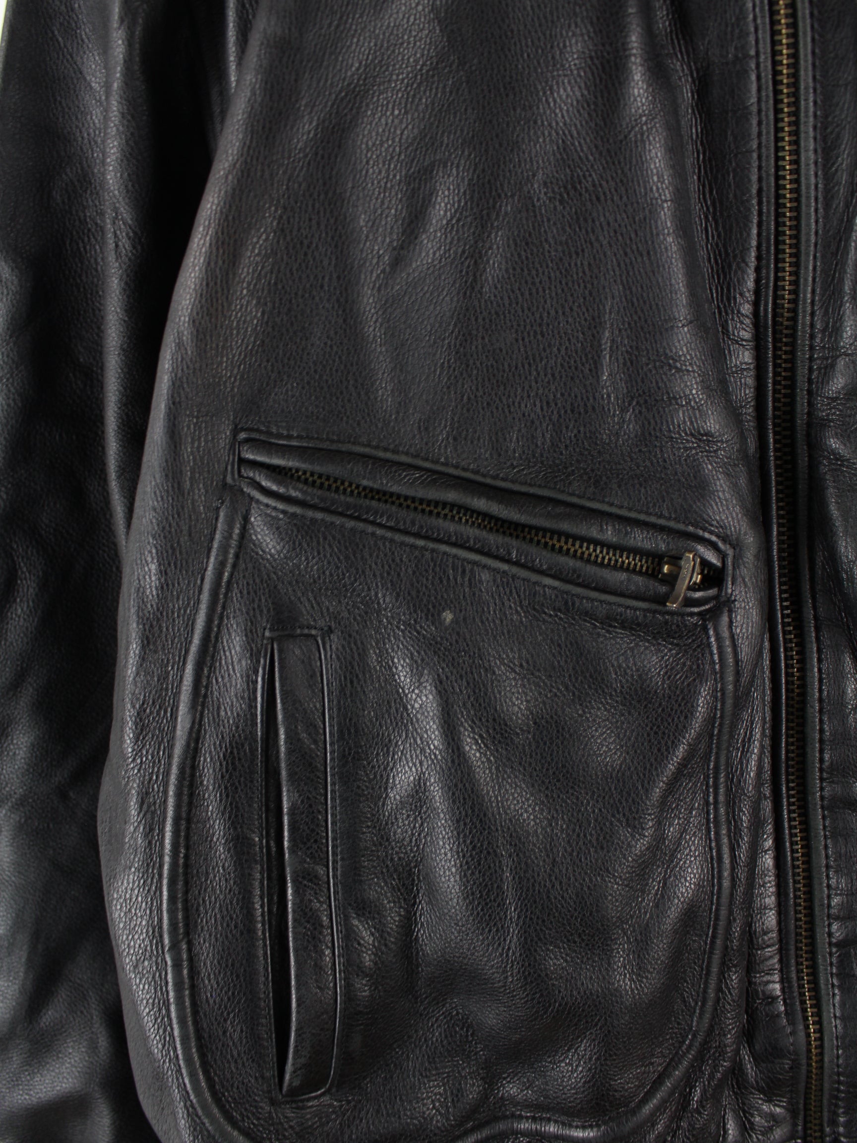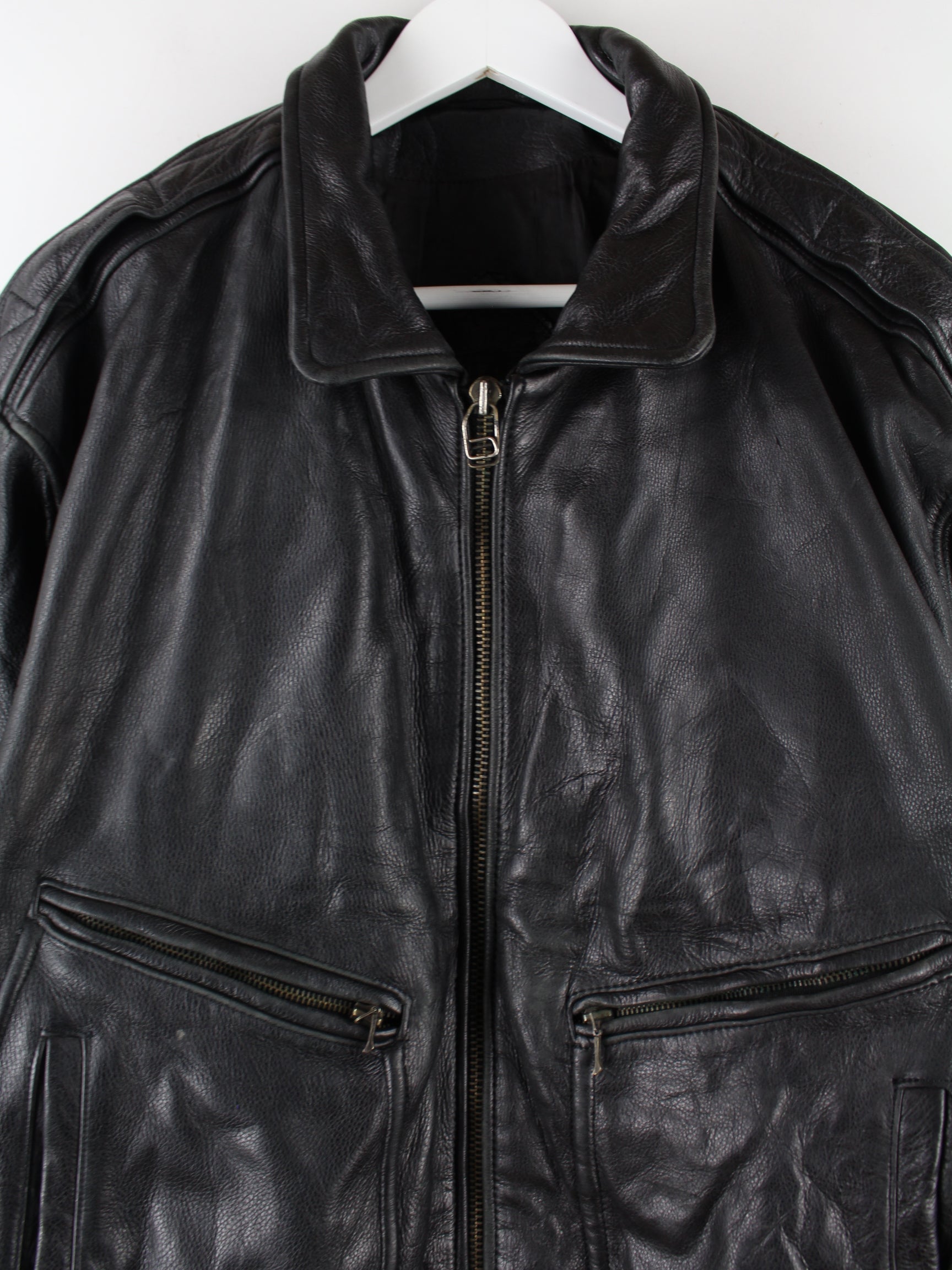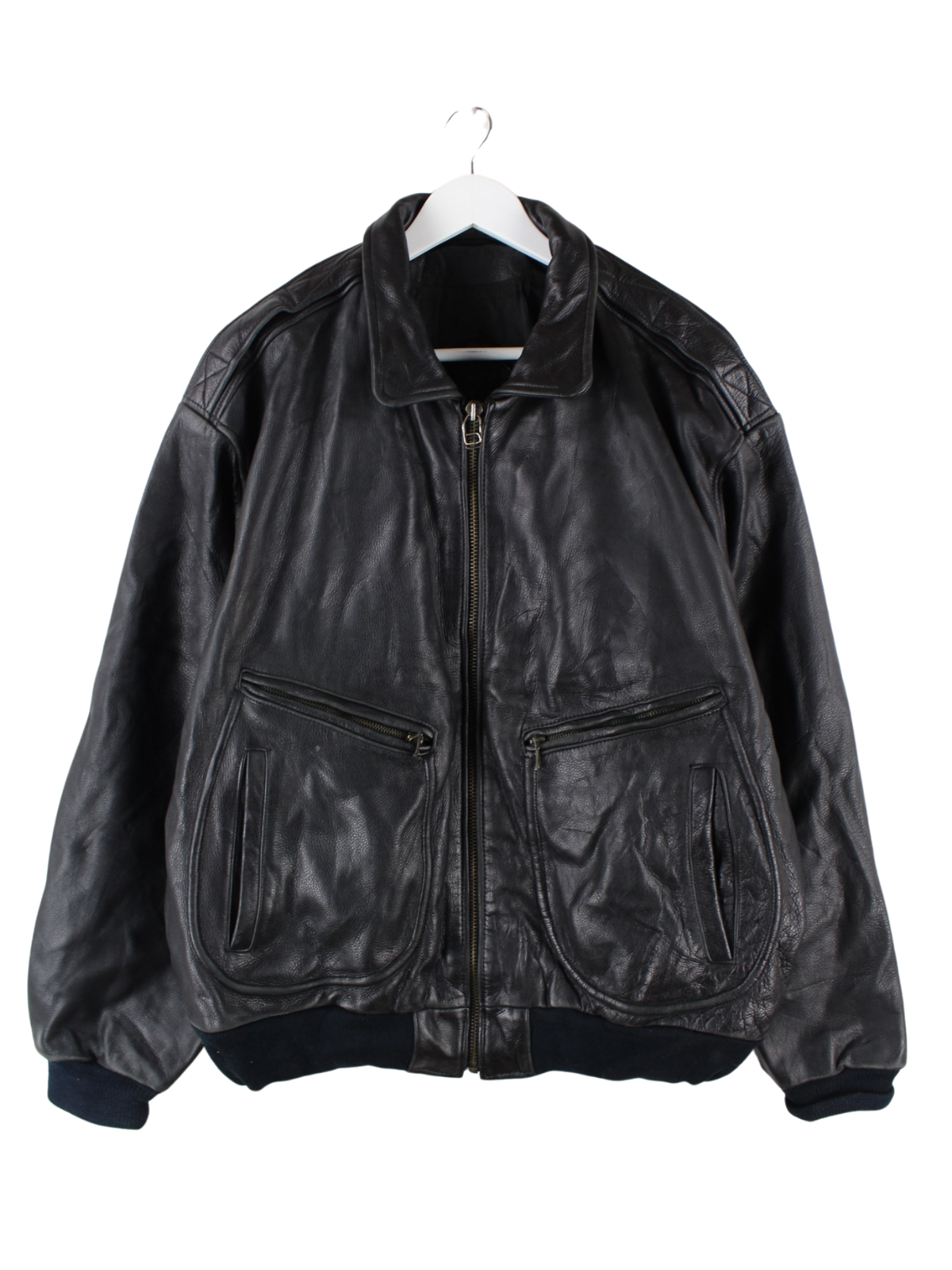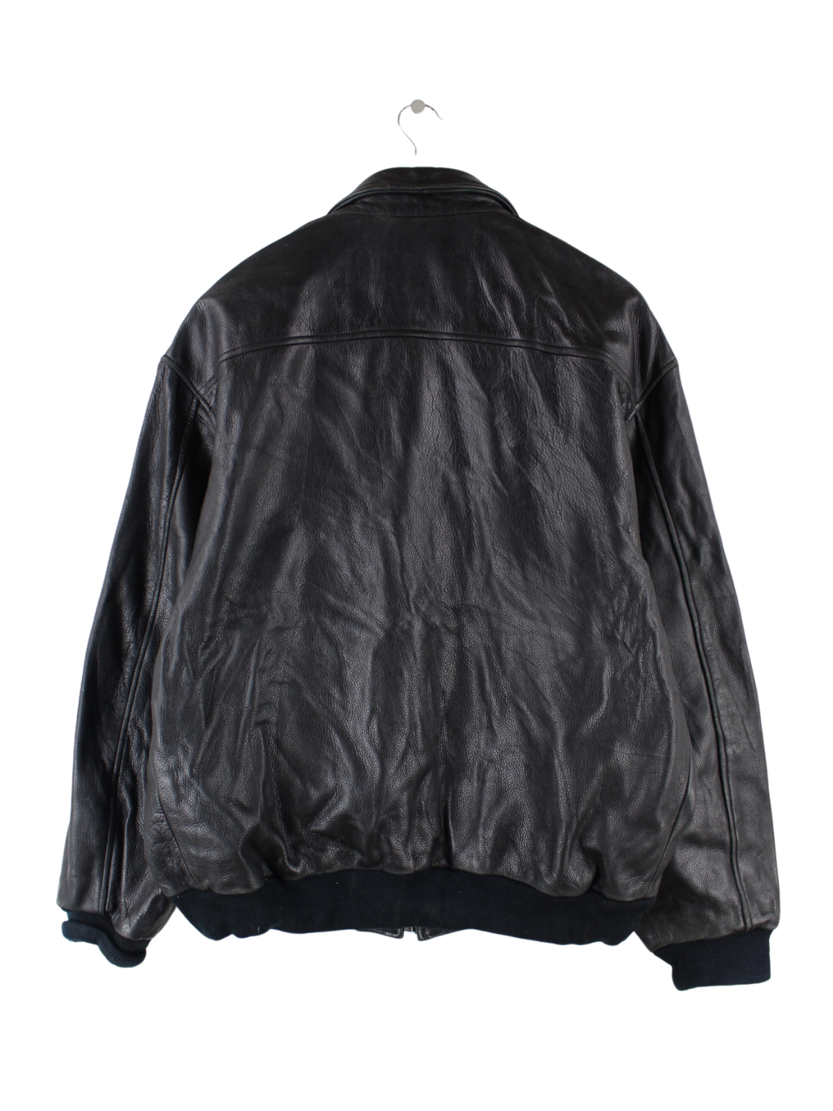 Vintage Jacke in Größe L aus den 90'ern. Sie ist aus Leder produziert und in Schwarz bei uns vorrätig.