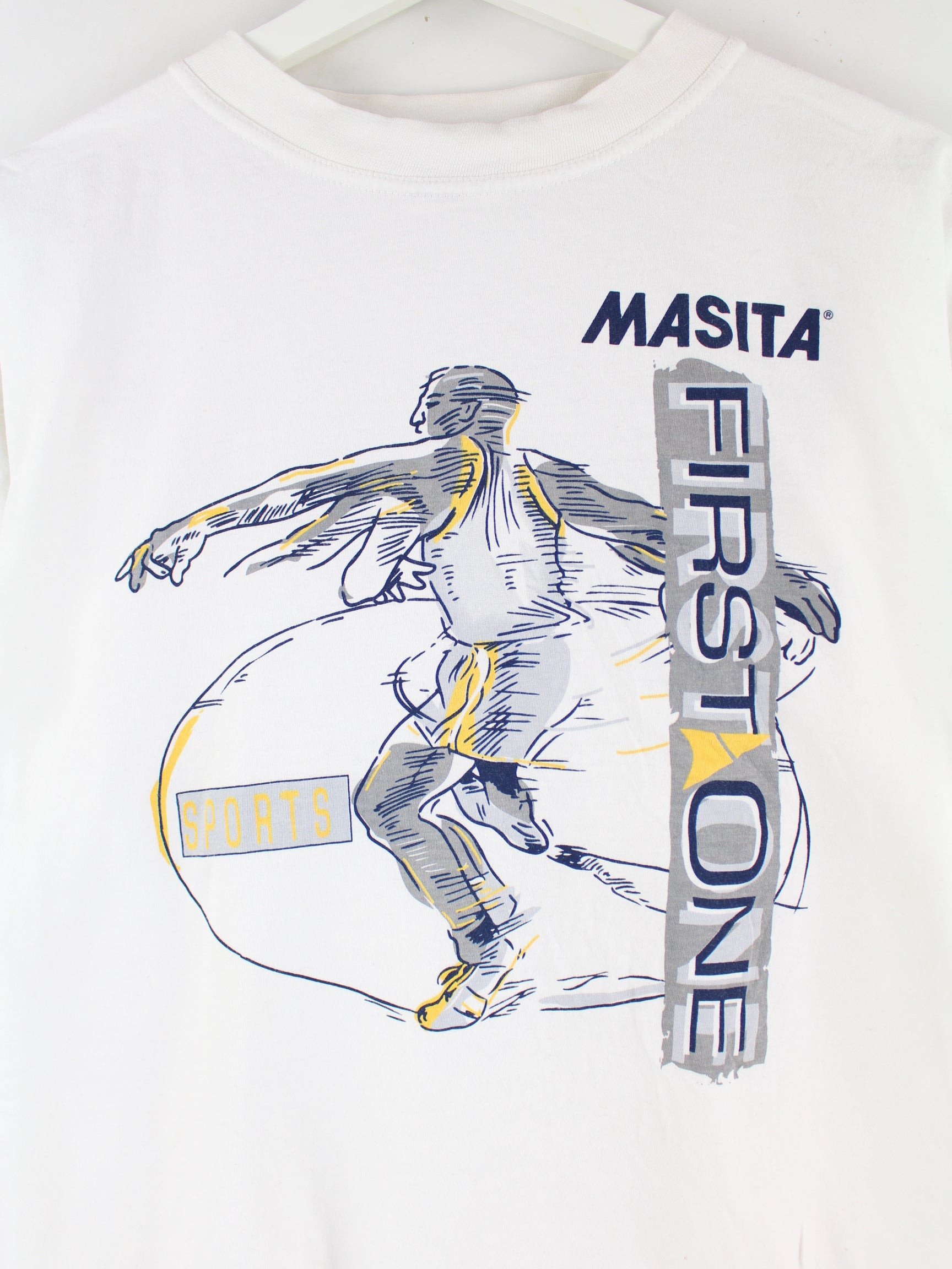 Weißes Vintage T-Shirt aus den 90'ern in Größe XL. Es ist aus Baumwolle hergestellt und in gutem Zustand vorrätig. Mit schickem 90s Print.