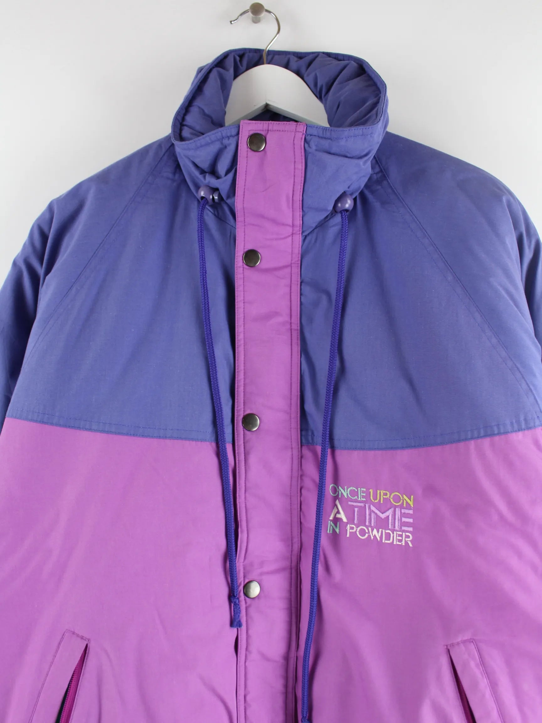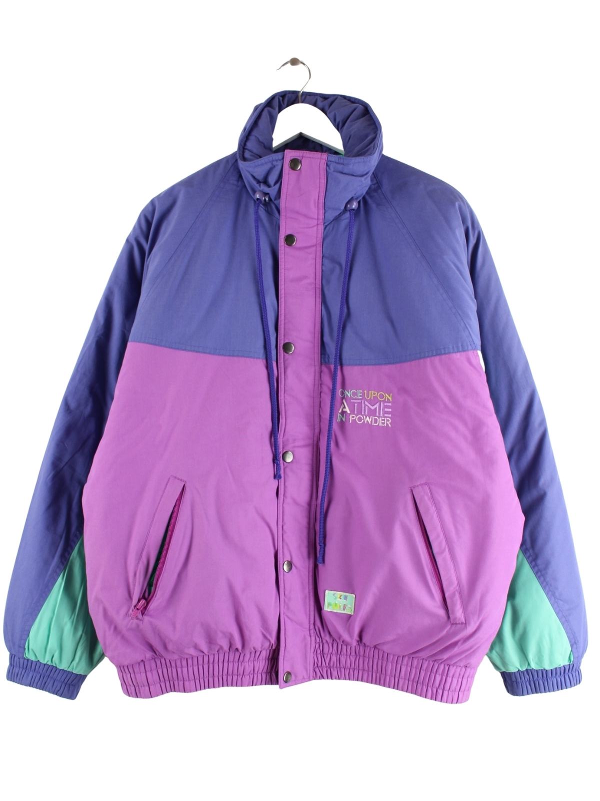 Lilafarbene Vintage Jacke aus den 90'ern in Größe XL. Sie ist aus Synthetik produziert und in sehr gutem Zustand bei uns zu bekommen.