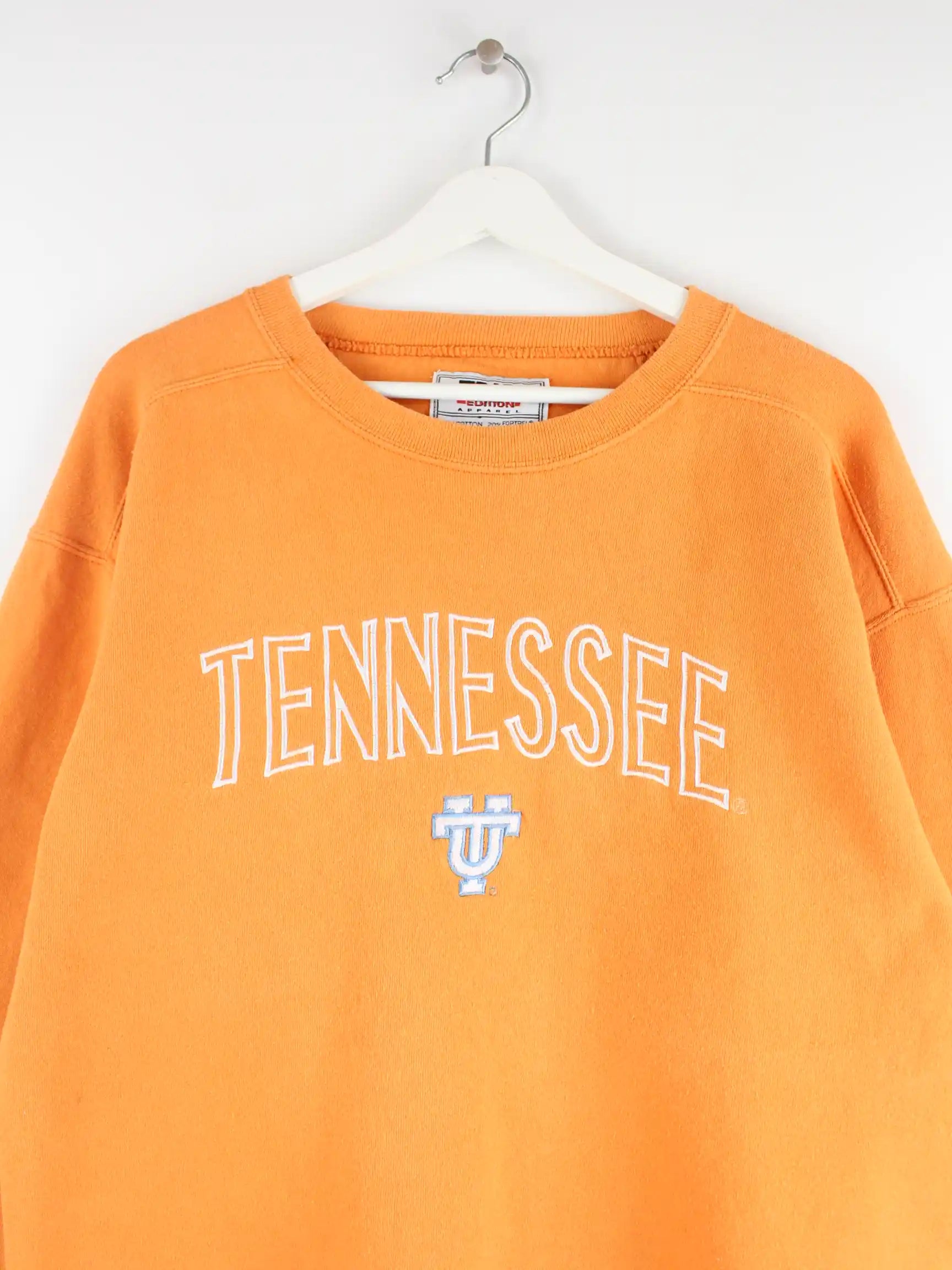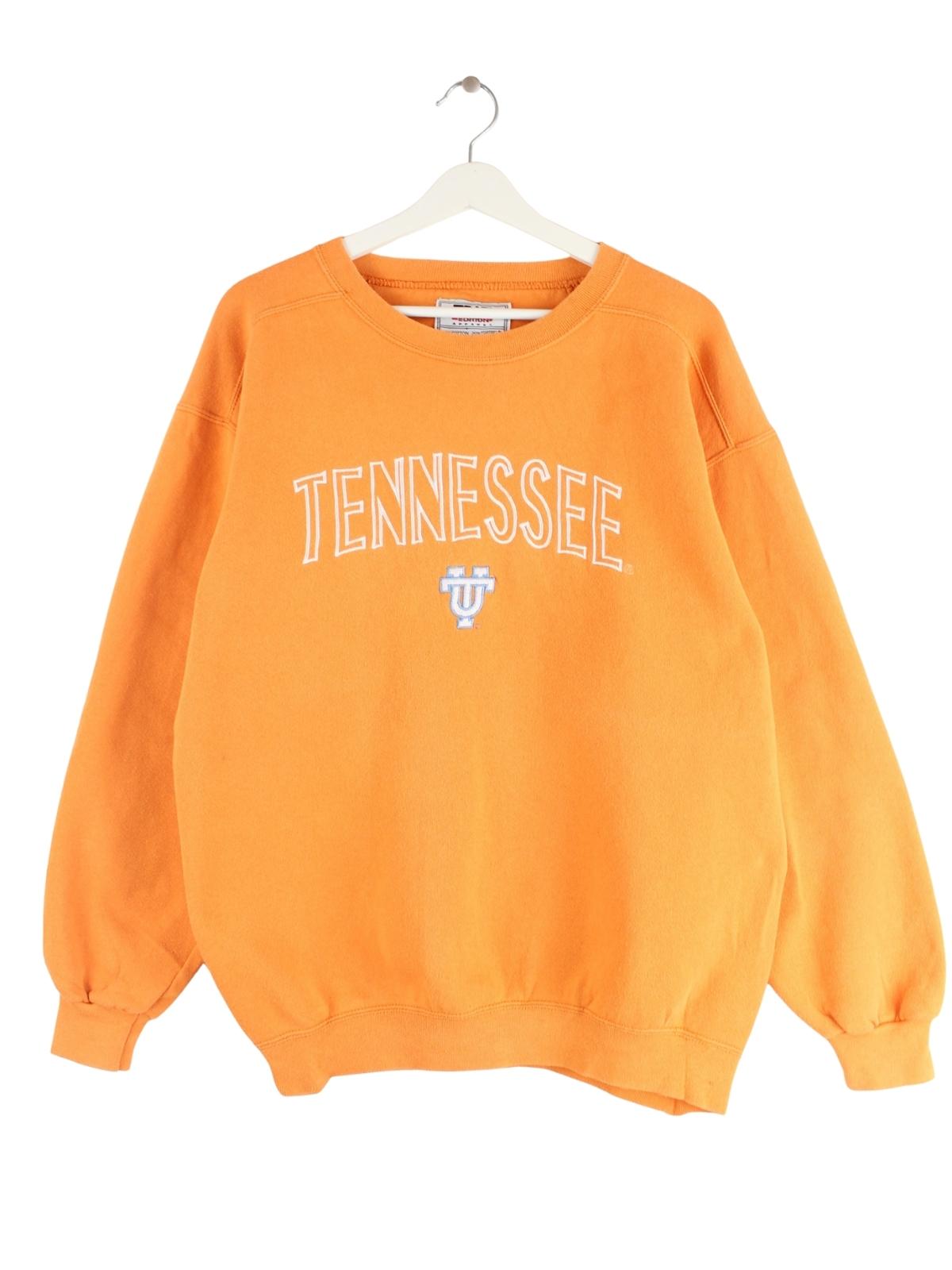 Orangefarbener Vintage Sweater aus den 90'ern in Größe M. Er ist aus einer Baumwollmischung gemacht und in gutem Zustand lieferbar.