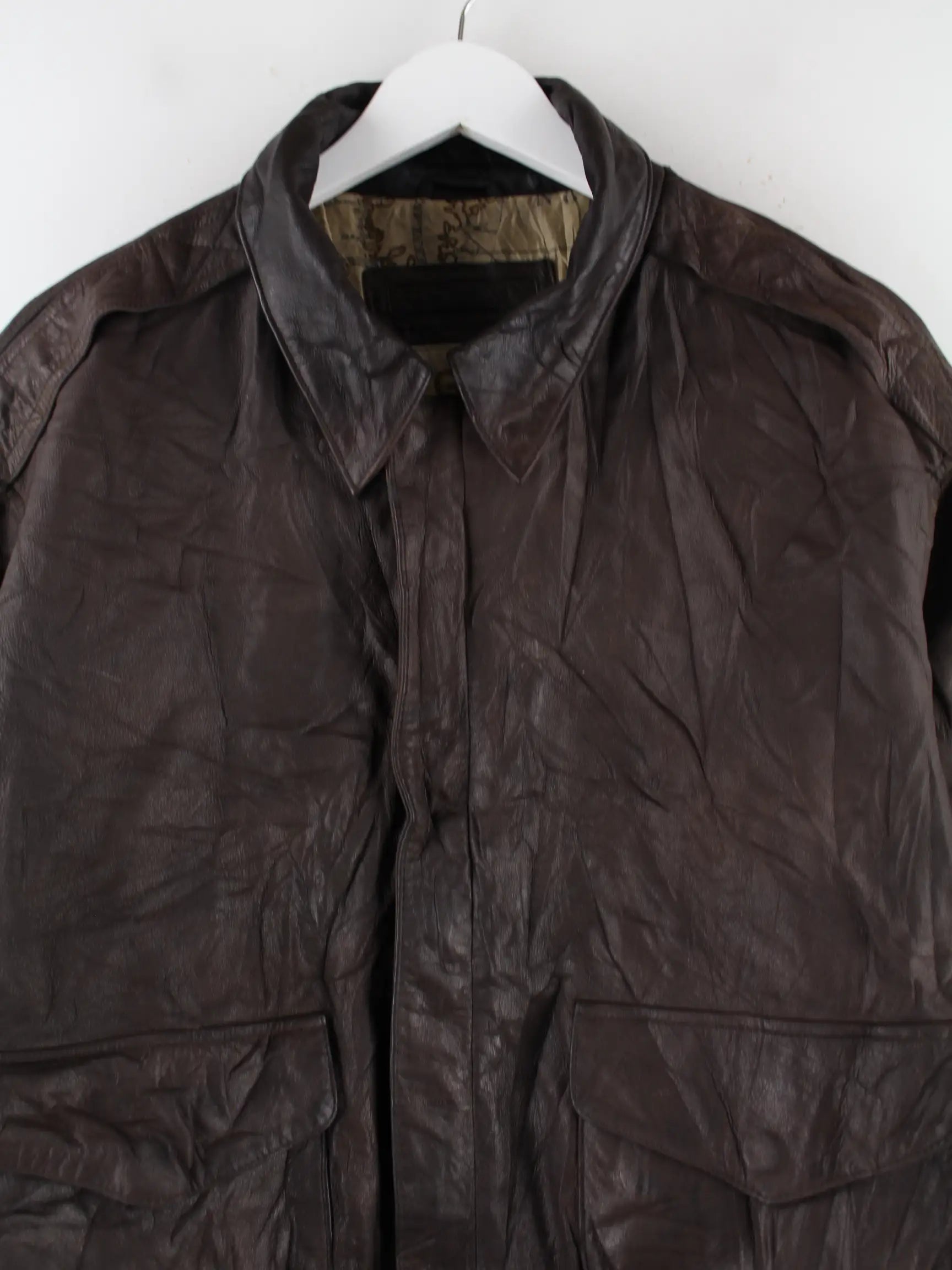 Vintage Jacke in Größe L aus den 90'ern. Sie ist aus Leder angefertigt und in Braun im Bestand.