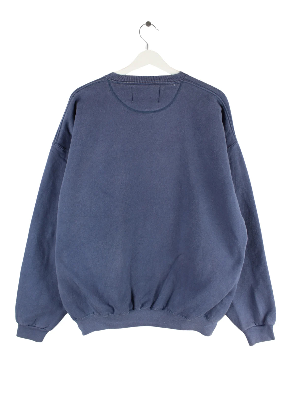 Blauer Vintage Sweater mit gestickten Motiven aus den 90'ern in Größe XL. Er ist aus einer Baumwollmischung und in sehr gutem Zustand auf Lager.
