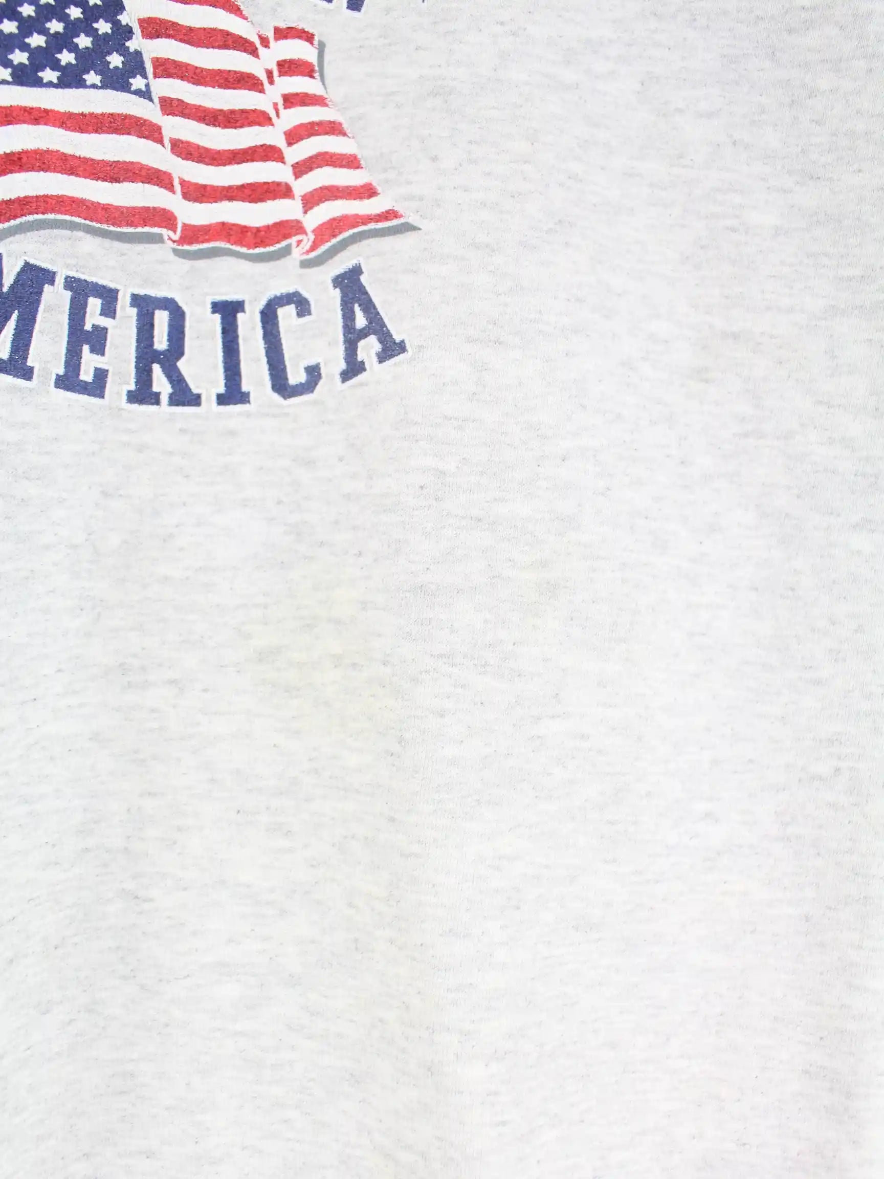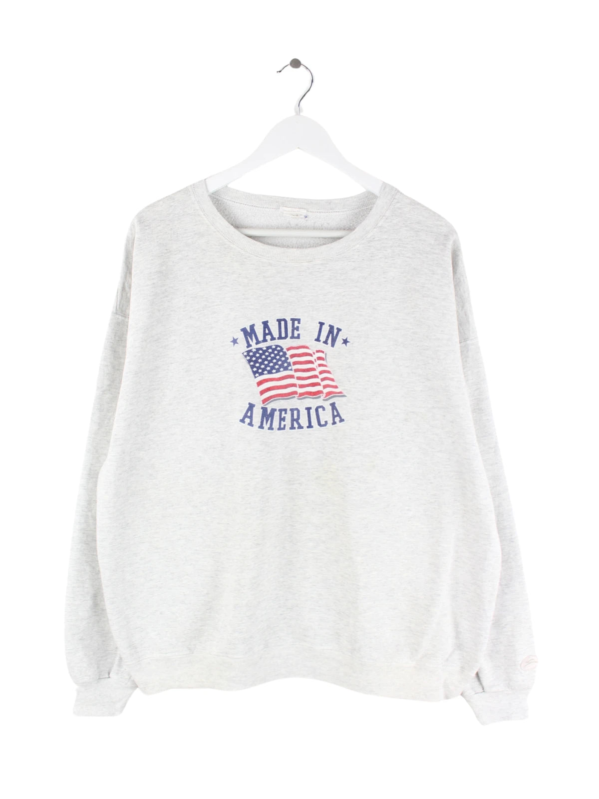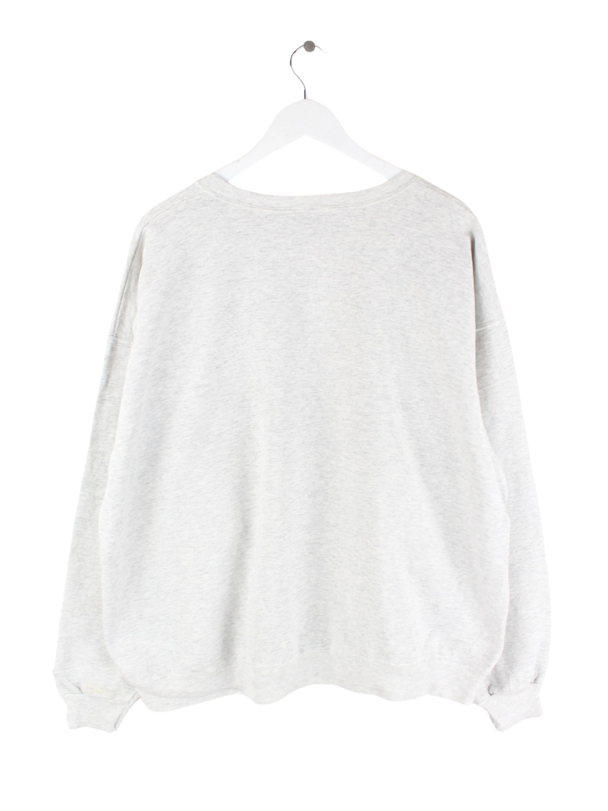 Grauer Vintage Sweater aus den 90'ern in Größe XL. Er ist aus einer Baumwollmischung produziert. Den Zustand würden wir als 'In Ordnung' bezeichnen (vergl. Bilder).Mit chiquem USA Print.