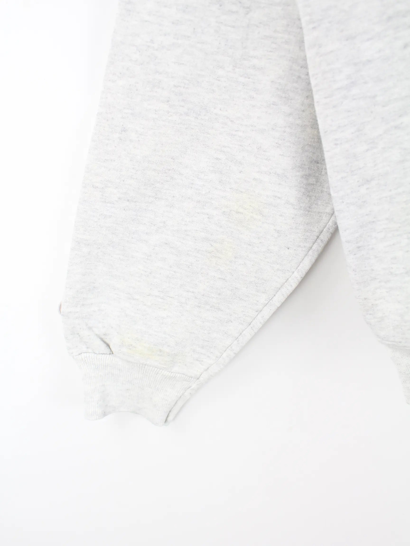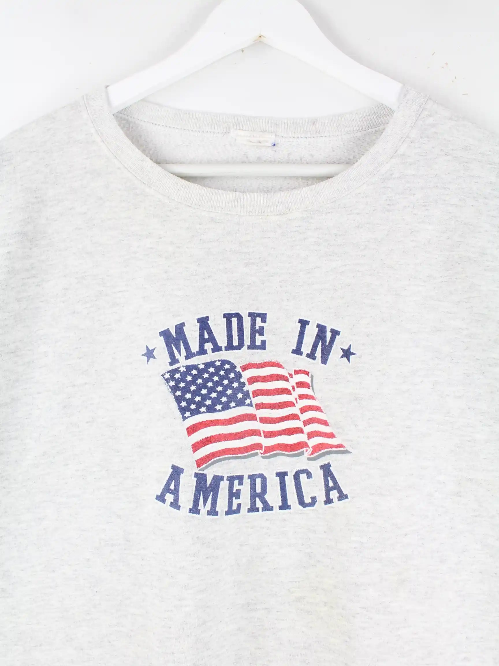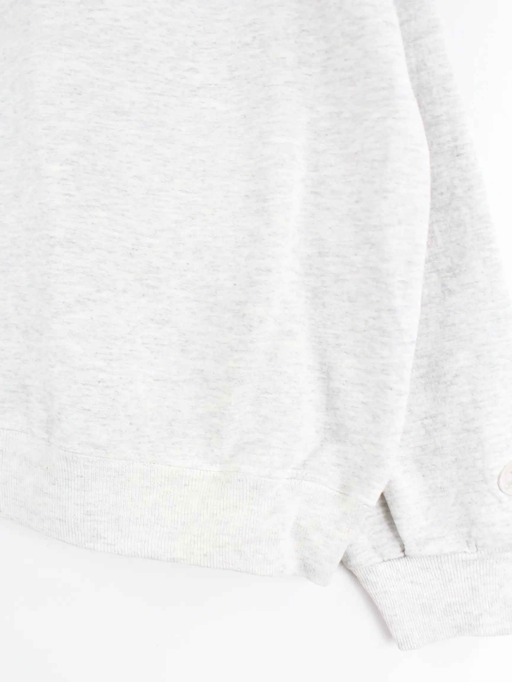 Grauer Vintage Sweater aus den 90'ern in Größe XL. Er ist aus einer Baumwollmischung produziert. Den Zustand würden wir als 'In Ordnung' bezeichnen (vergl. Bilder).Mit chiquem USA Print.