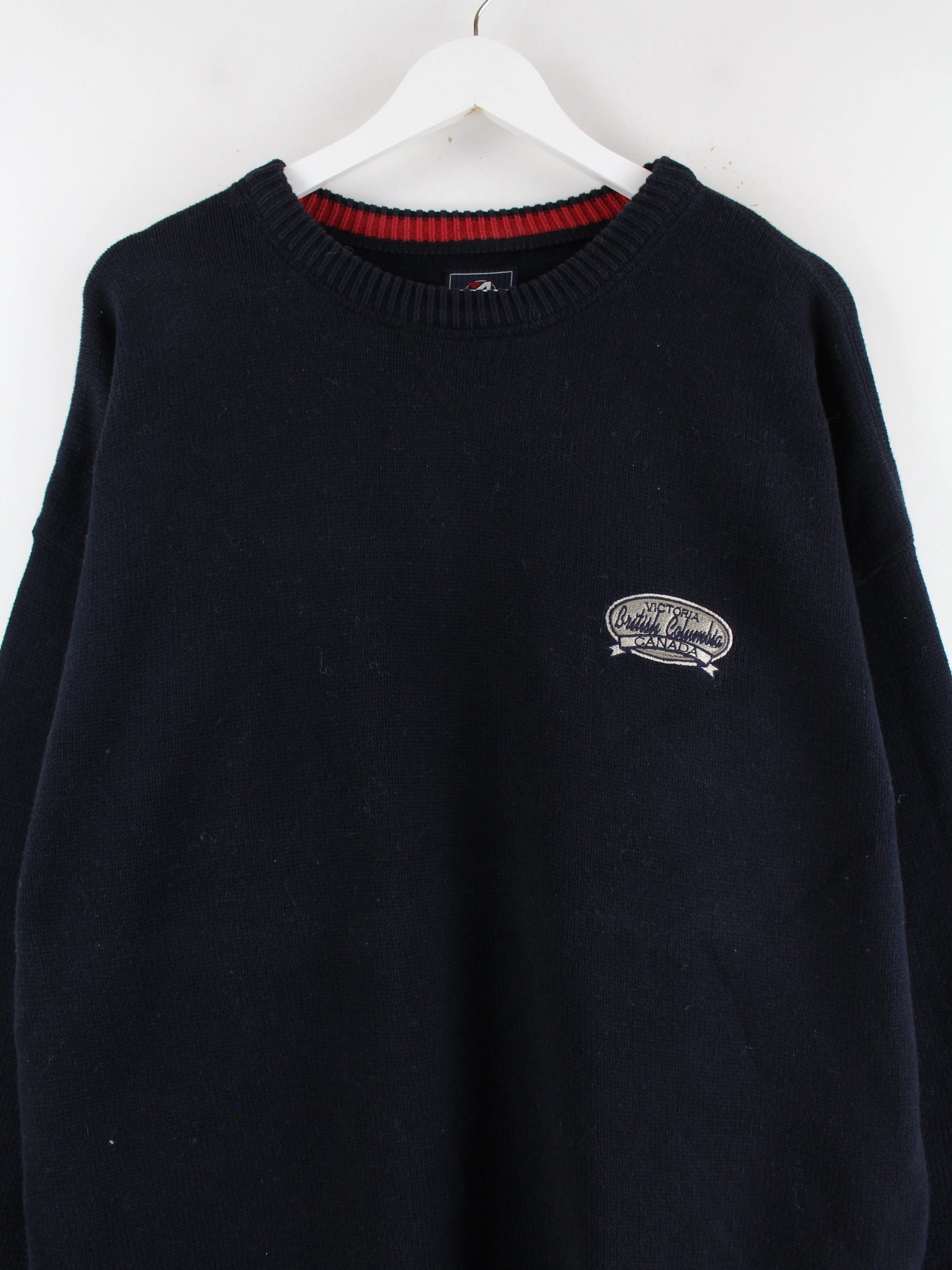 Vintage Pullover mit gesticktem Logo in Größe XXL. Er ist aus Baumwolle hergestellt und in Blau vorrätig.