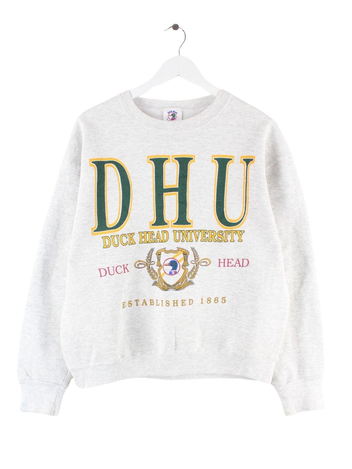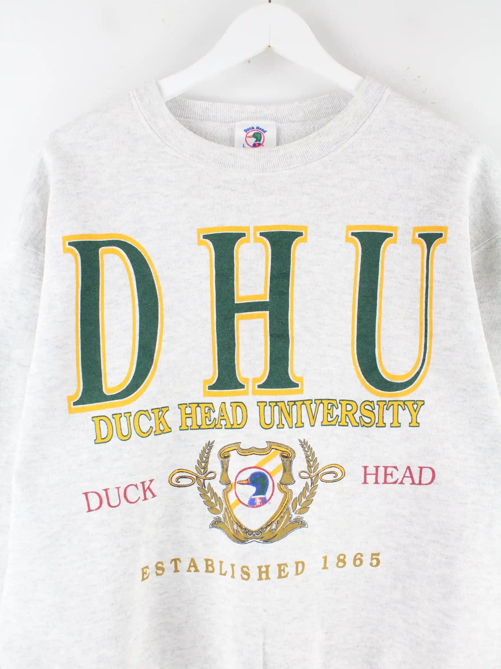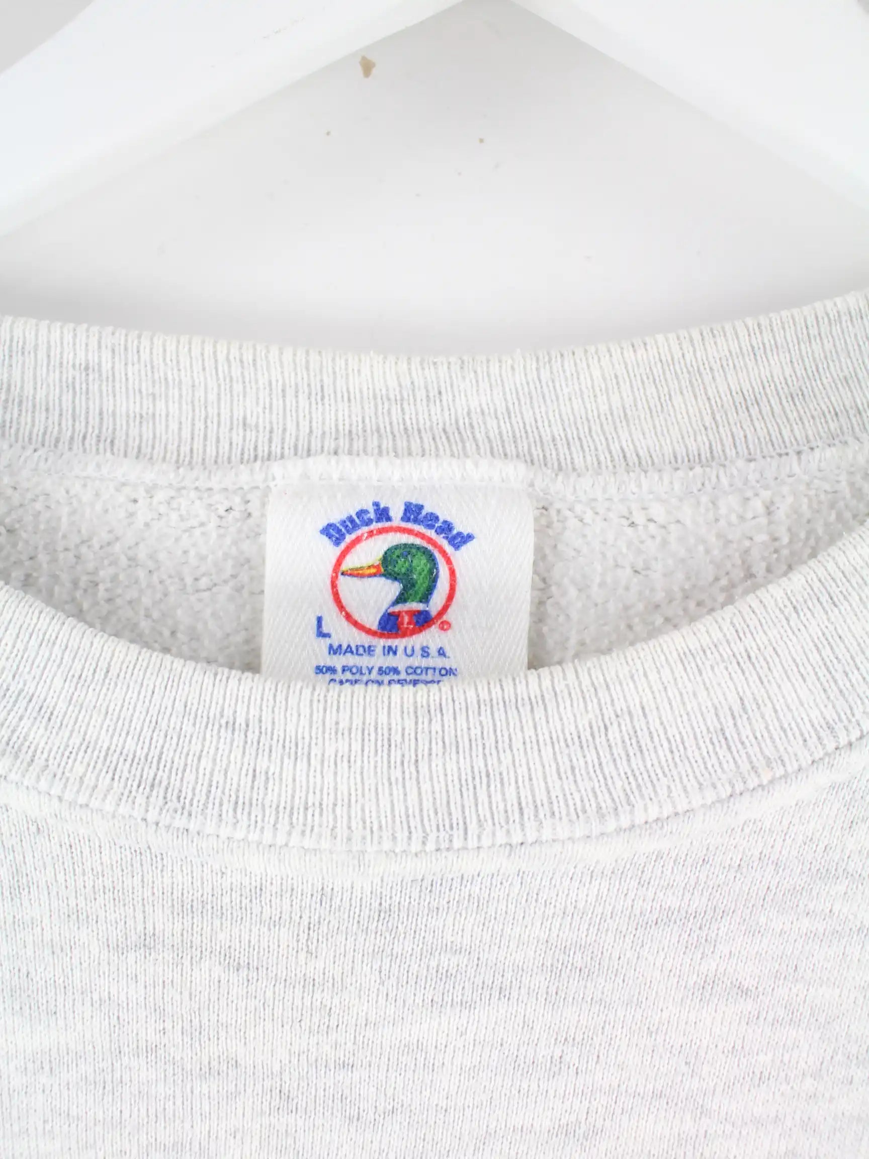 Vintage Sweater in Größe L aus den 90'ern. Er ist aus einer Baumwollmischung hergestellt und in Grau in Stock. Mit seltenem DHU Print.