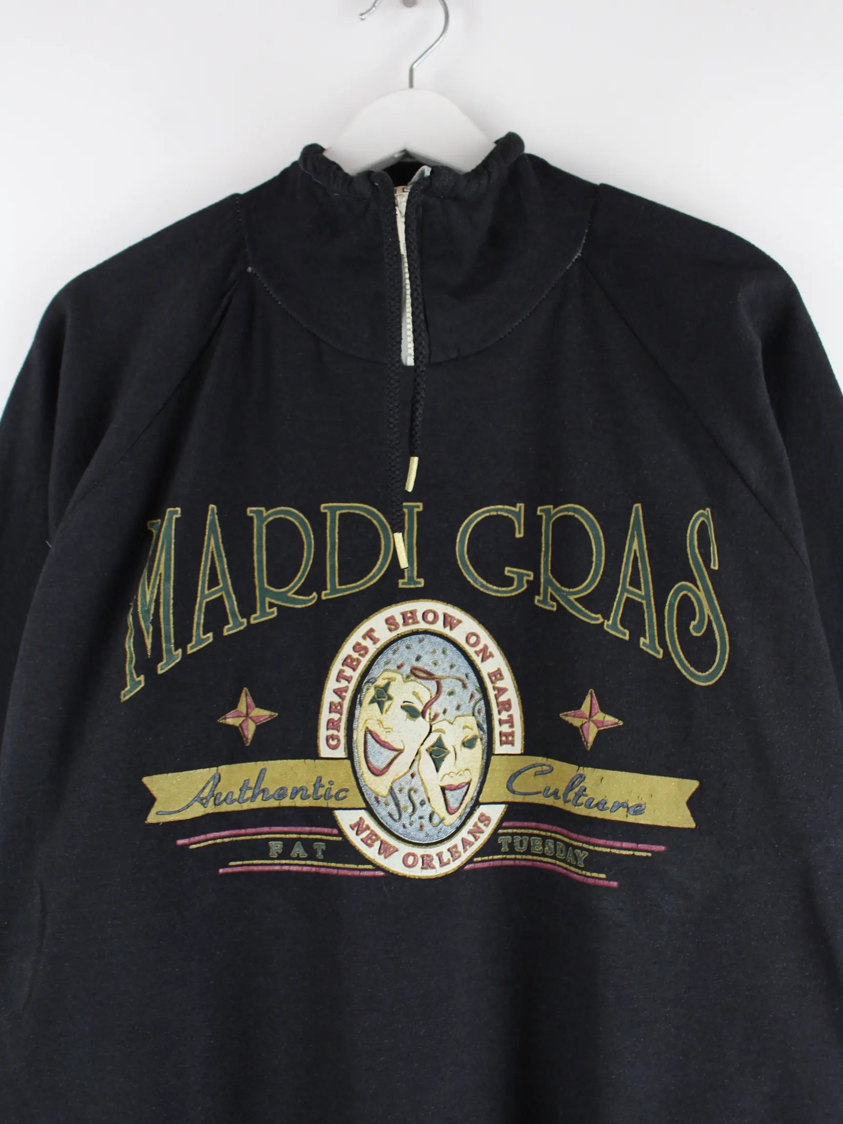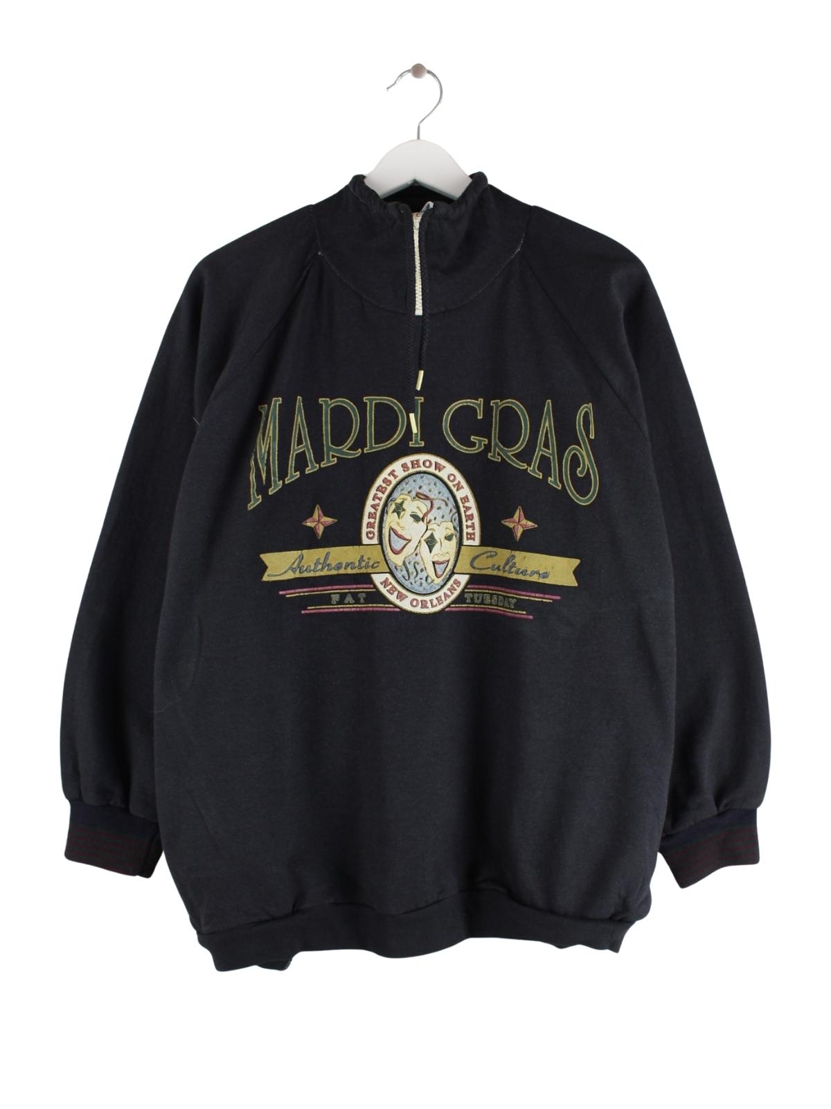 Vintage Sweater mit Reißverschluß in Größe XL aus den 90'ern. Er ist aus einer Baumwollmischung gefertigt und in Schwarz zu bekommen. Mit tollem Orleans Print.