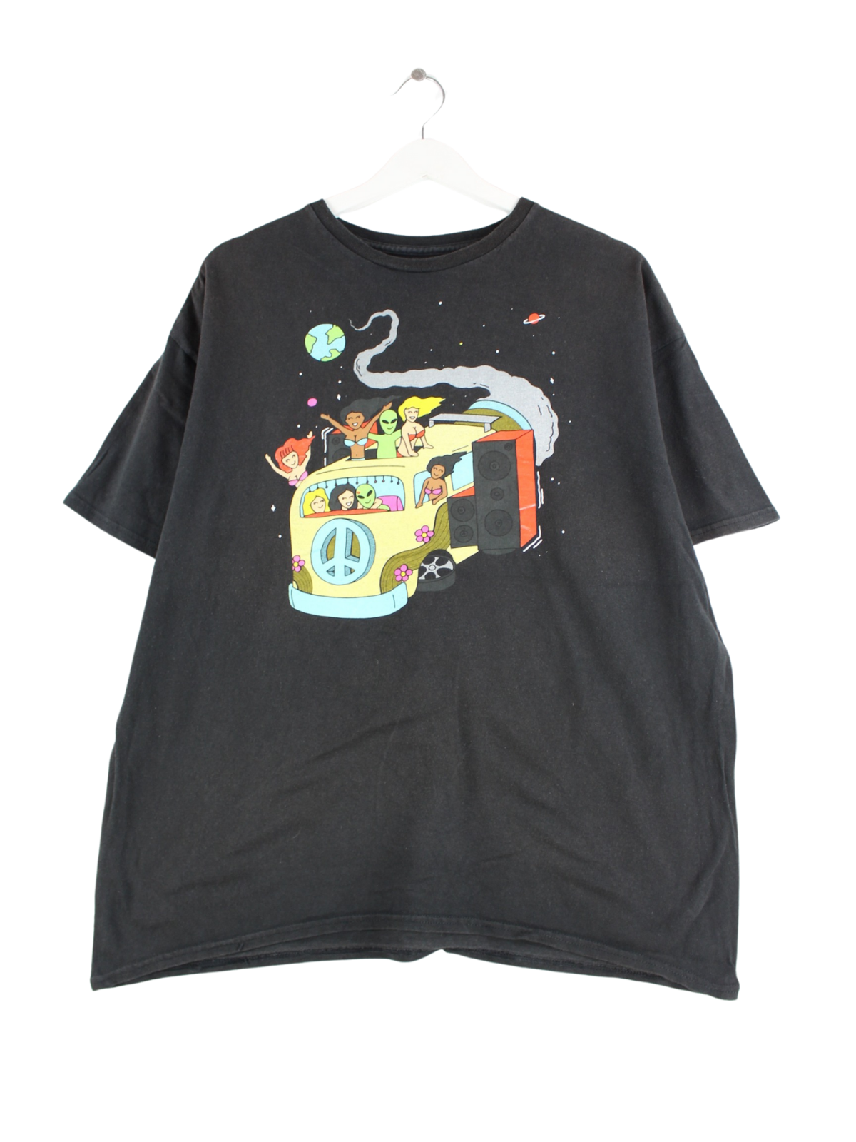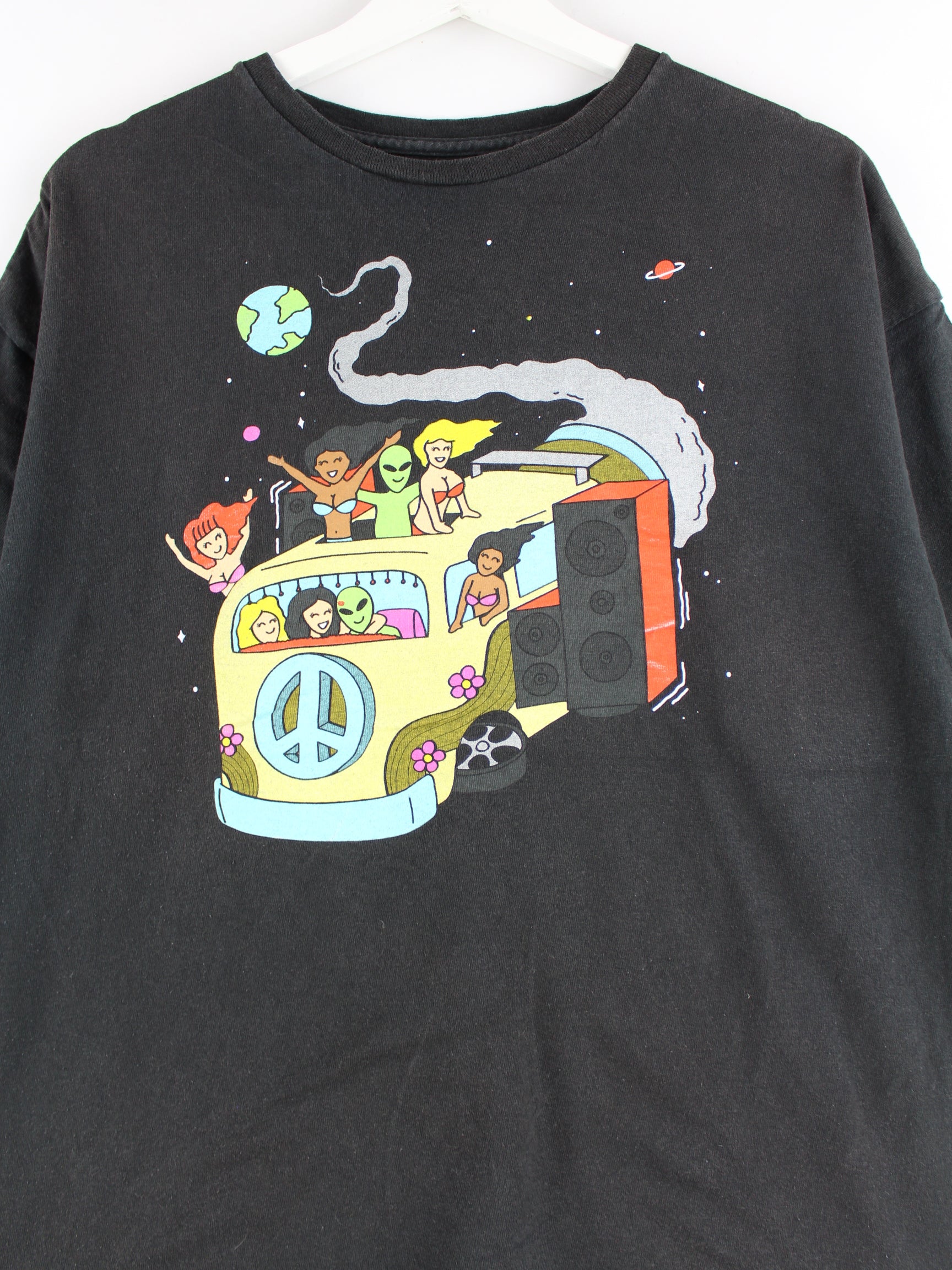 Vintage T-Shirt in Größe M. Es ist aus Baumwolle angefertigt und in Schwarz im Bestand. Mit schickem Space Print.