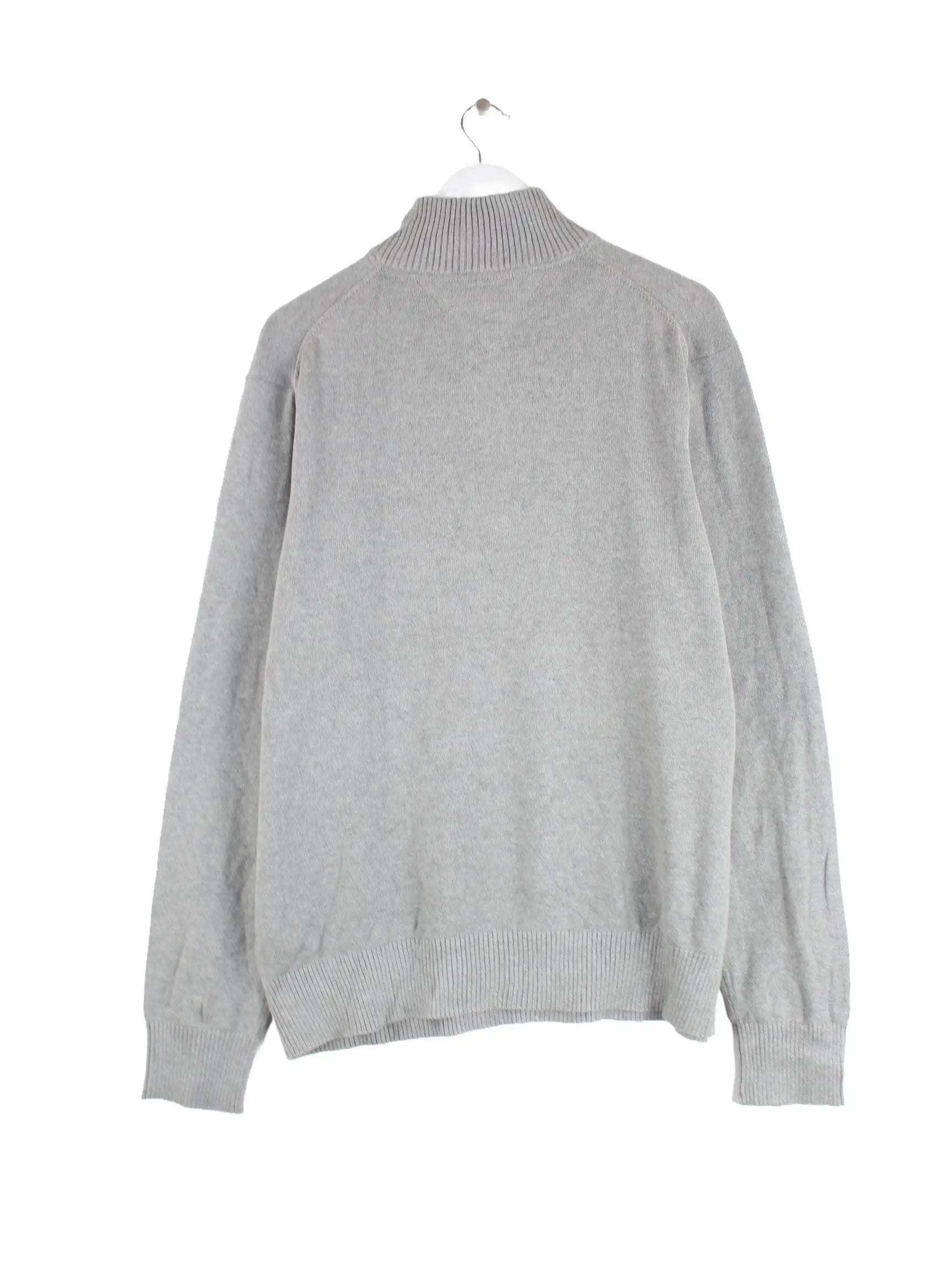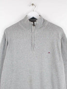 Grauer Pullover mit kurzem Reißverschluß der Marke Tommy Hilfiger in Größe XL. Er ist aus Baumwolle produziert und in gutem Zustand auf Lager.