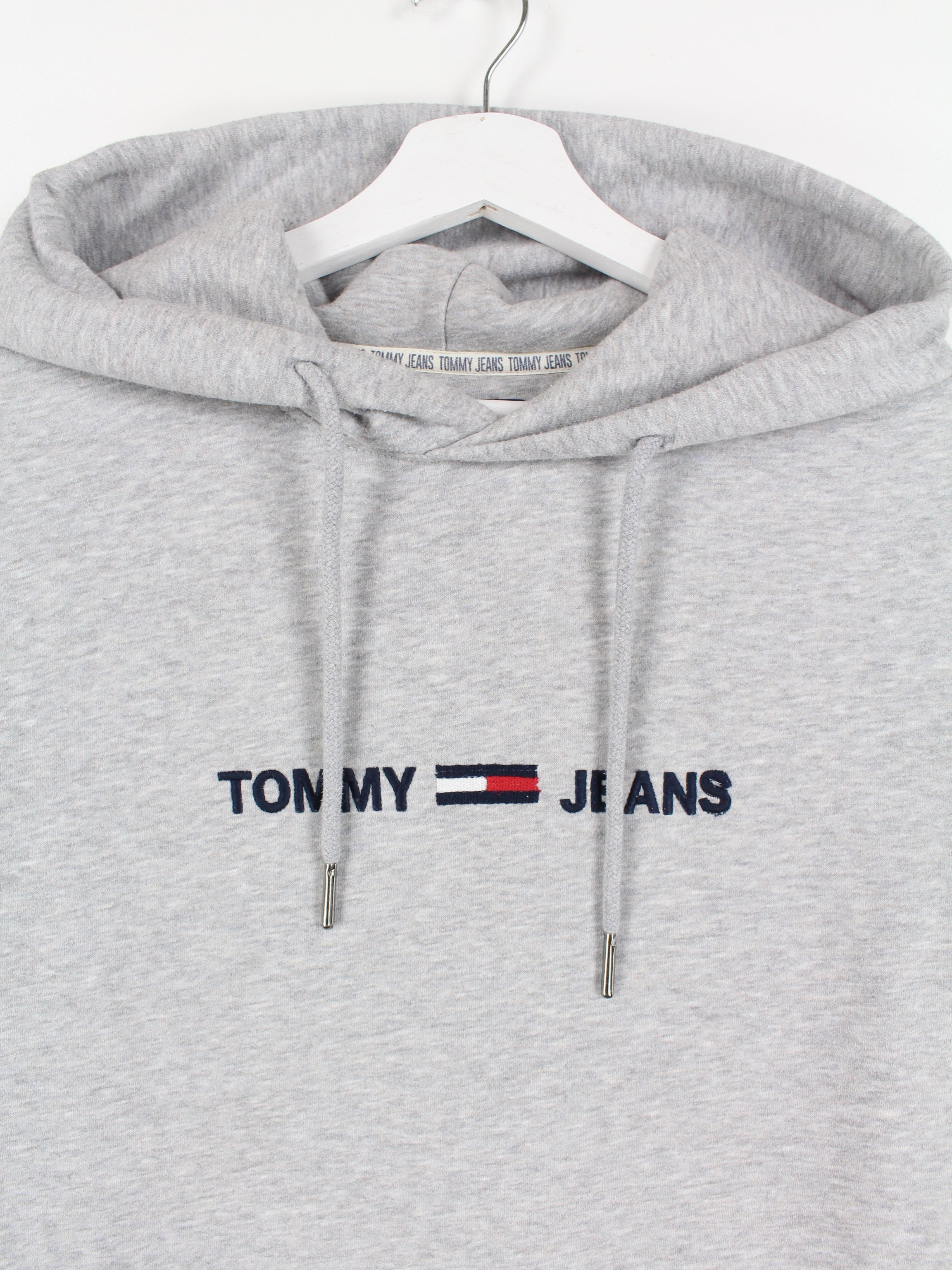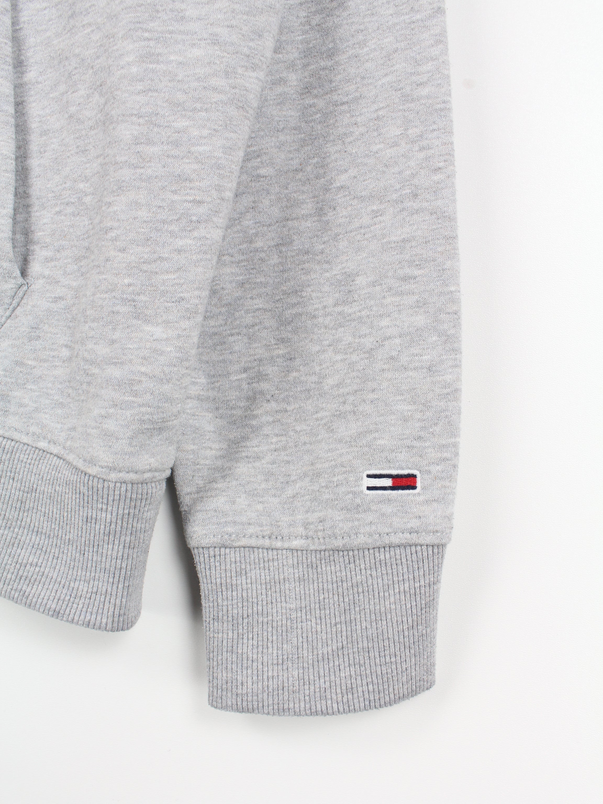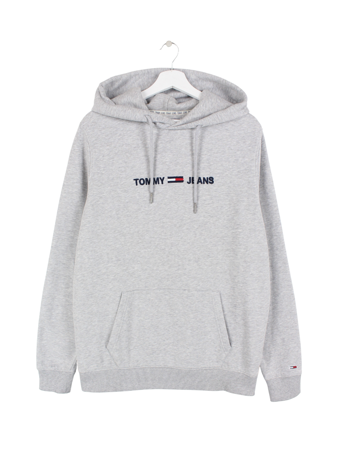 Grauer Hoodie der Marke Tommy Hilfiger, mit großem Stick auf der Front.