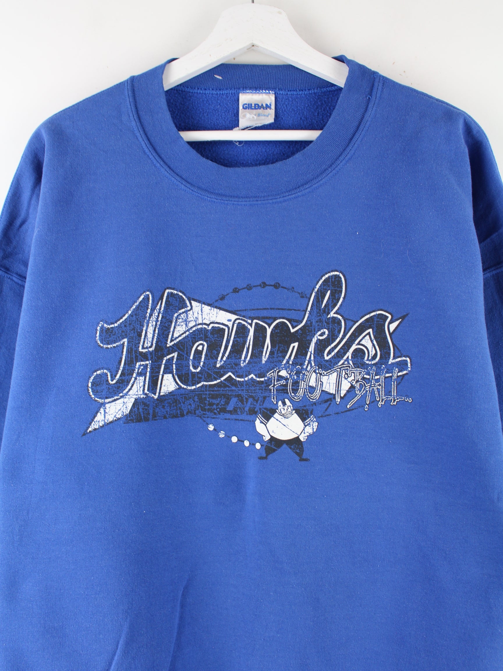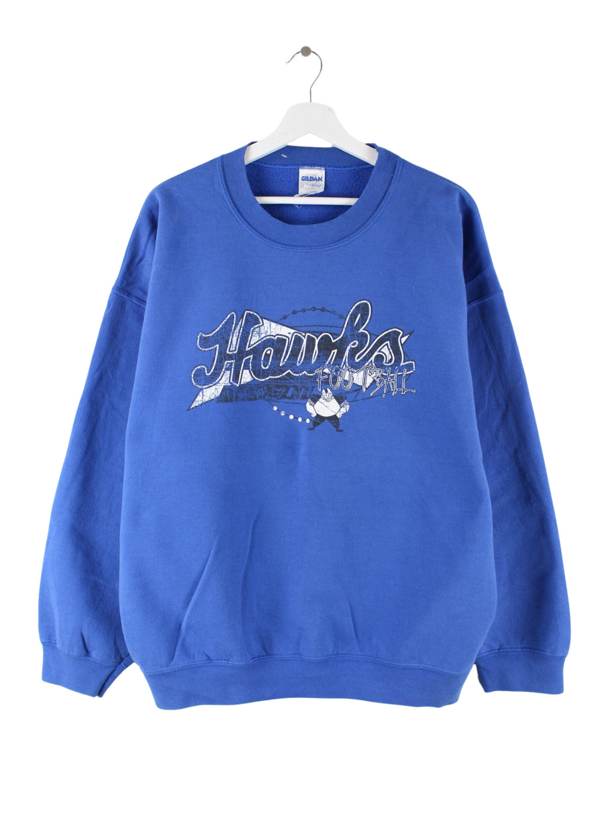 Blauer Sweater aus dem Hause Gildan in Größe XL. Er ist aus einer Baumwollmischung hergestellt und in sehr gutem Zustand im Angebot. Mit schickem Hawks Print.