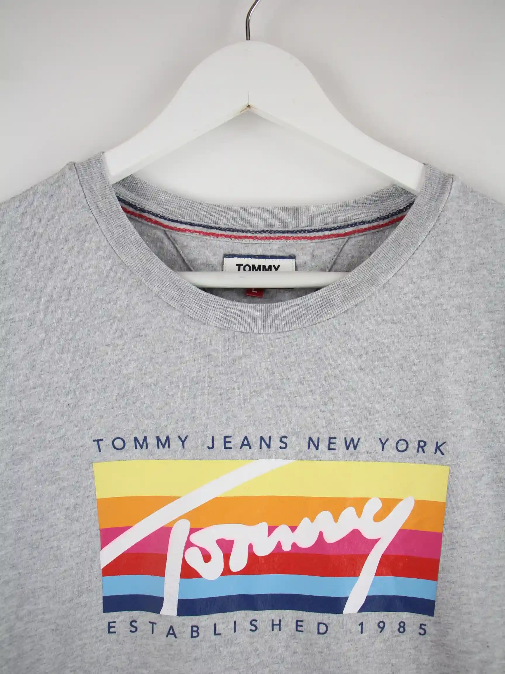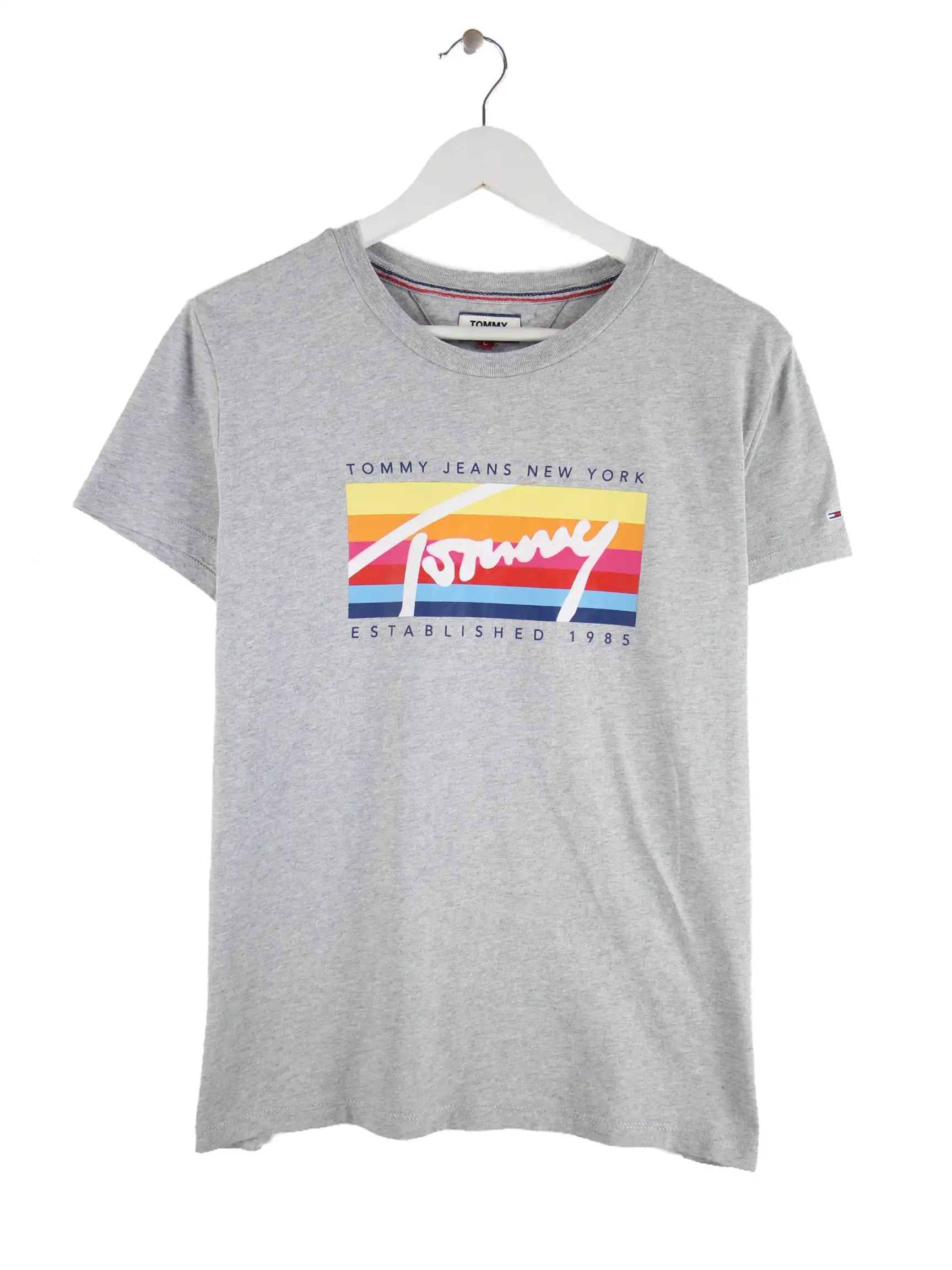 Graues T-Shirt der Marke Tommy Hilfiger in Größe L. Es ist aus Baumwolle gemacht und in sehr gutem Zustand bei uns vorrätig. Mit schönem Print.