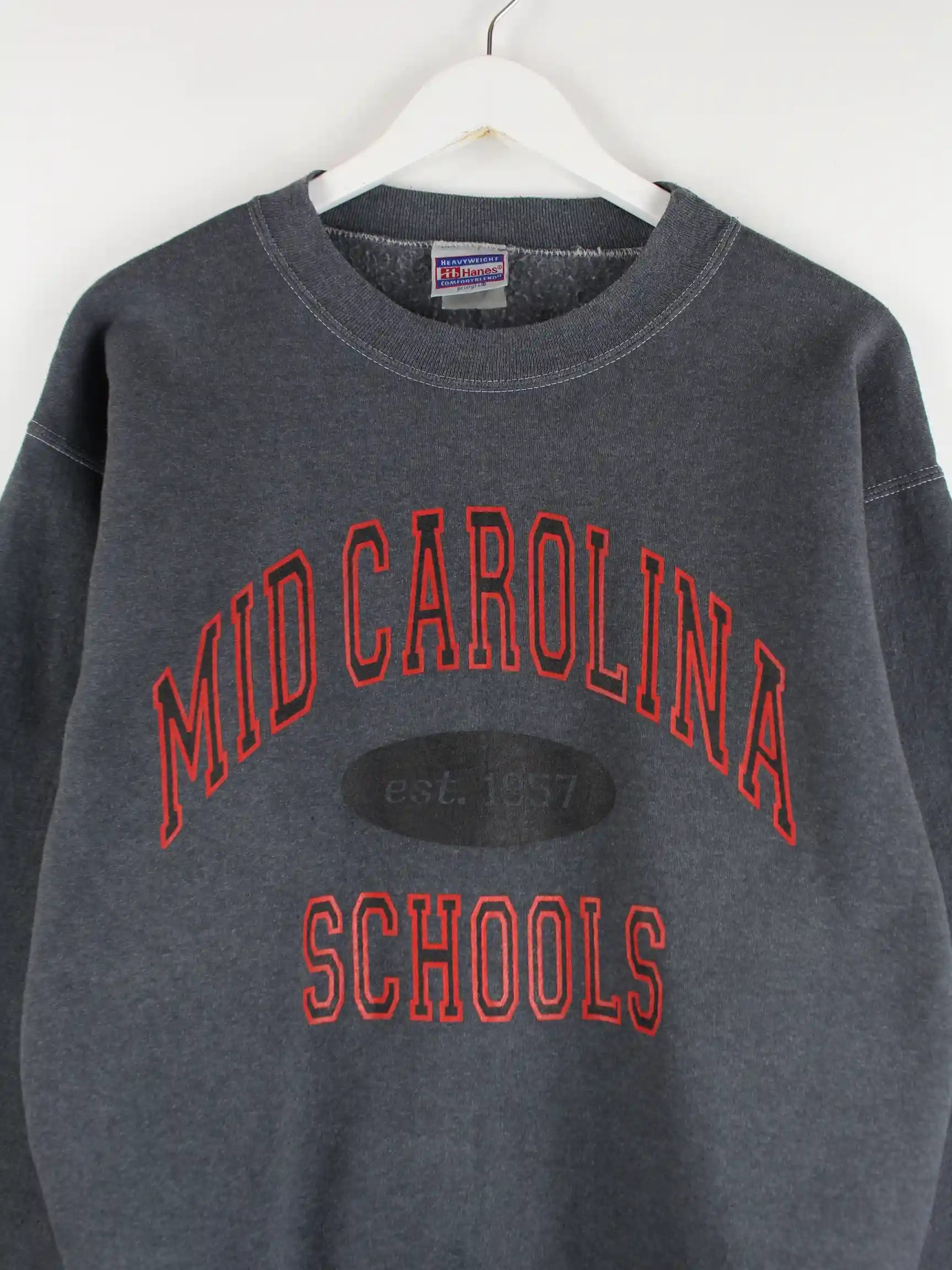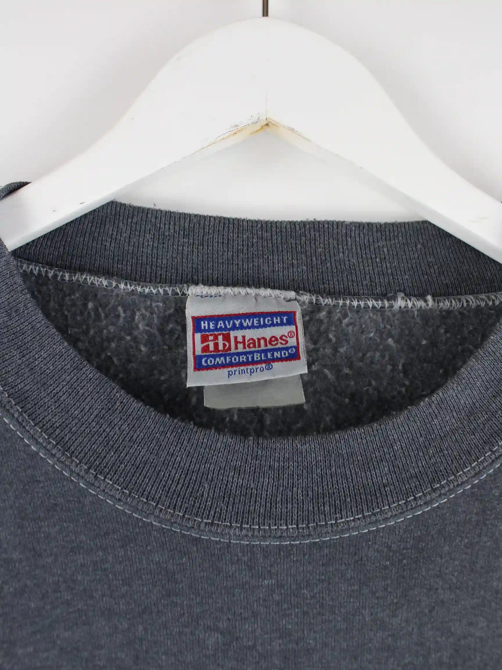 Sweater aus dem Hause Hanes in Größe L. Er ist aus einer Baumwollmischung angefertigt und in Grau auf Lager. Mit schönem School Print.