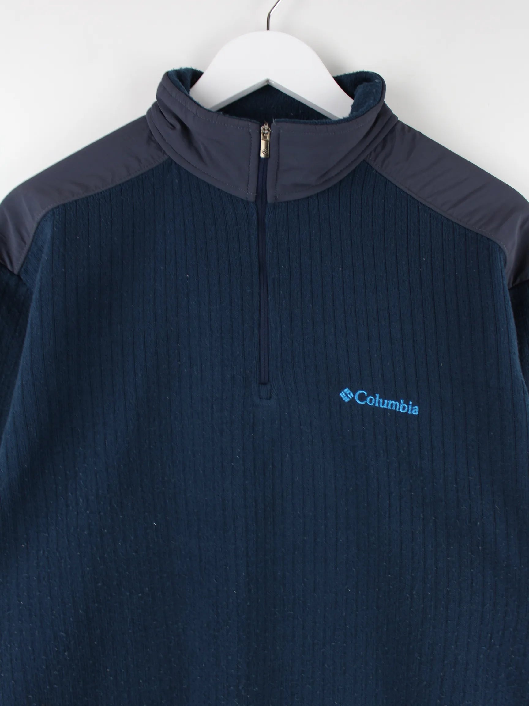 Blaue Leichte Jacke mit halbem Reißverschluß der Brand Columbia in Größe L. Sie ist aus weichem Fleece produziert und in gutem Zustand bei uns vorrätig.