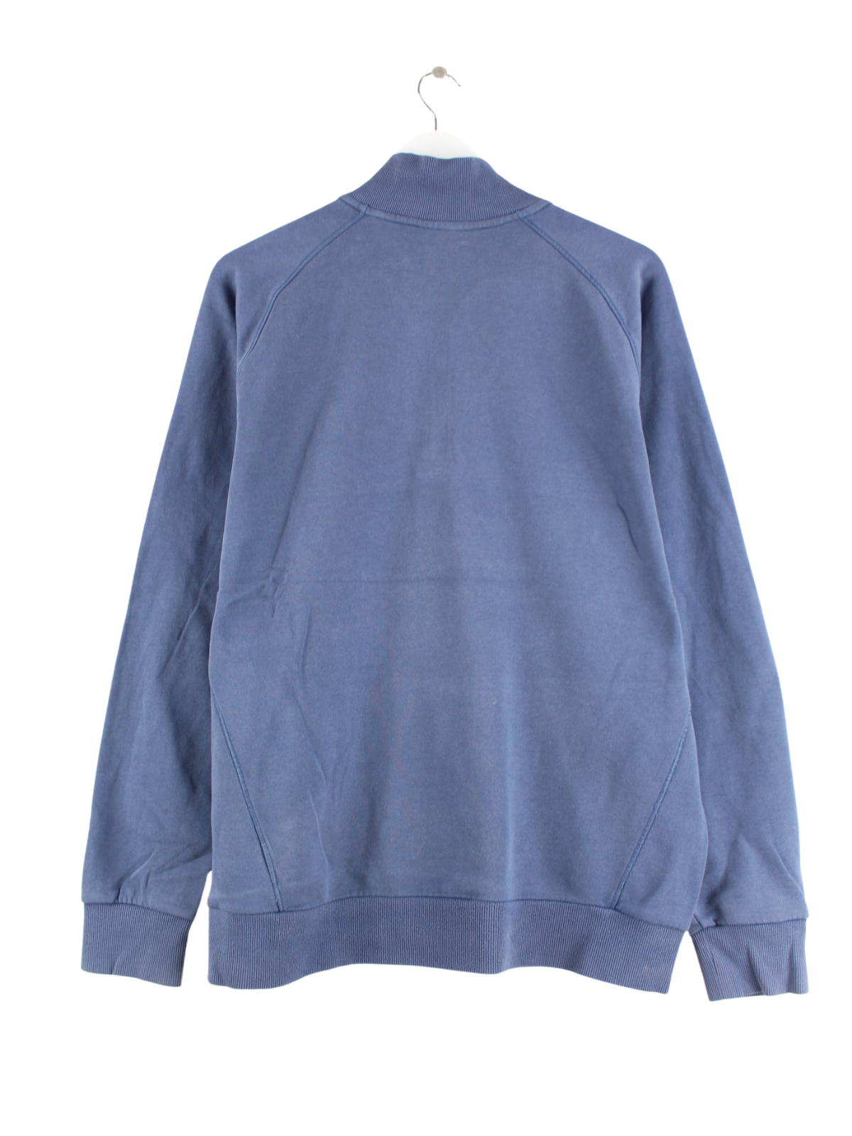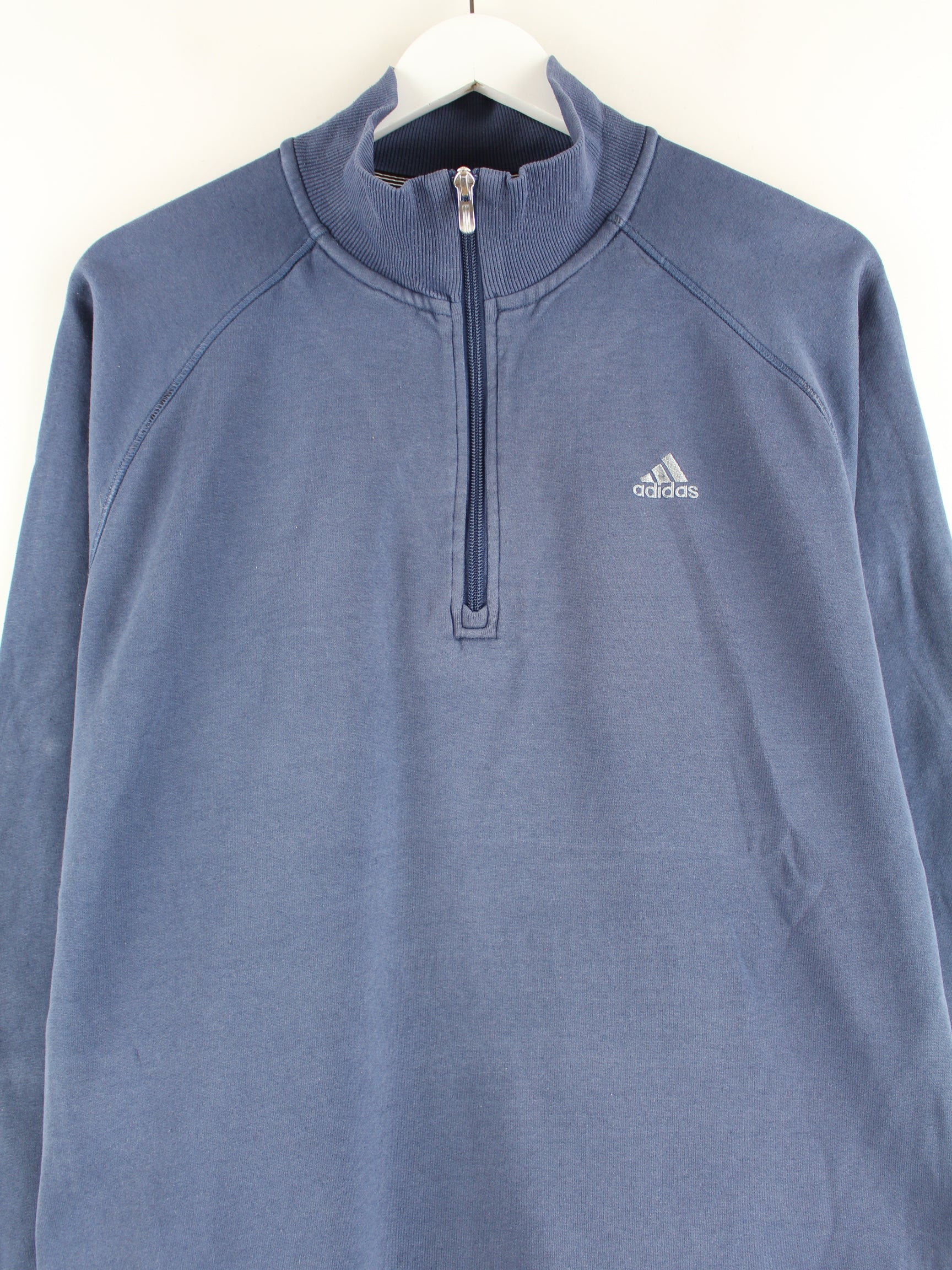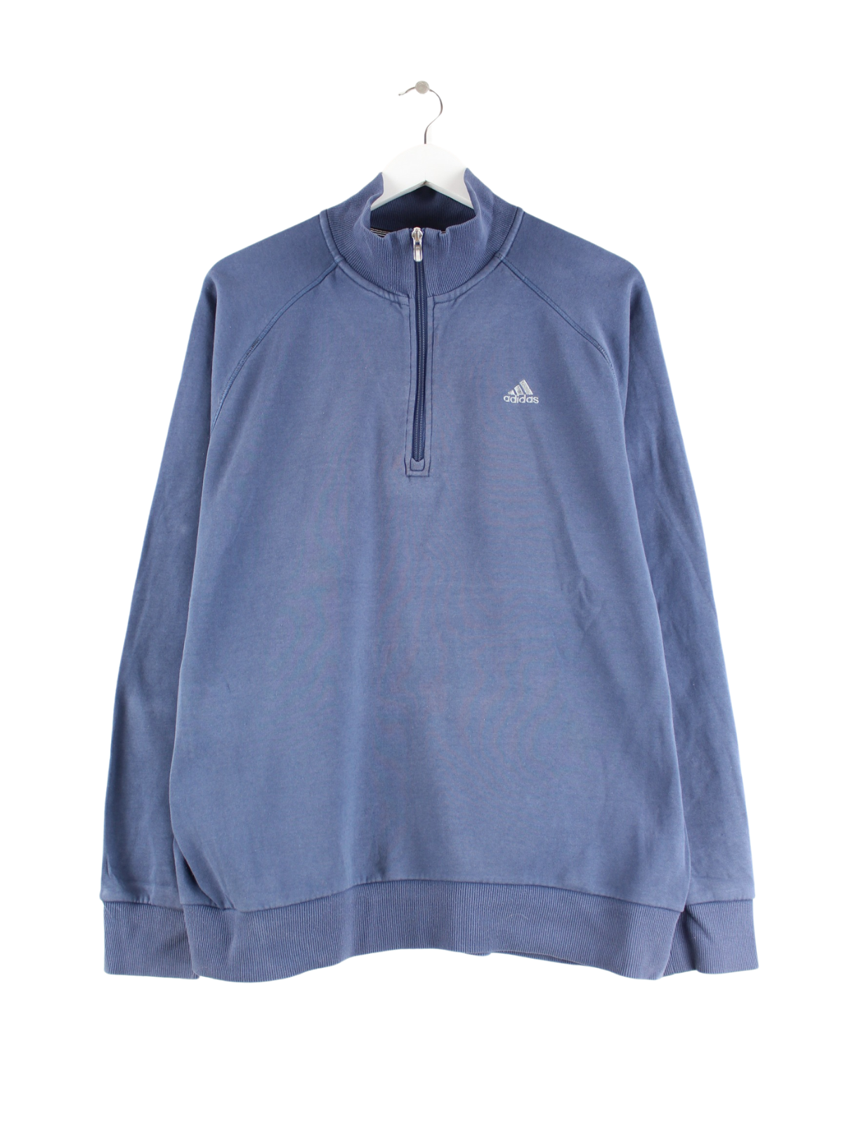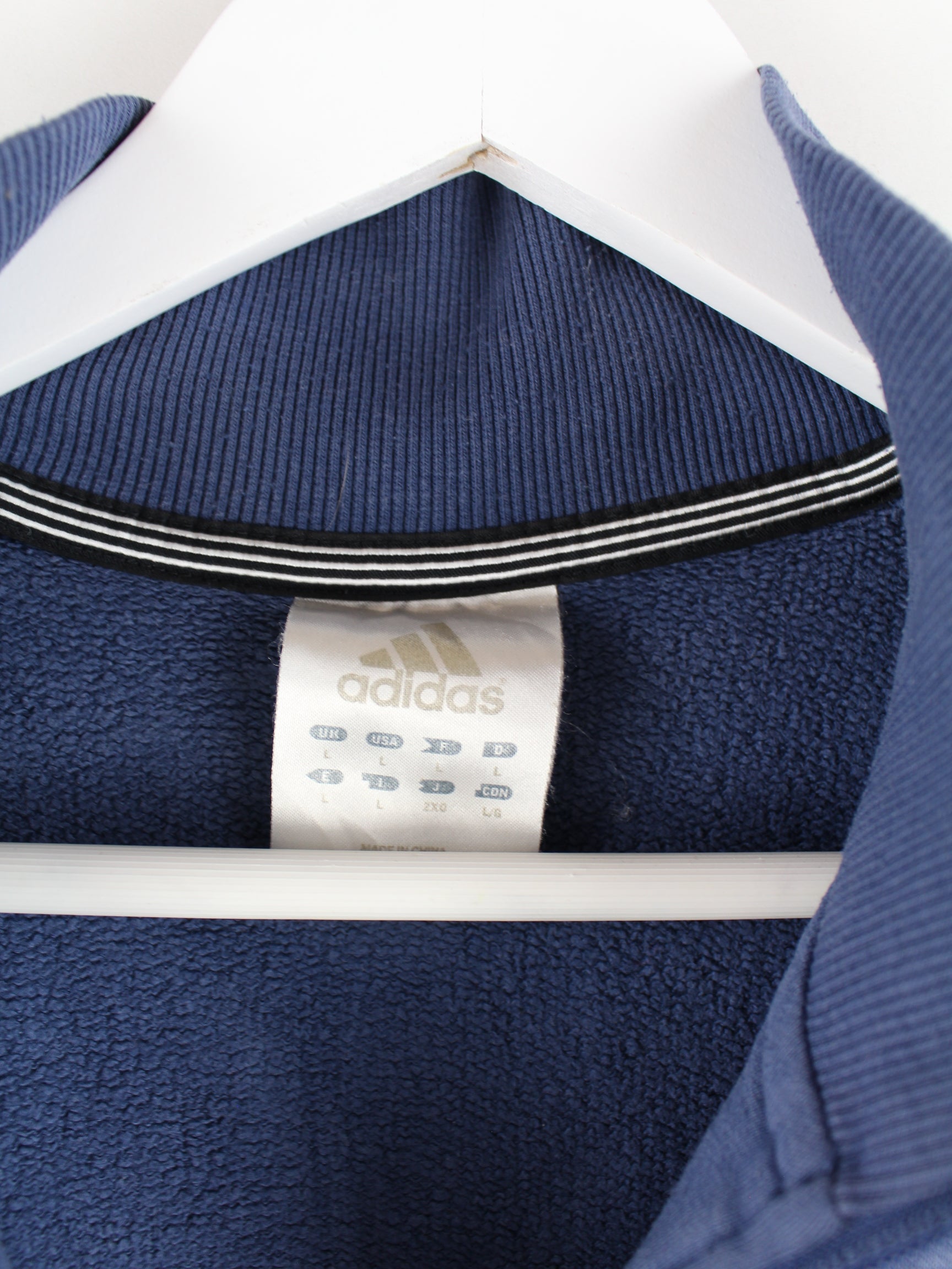 Blaue Sweatjacke mit half Zip der Brand Adidas aus Anfang der 2000'er in Größe L. Sie ist aus einer Baumwollmischung gemacht und in gutem Zustand bei uns zu bekommen.