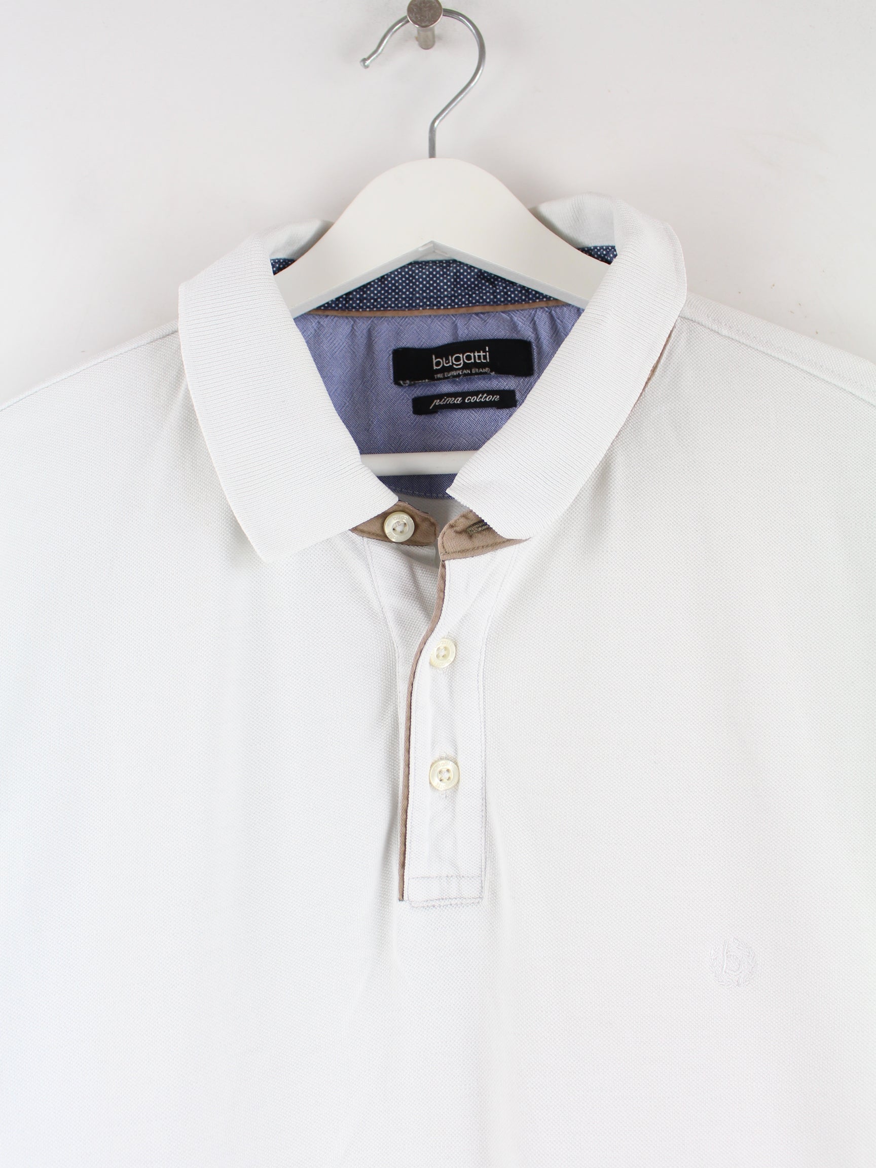 Poloshirt vom Label Bugatti in Größe XXL. Es ist aus Baumwolle gefertigt und in Weiß in Stock.