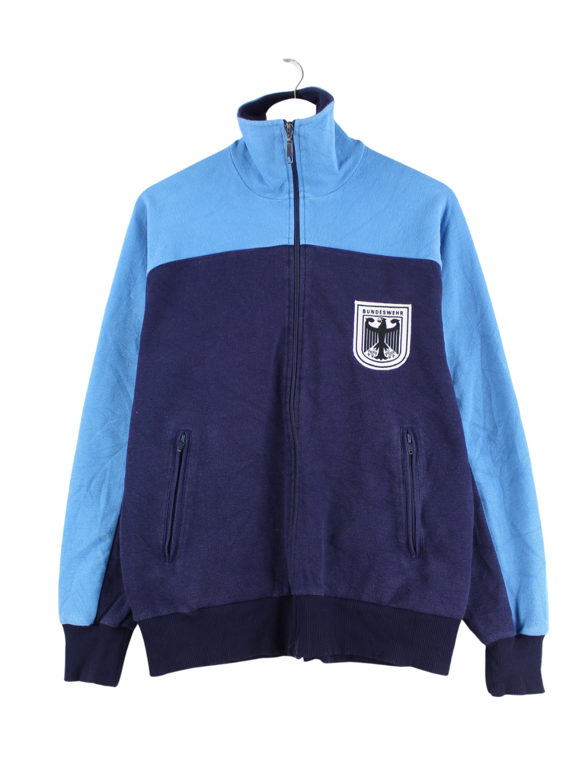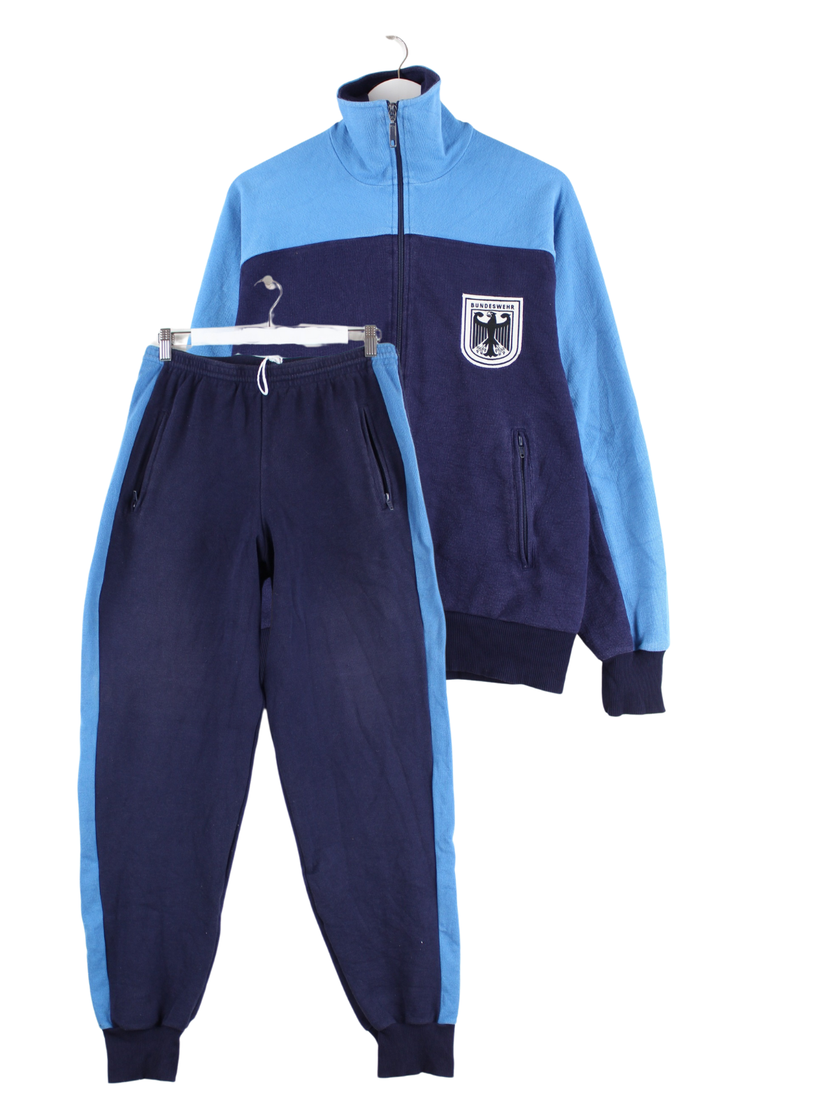 Trainingsanzug der Marke Bundeswehr in Größe M. Er ist aus einer Baumwollmischung produziert und in Blau in Stock.