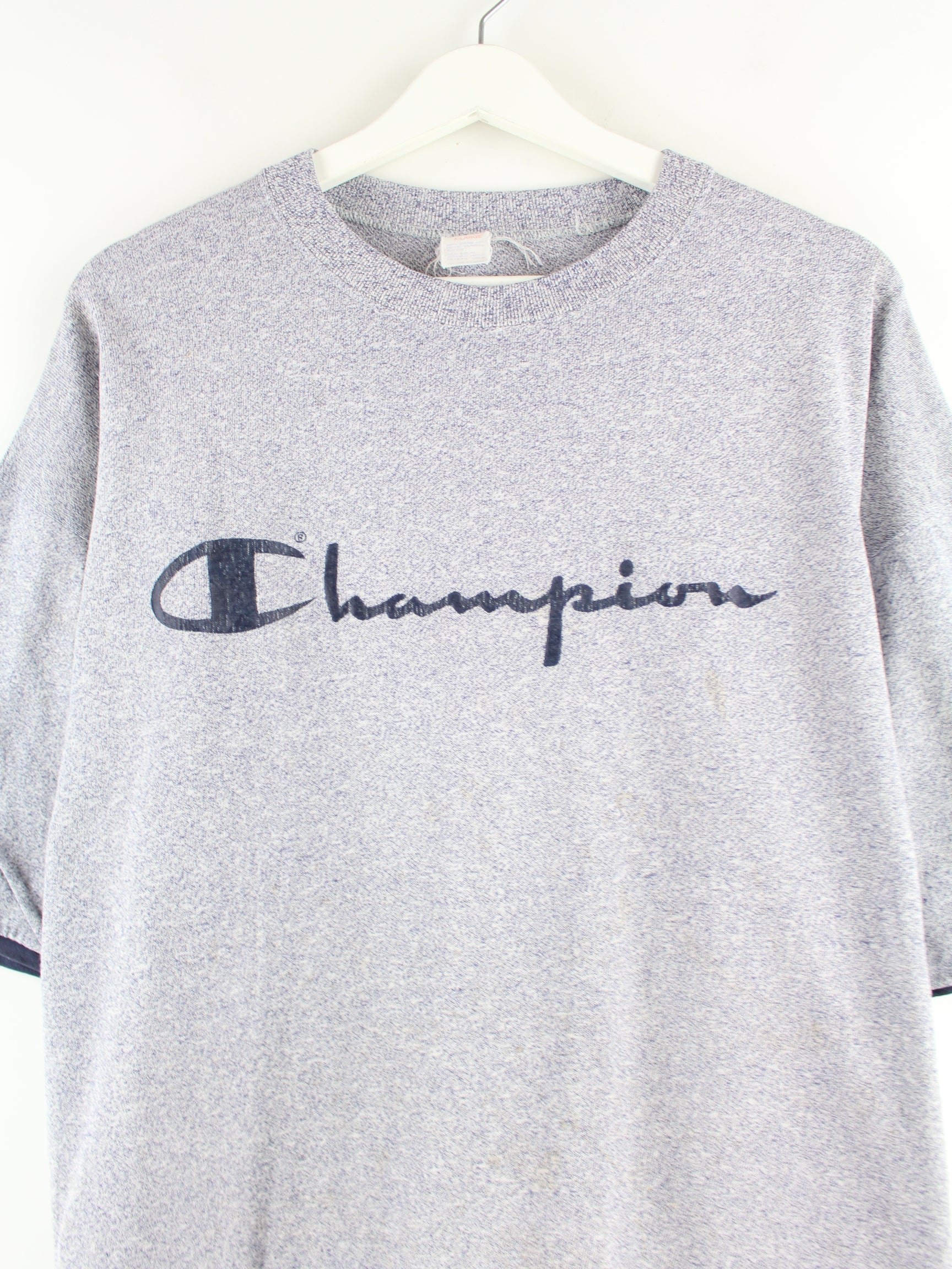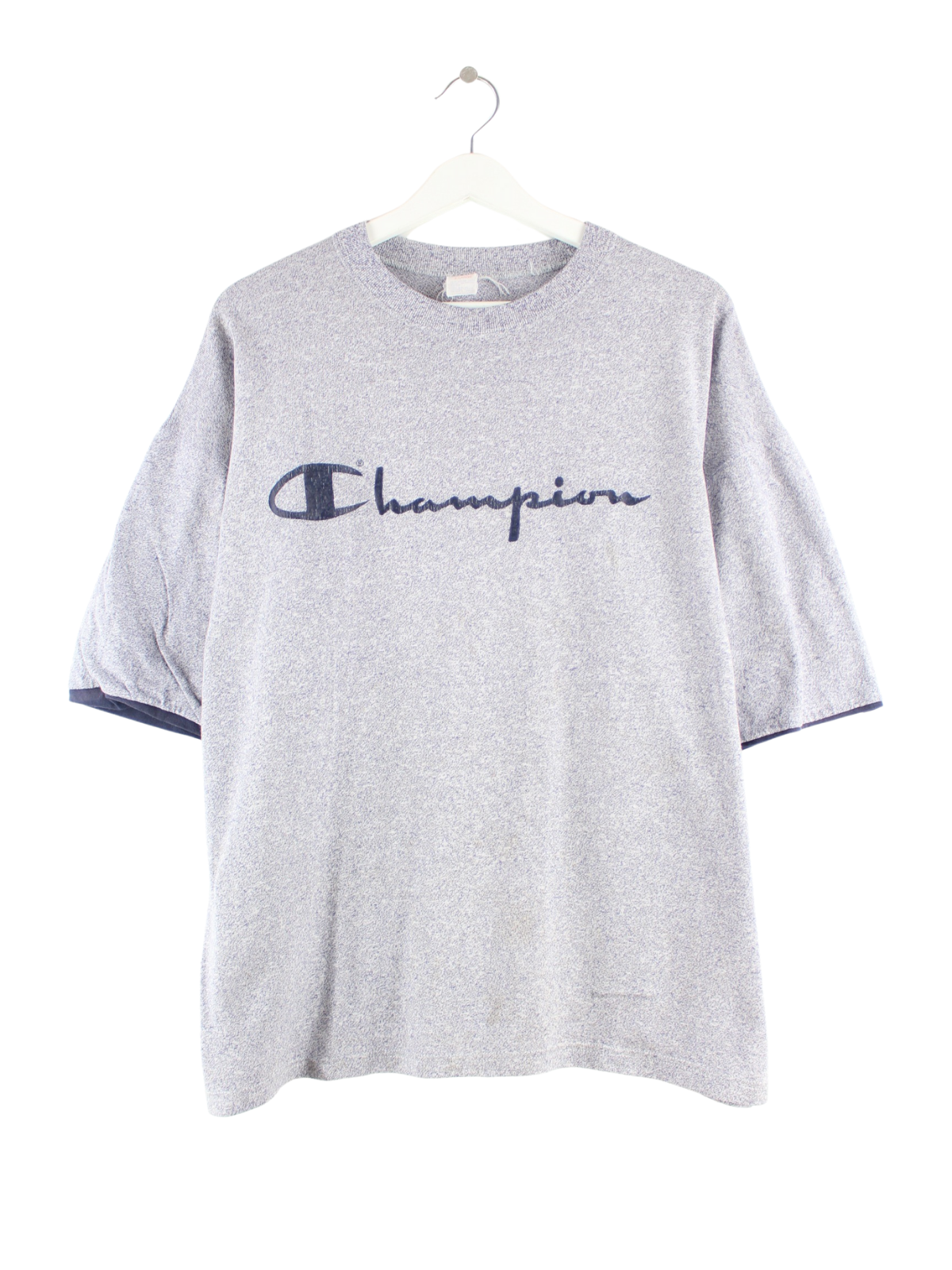 T-Shirt aus dem Hause Champion in Größe XL aus Anfang der 2000'er. Es ist aus einer Baumwollmischung angefertigt und in Grau vorrätig. Mit seltenem y2k Print.
