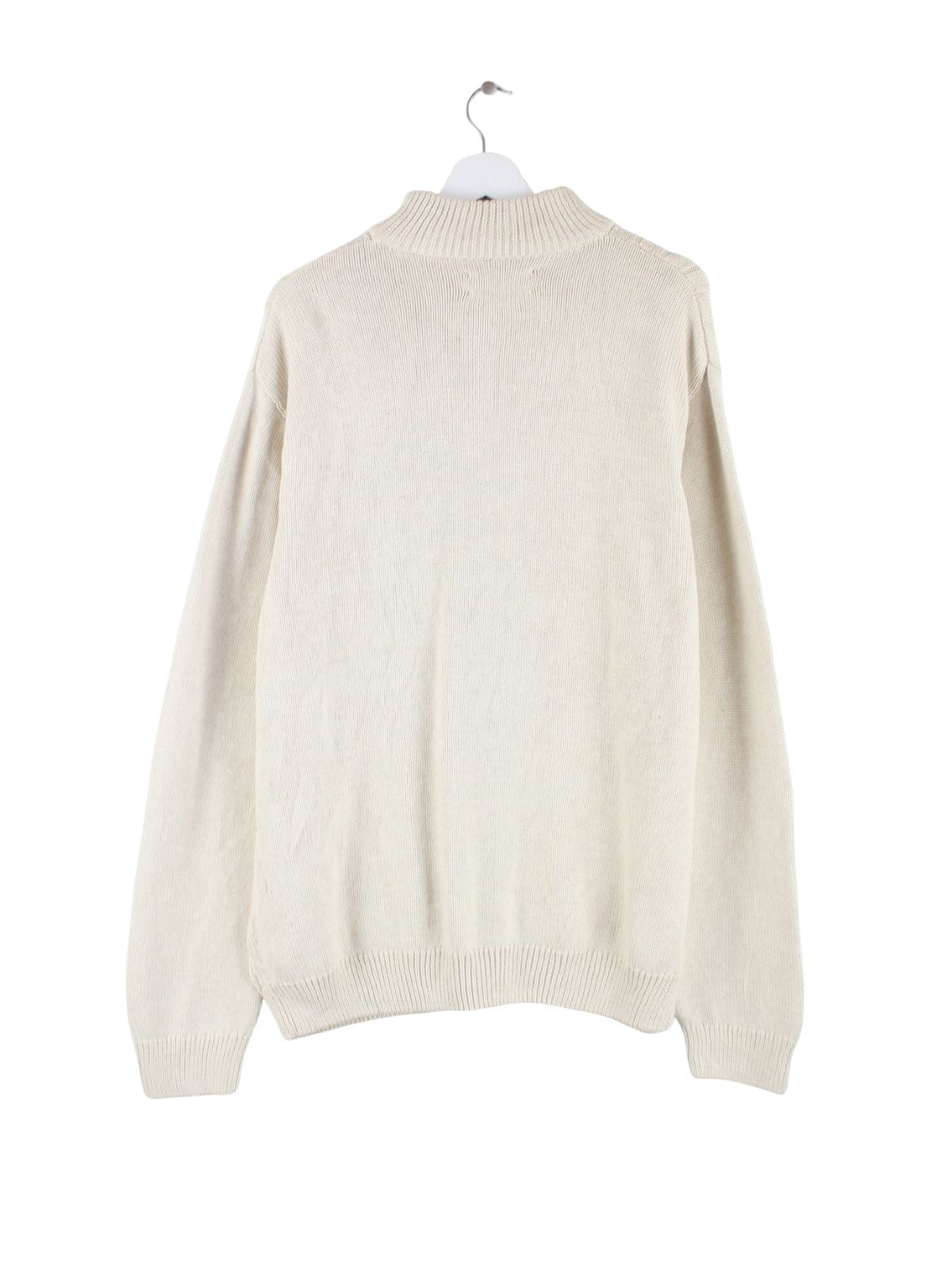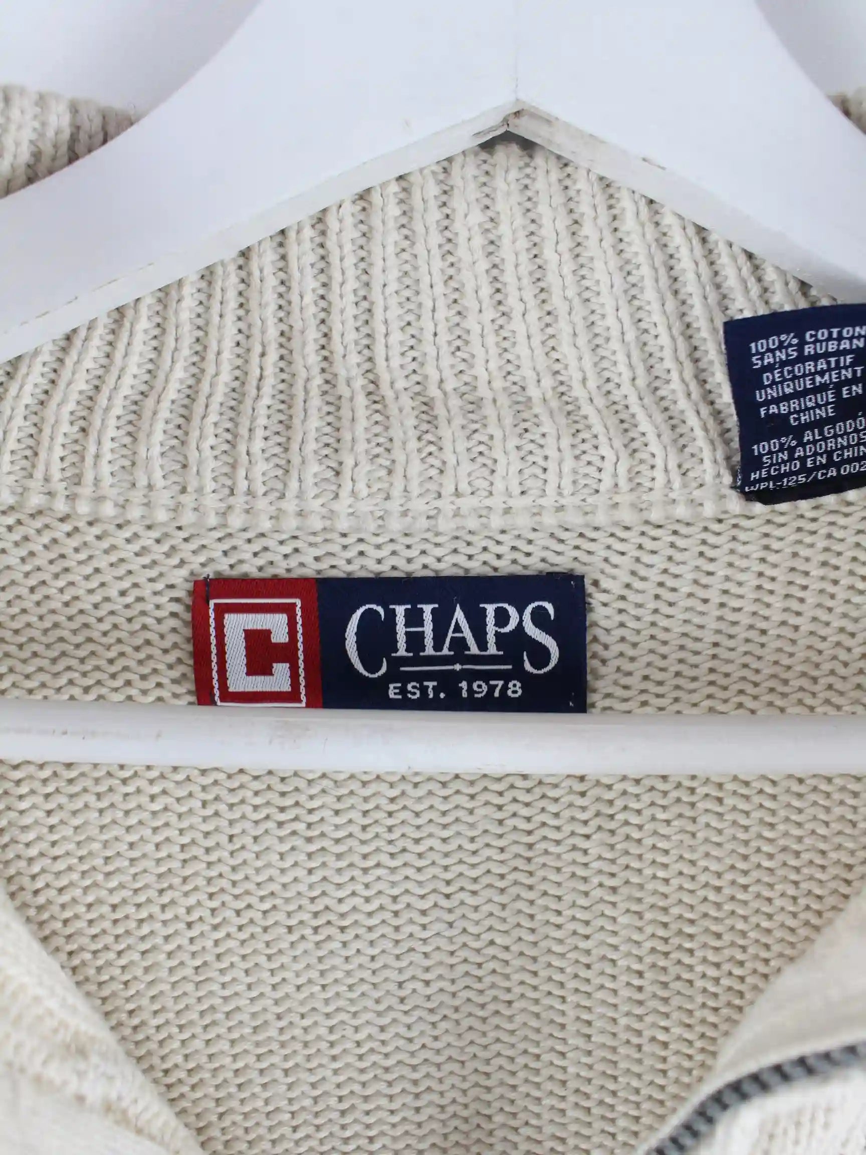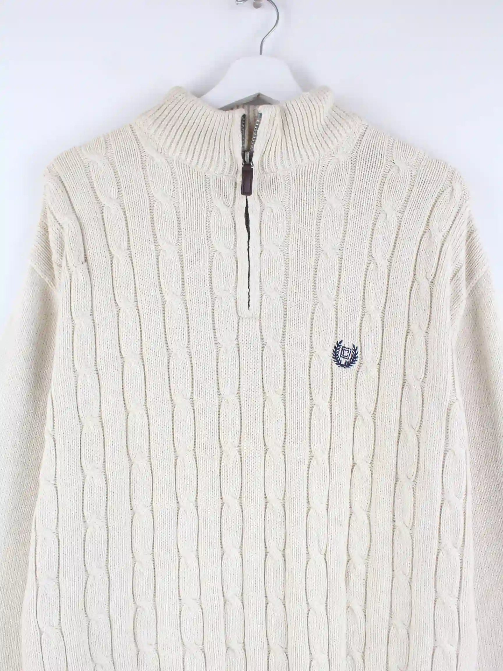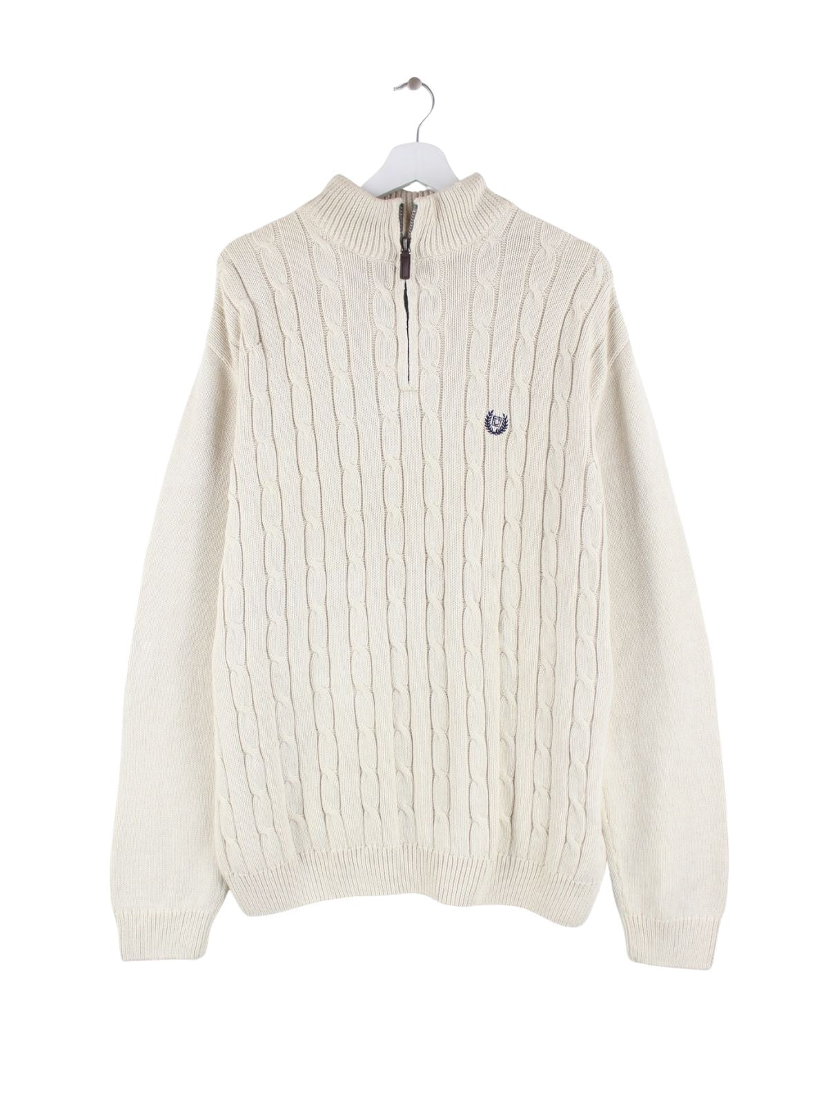 Pullover aus dem Hause Chaps by Ralph Lauren mit halbem Reißverschluß in Größe L. Er ist aus Baumwolle gefertigt und in Beige bei uns zu bekommen.