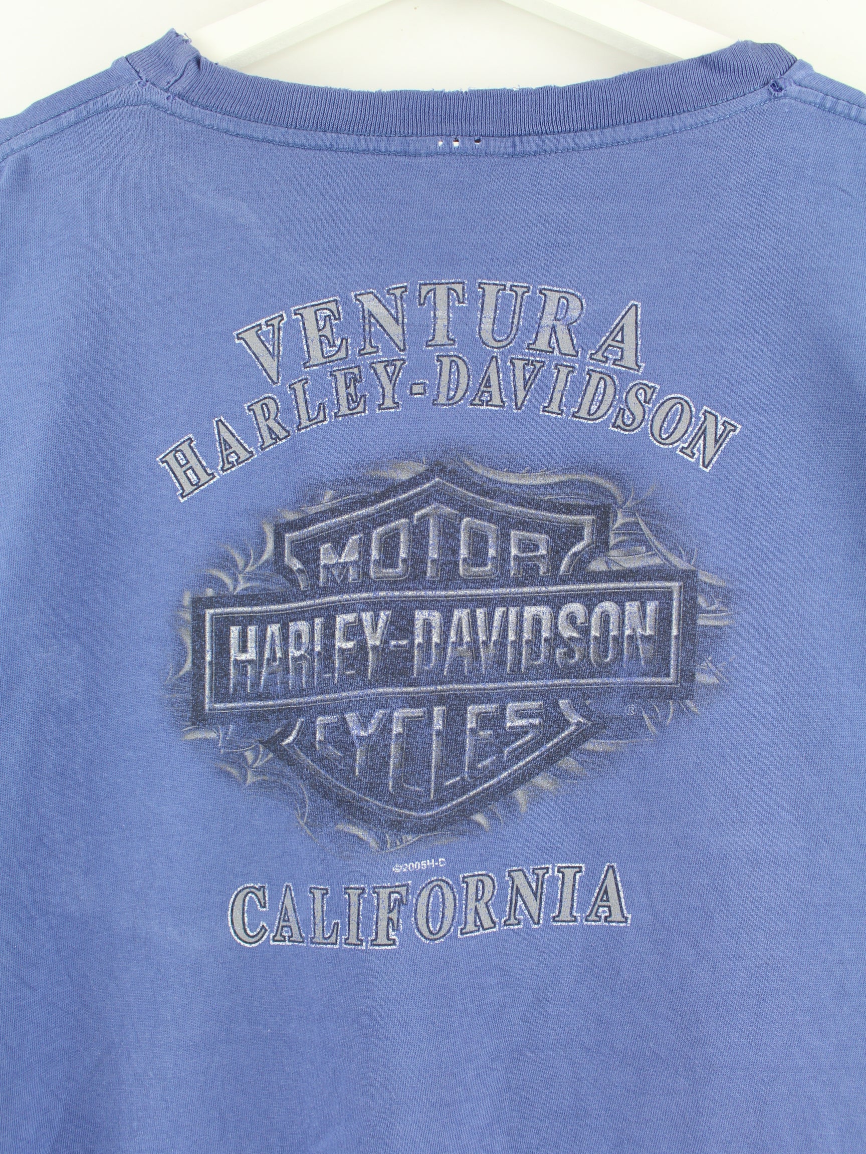 T-Shirt vom Label Harley Davidson in Größe XXL aus Anfang der 2000'er. Es ist aus Baumwolle gefertigt und in Blau bei uns zu bekommen. Mit schönem California Print.