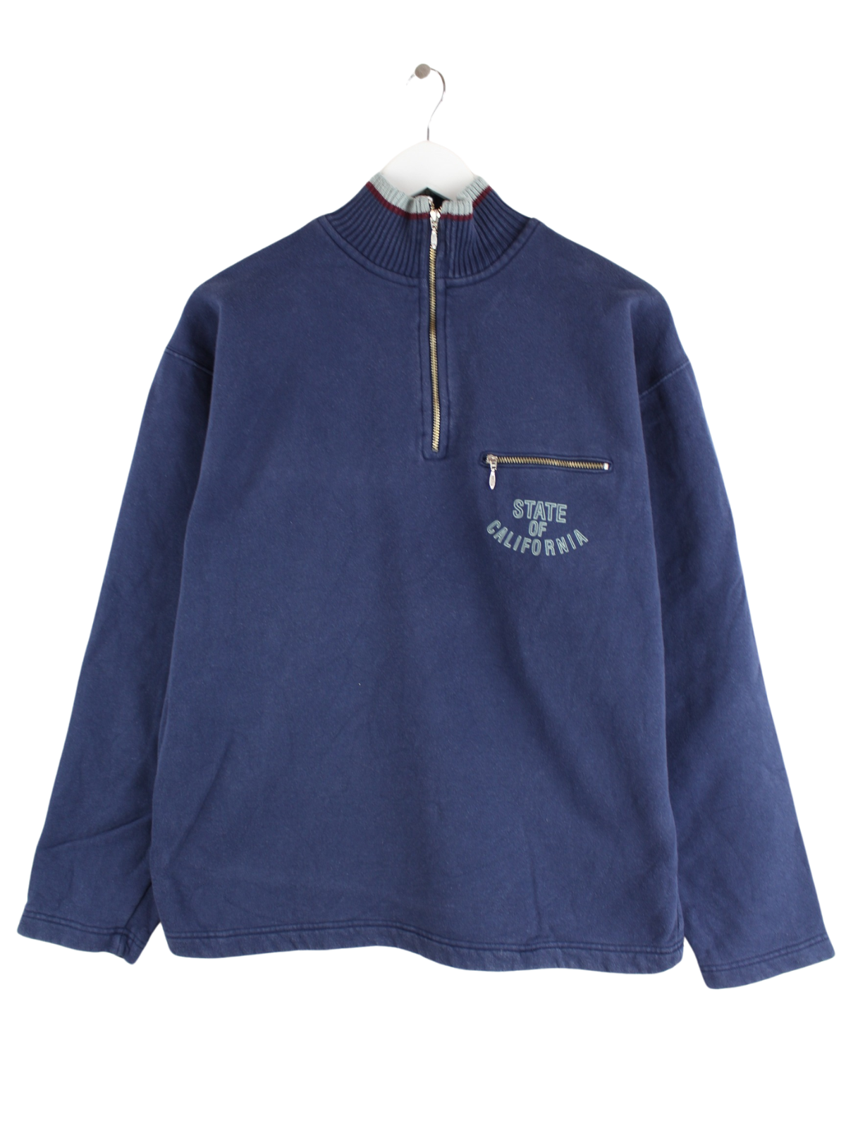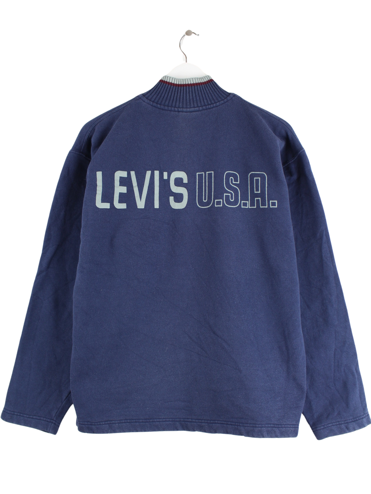 Blauer Sweater mit halbem Reißverschluß aus dem Hause Levi's in Größe M. Er ist aus einer Baumwollmischung produziert und in sehr gutem Zustand vorrätig. Mit schickem USA Print.