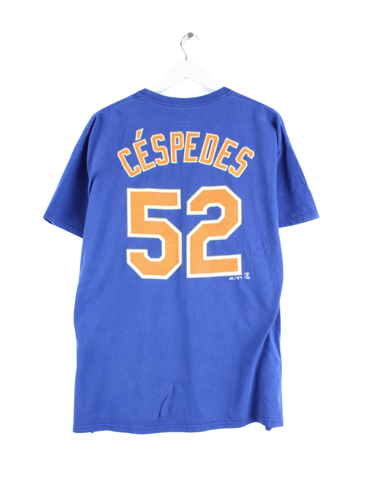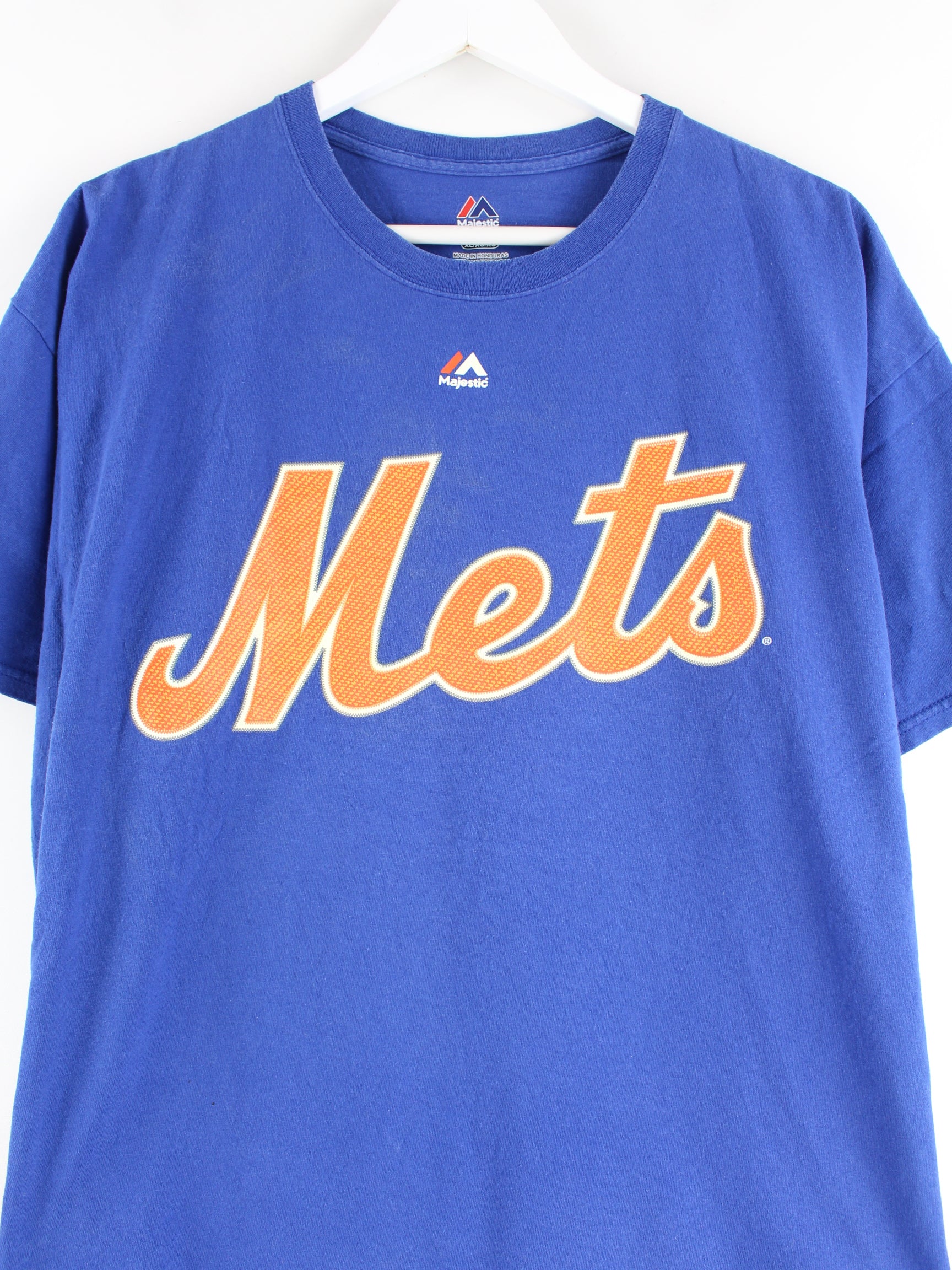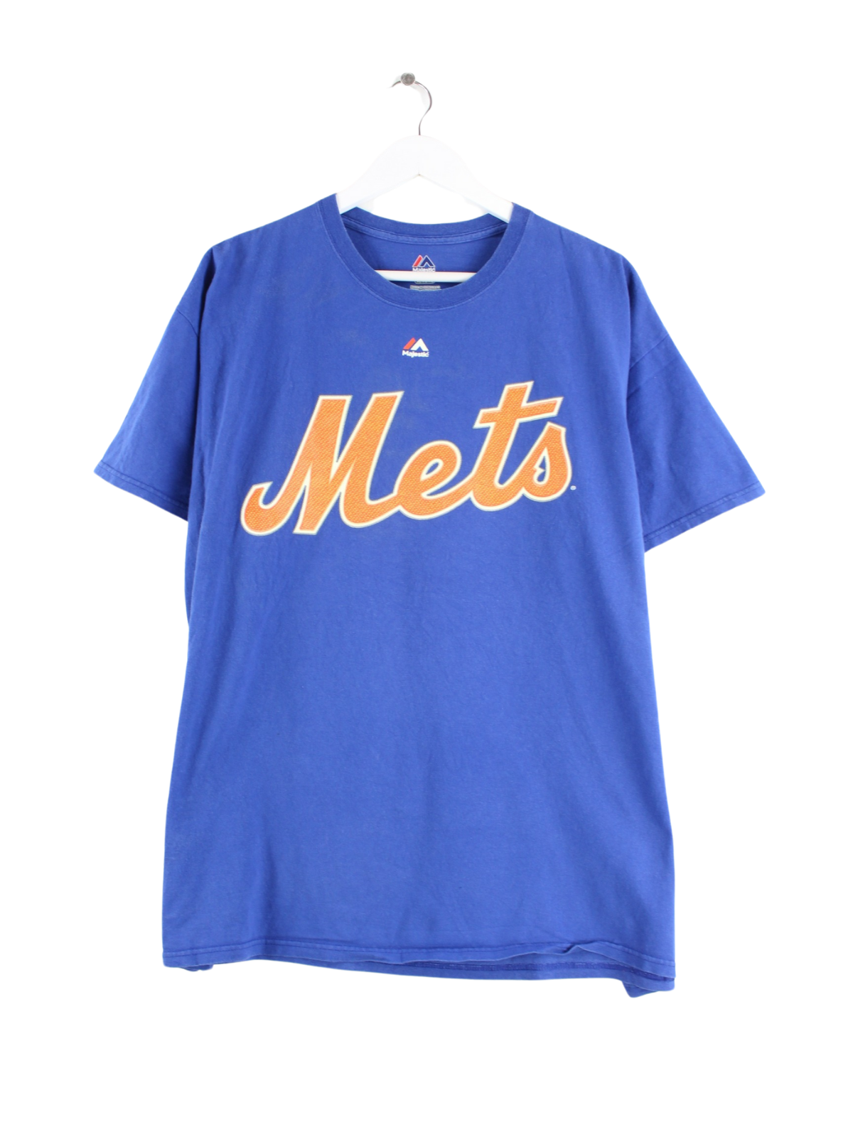 Blaues T-Shirt des Labels Majestic in Größe XL. Es ist aus Baumwolle angefertigt und in sehr gutem Zustand zu haben. Mit tollem Mets Print.