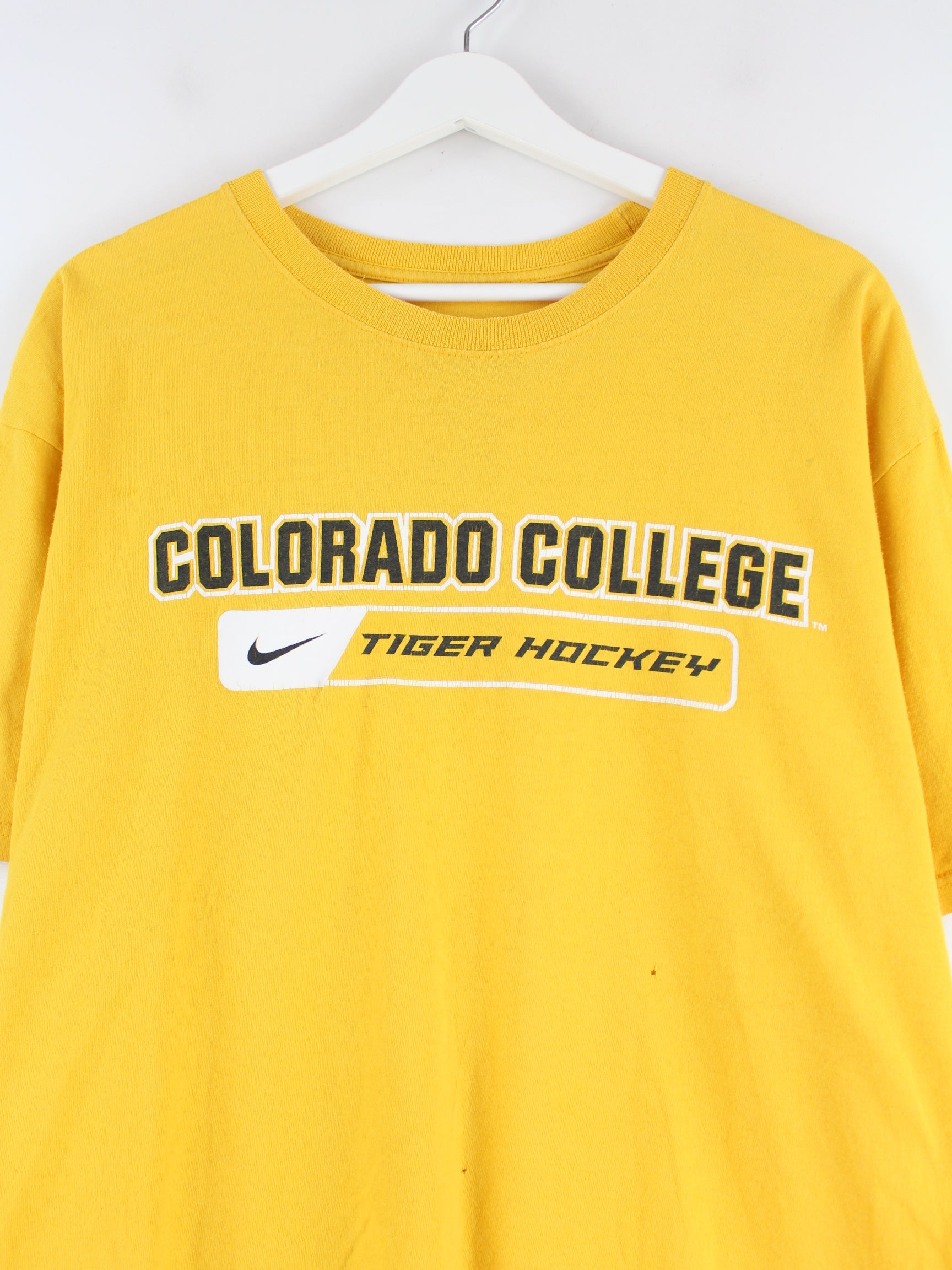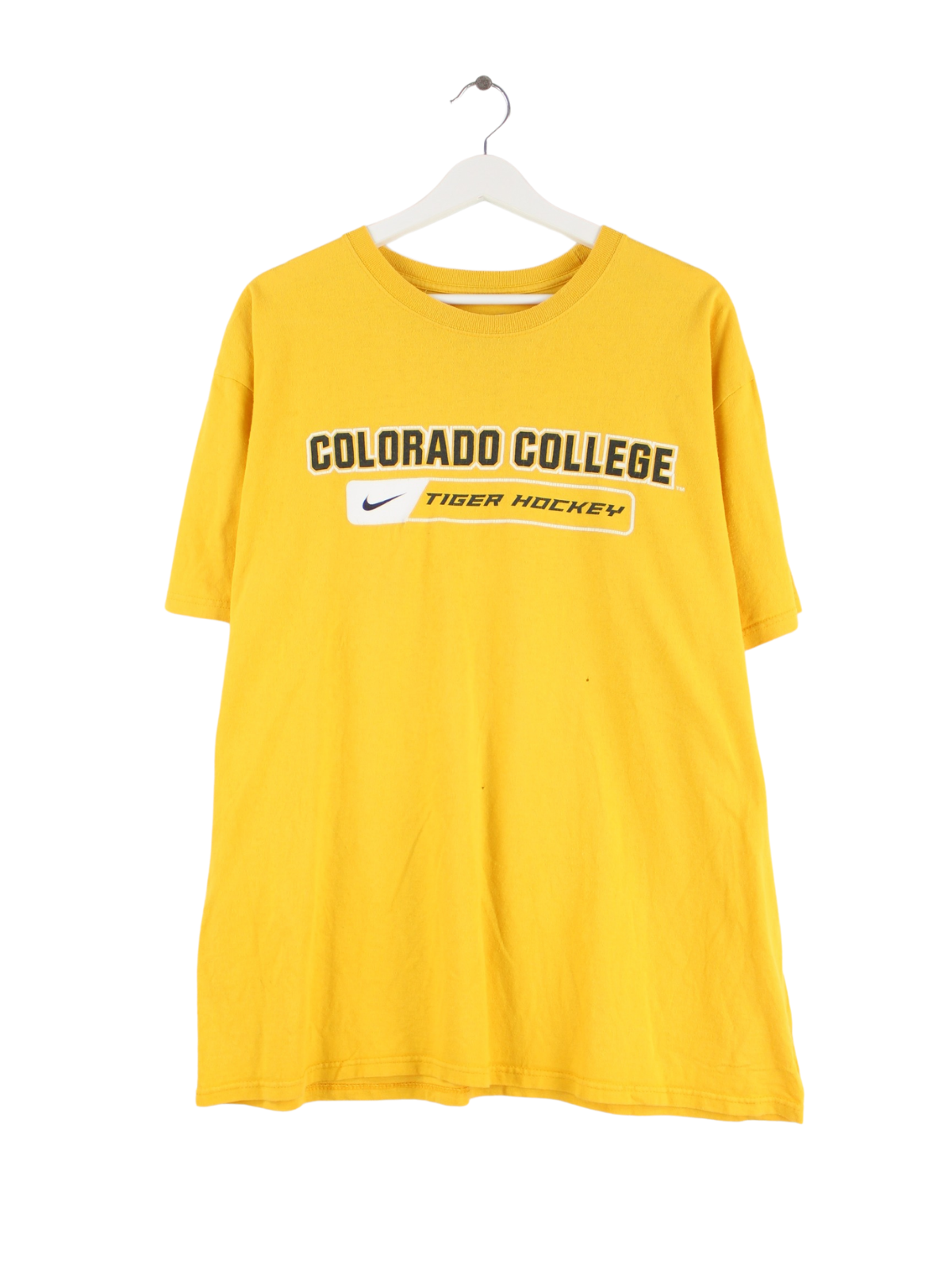 T-Shirt der Brand Nike in Größe L. Es ist aus einer Baumwollmischung angefertigt und in Gelb lieferbar. Mit chiquem Hockey Print.