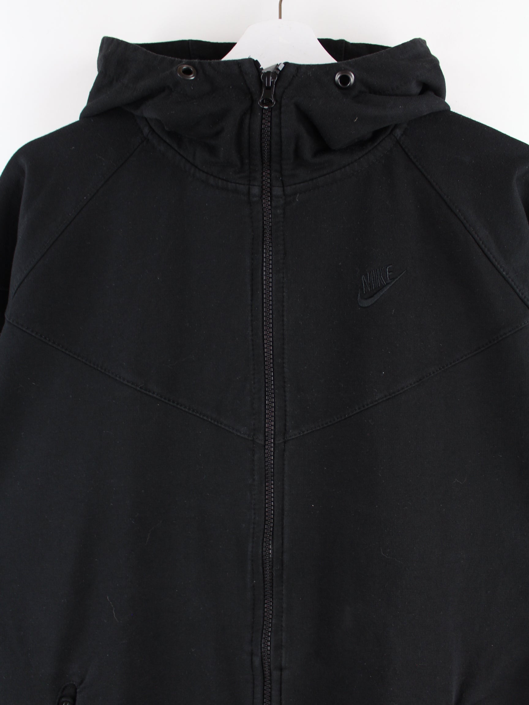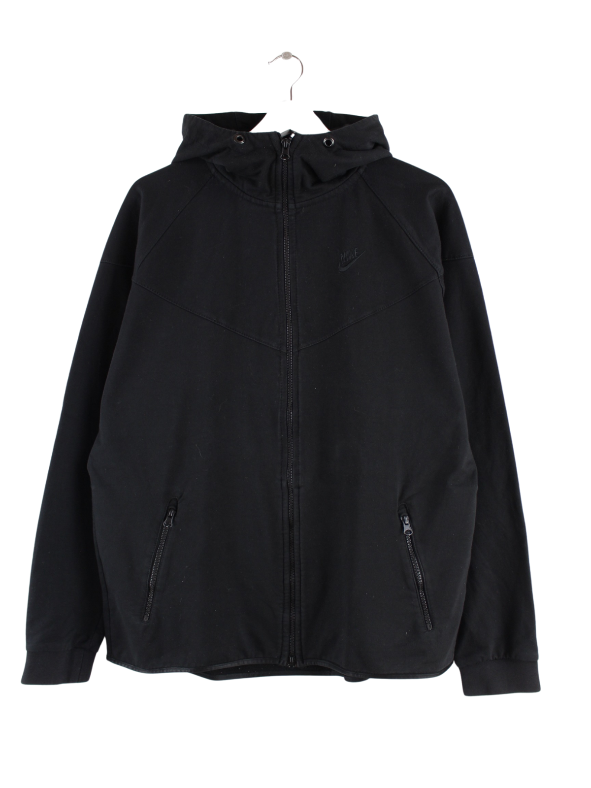 Schwarzer Hoodie mit Reißverschluß aus dem Hause Nike in Größe L. Er ist aus einer Baumwollmischung hergestellt und in sehr gutem Zustand auf Lager.