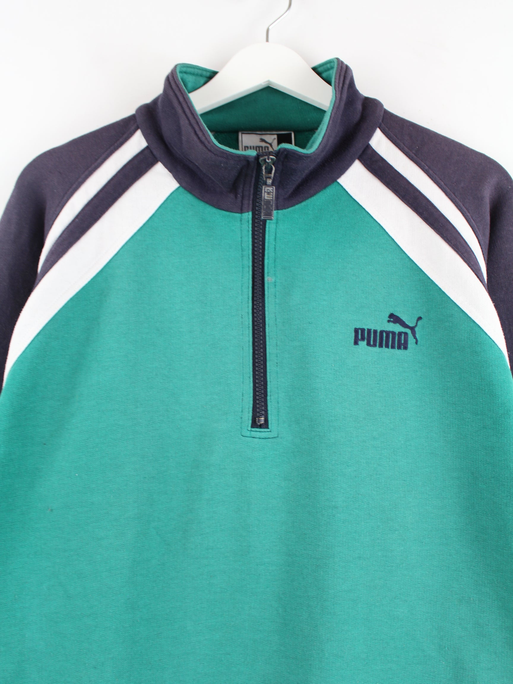 Grüner Sweater mit Stick und halbem Reißverschluß vom Brand Puma in Größe M. Er ist aus einer Baumwollmischung gemacht und in gutem Zustand bei uns zu bekommen.