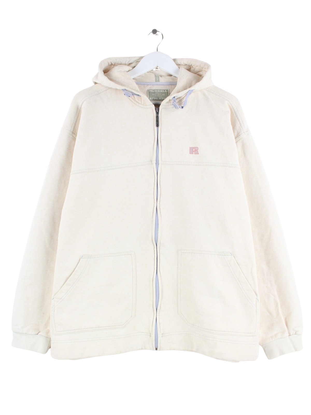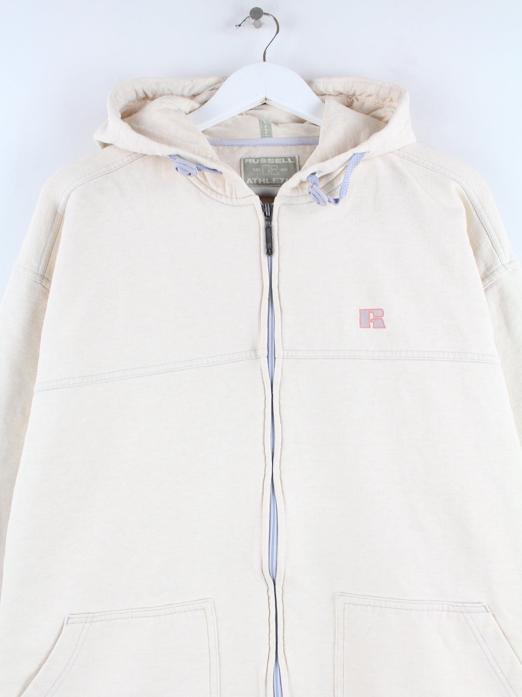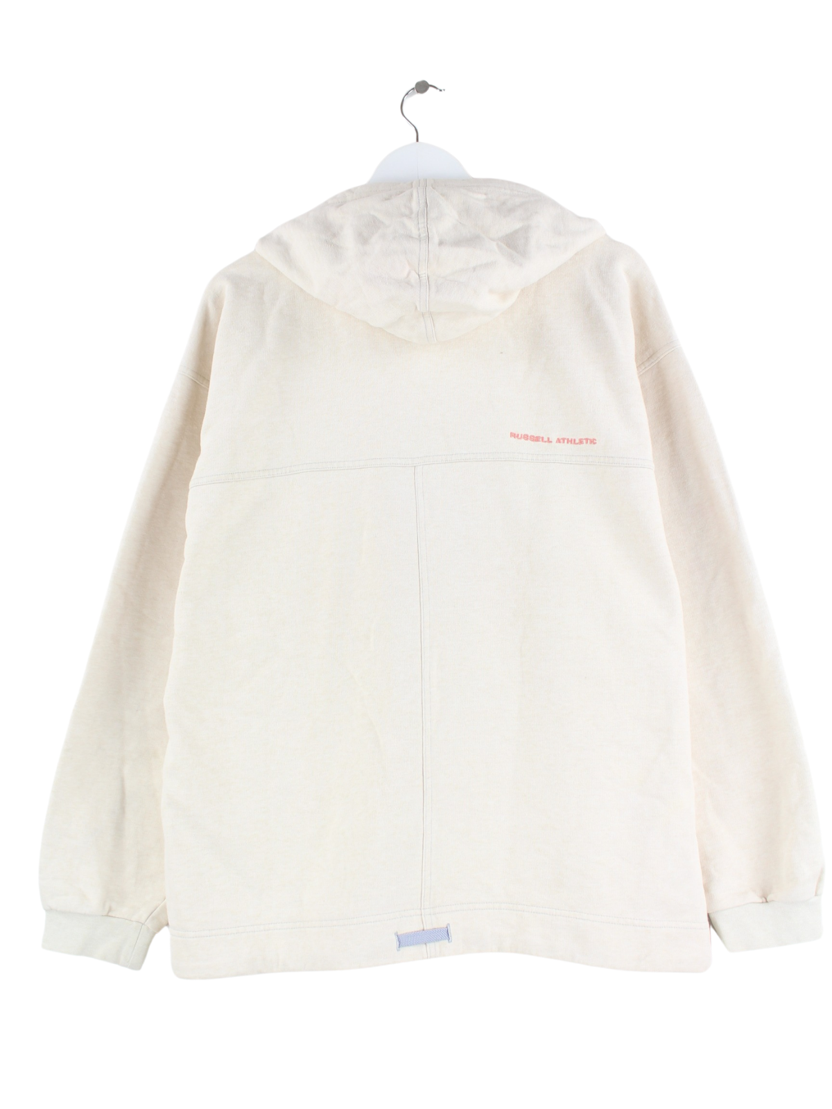 Beigefarbener Hoodie mit langem Reißverschluß vom Label Russell Athletic in Größe L. Er ist aus einer Baumwollmischung hergestellt und in gutem Zustand lieferbar.