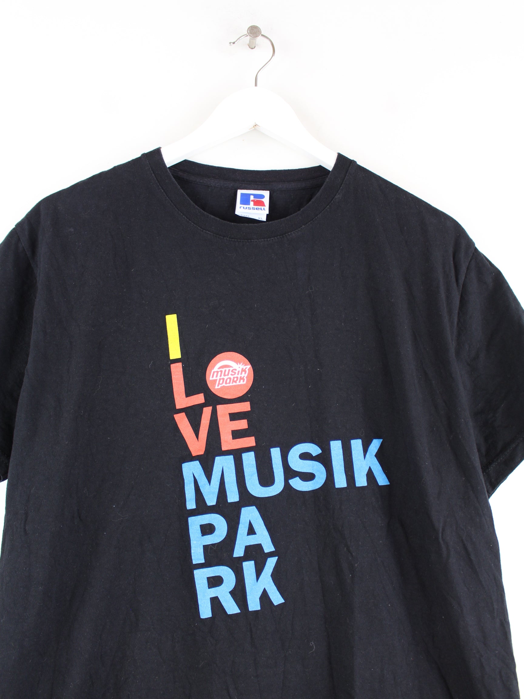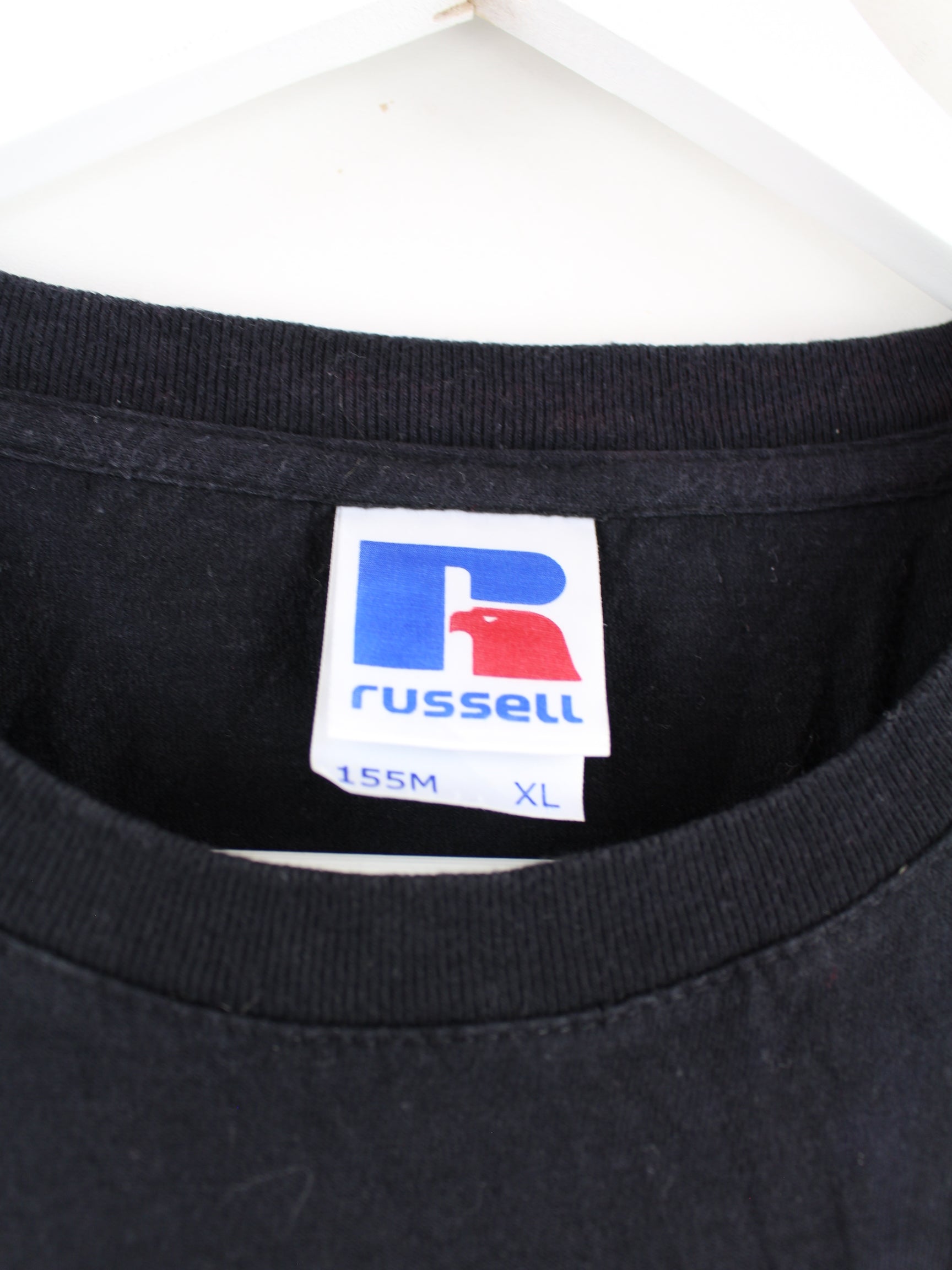 Schwarzes T-Shirt der Marke Russell Athletic in Größe XL. Es ist aus Baumwolle und in sehr gutem Zustand zu bekommen. Mit schönem Park Print.