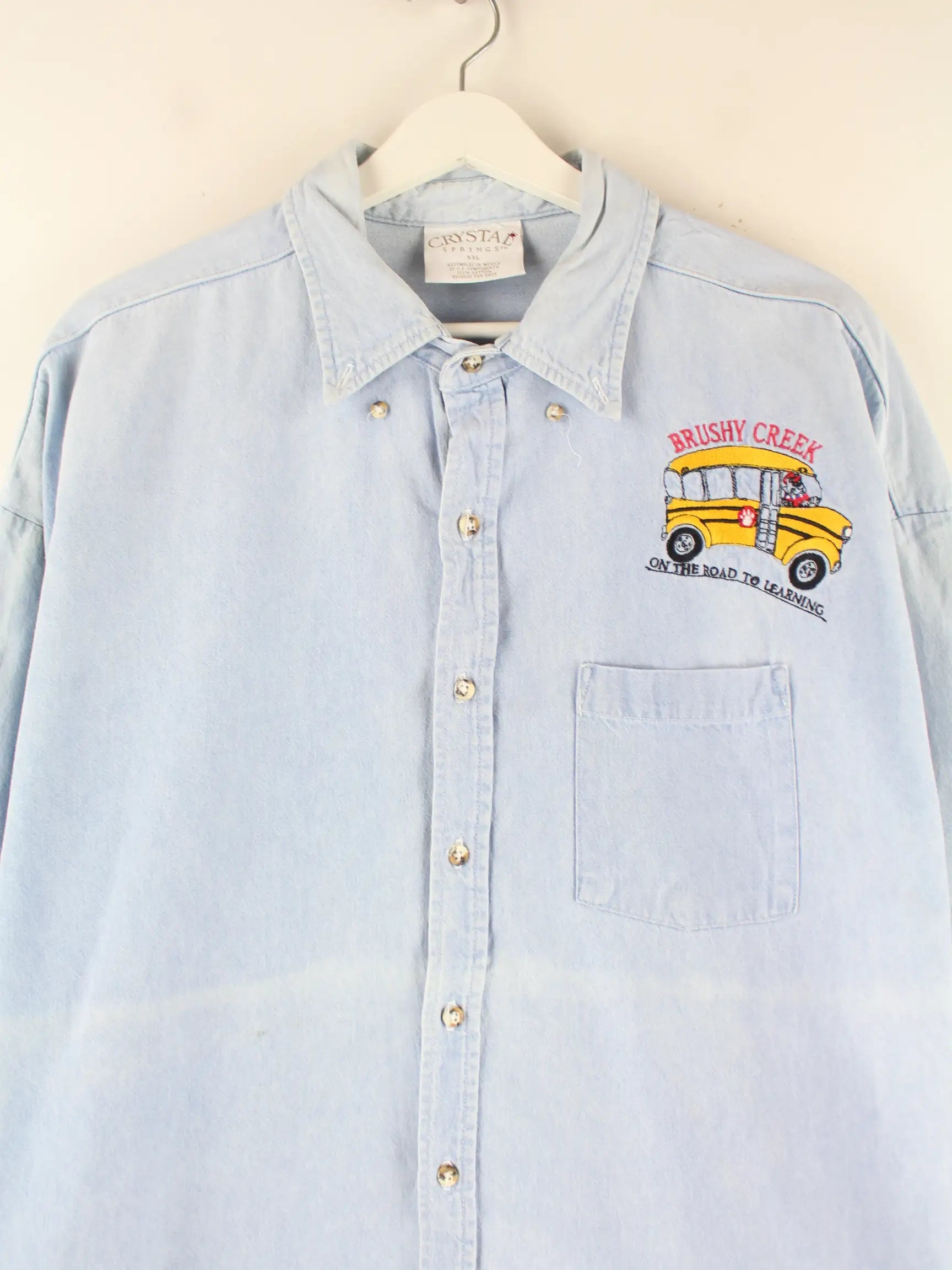 Vintage 00s School Bus Embroidered Jeans Hemd Blau XXL