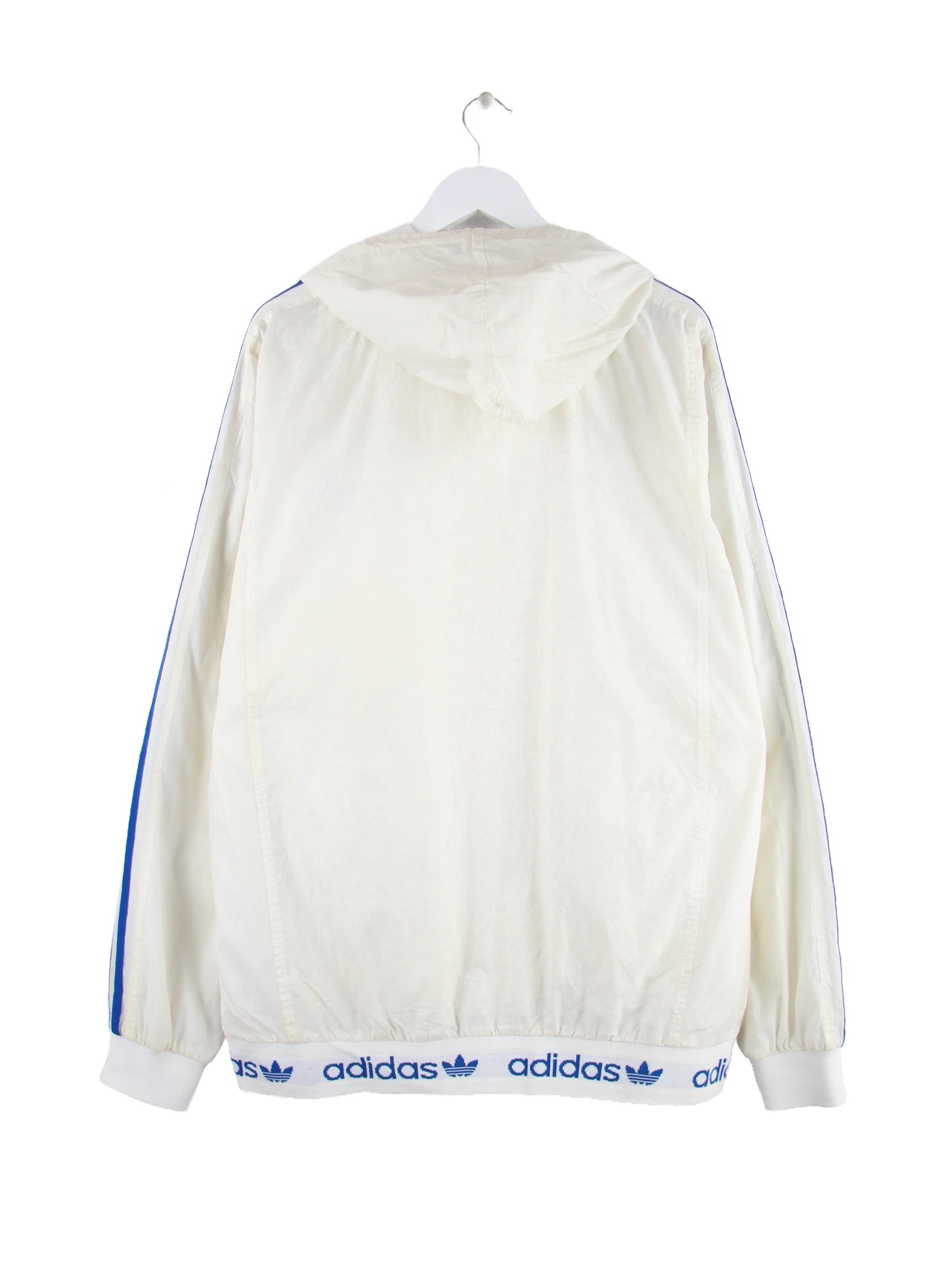 Leichte Jacke der Marke Adidas in Größe XXL. Sie ist aus Synthetik gefertigt und in Weiß bei uns vorrätig.