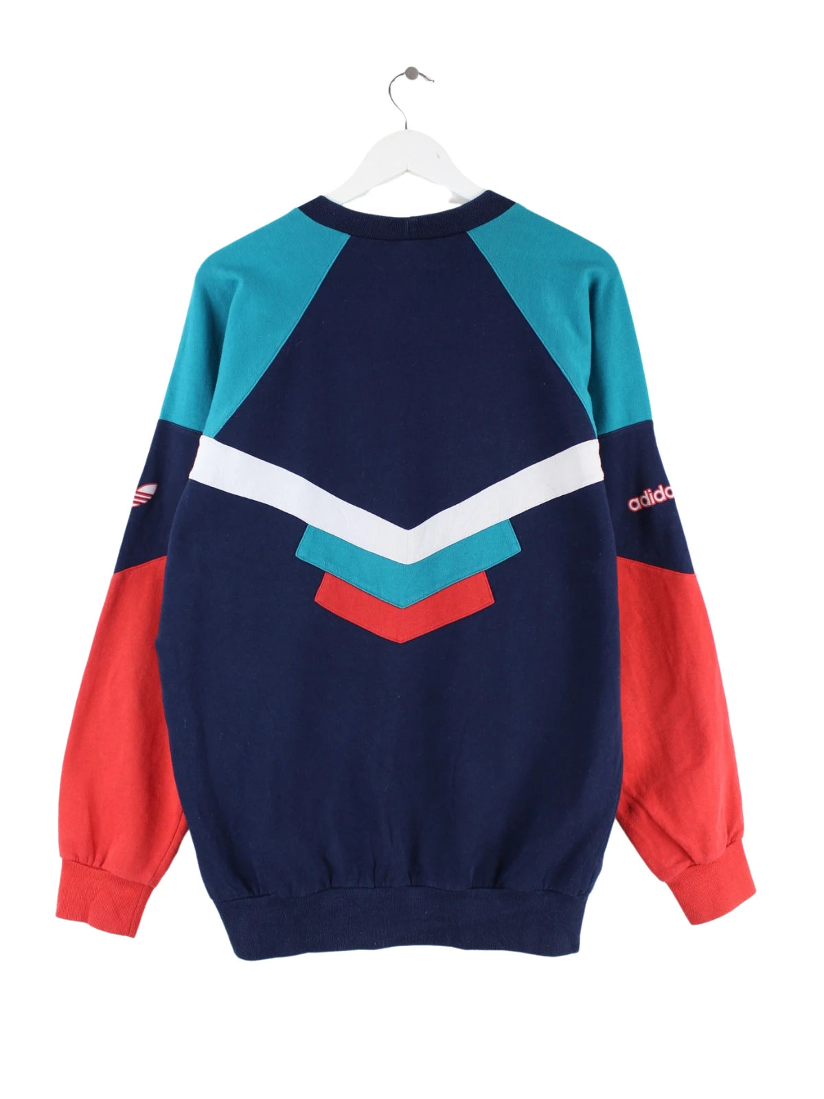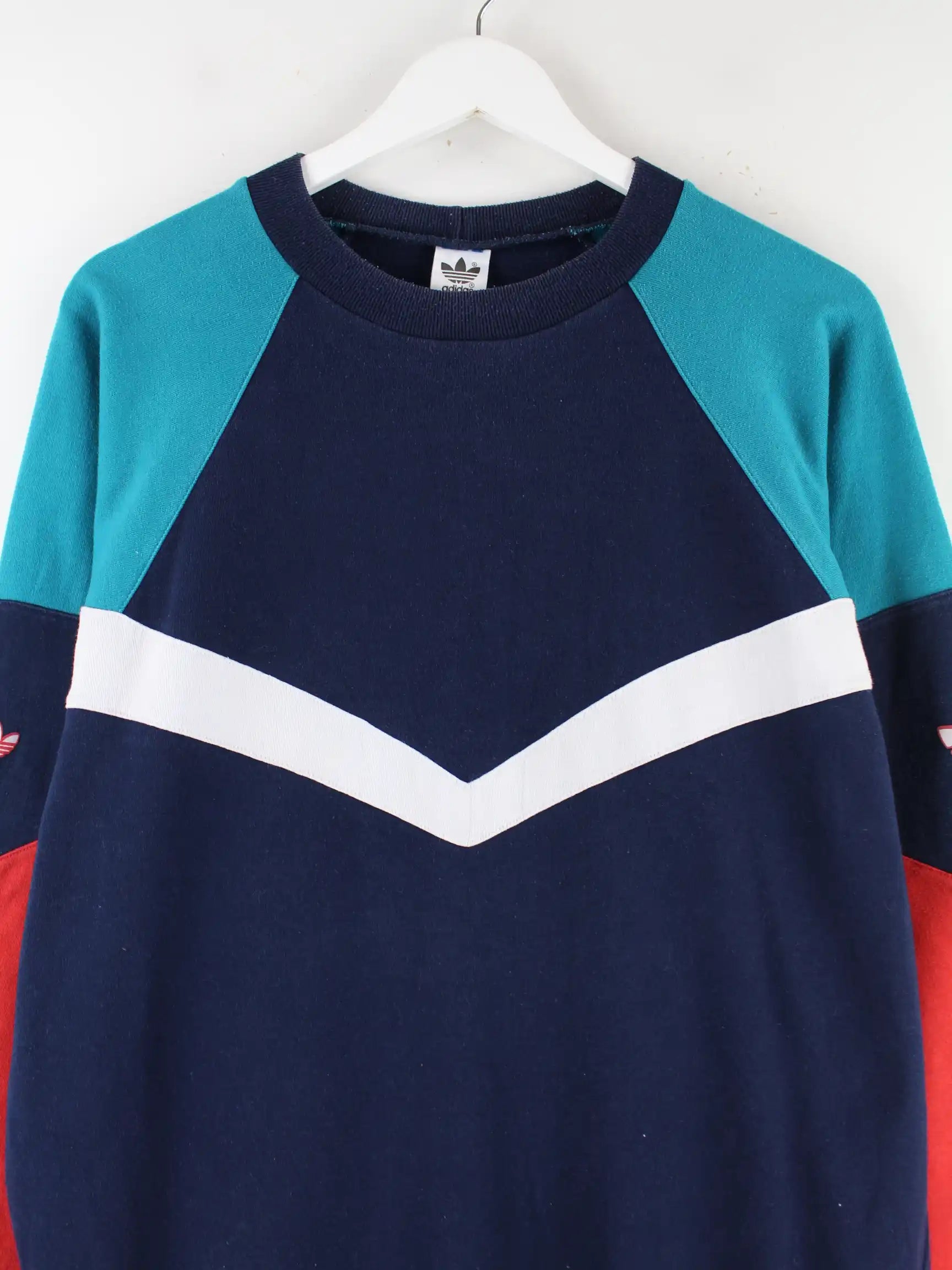 Sweater des Labels Adidas in Größe XL aus den 80'ern. Er ist aus einer Baumwollmischung gemacht und in Blau zu haben.